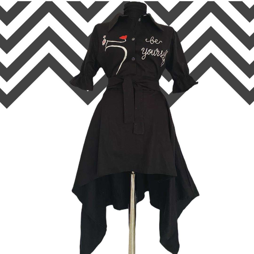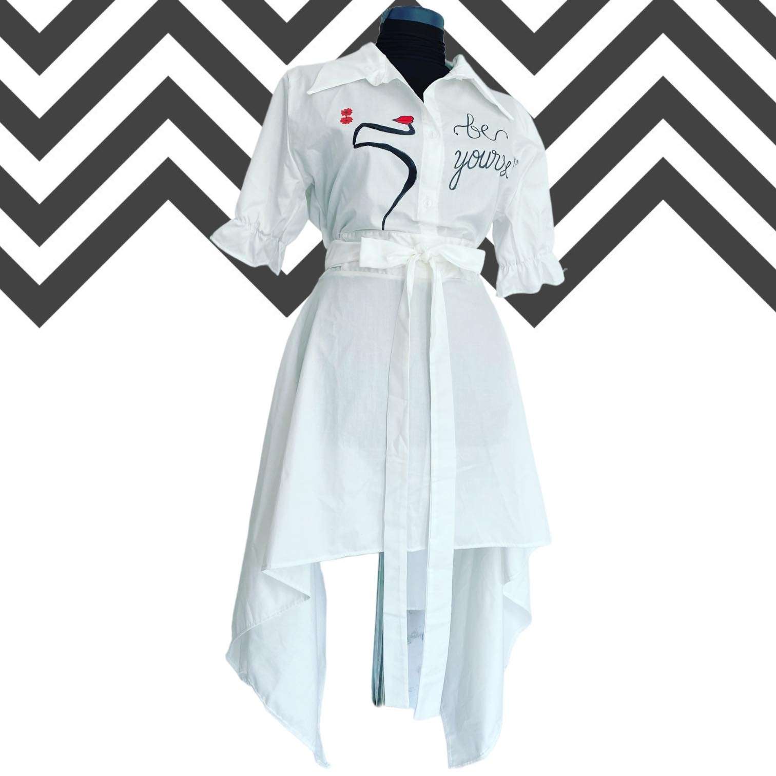Camasa are un design asimetric. Este prevazuta cu cordon in talie.