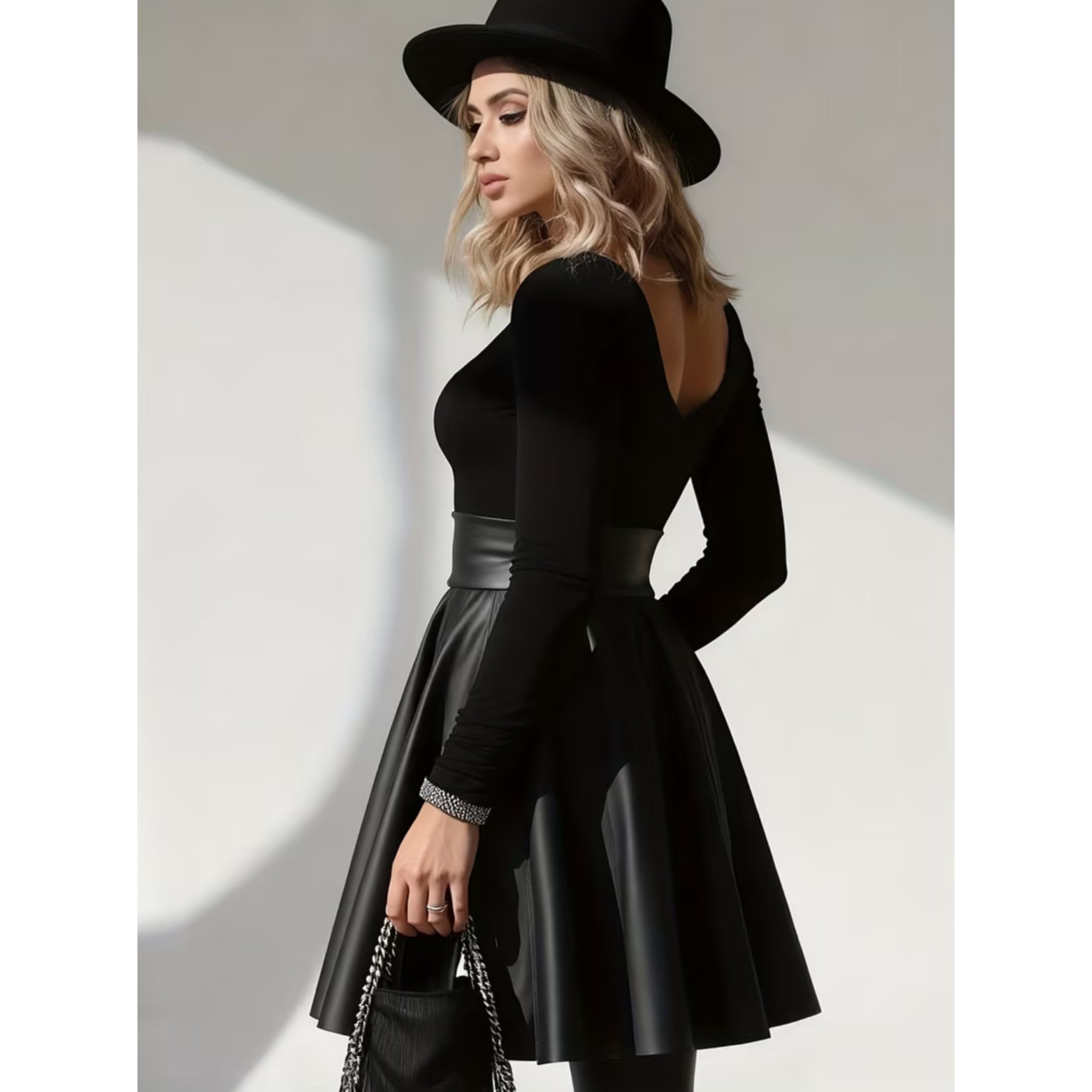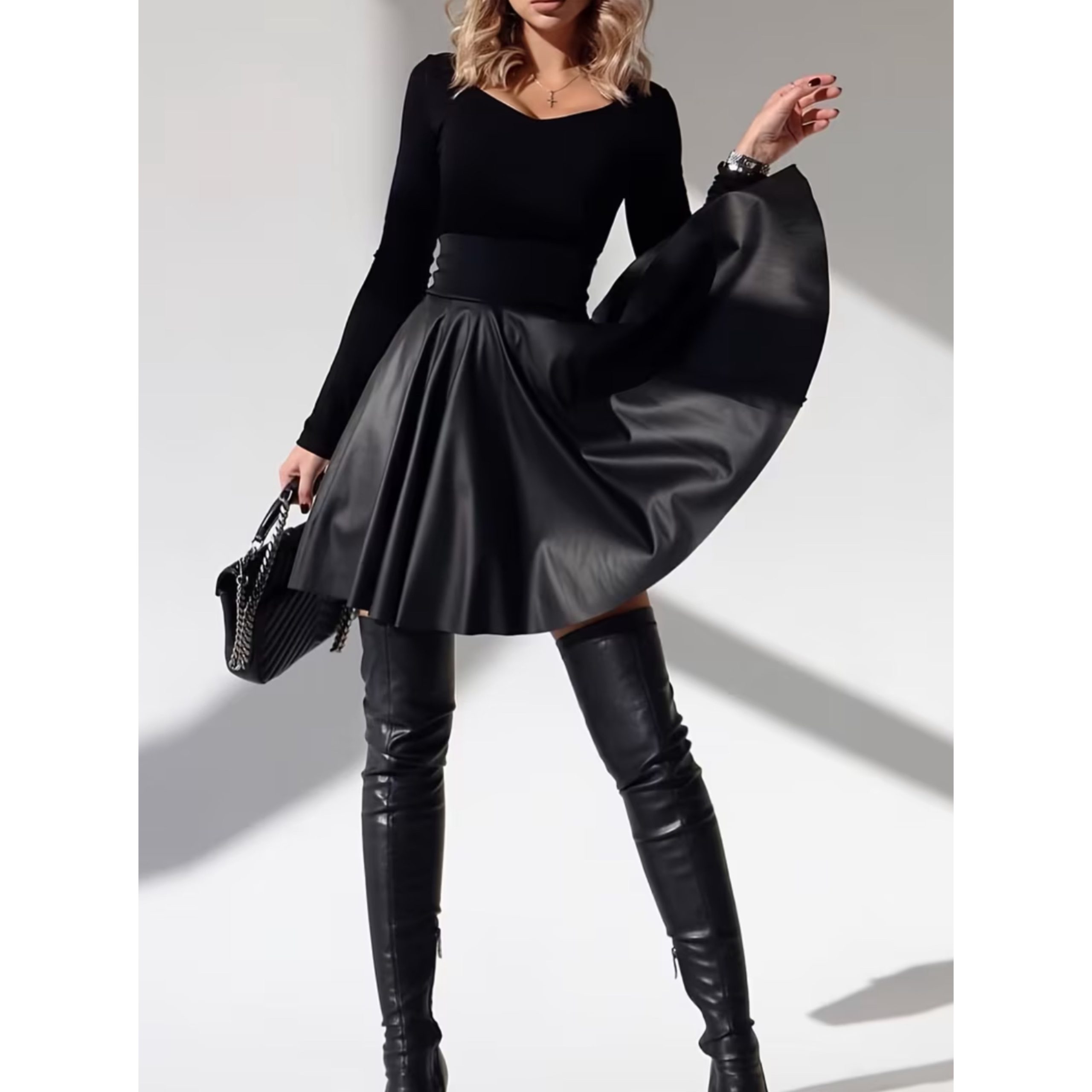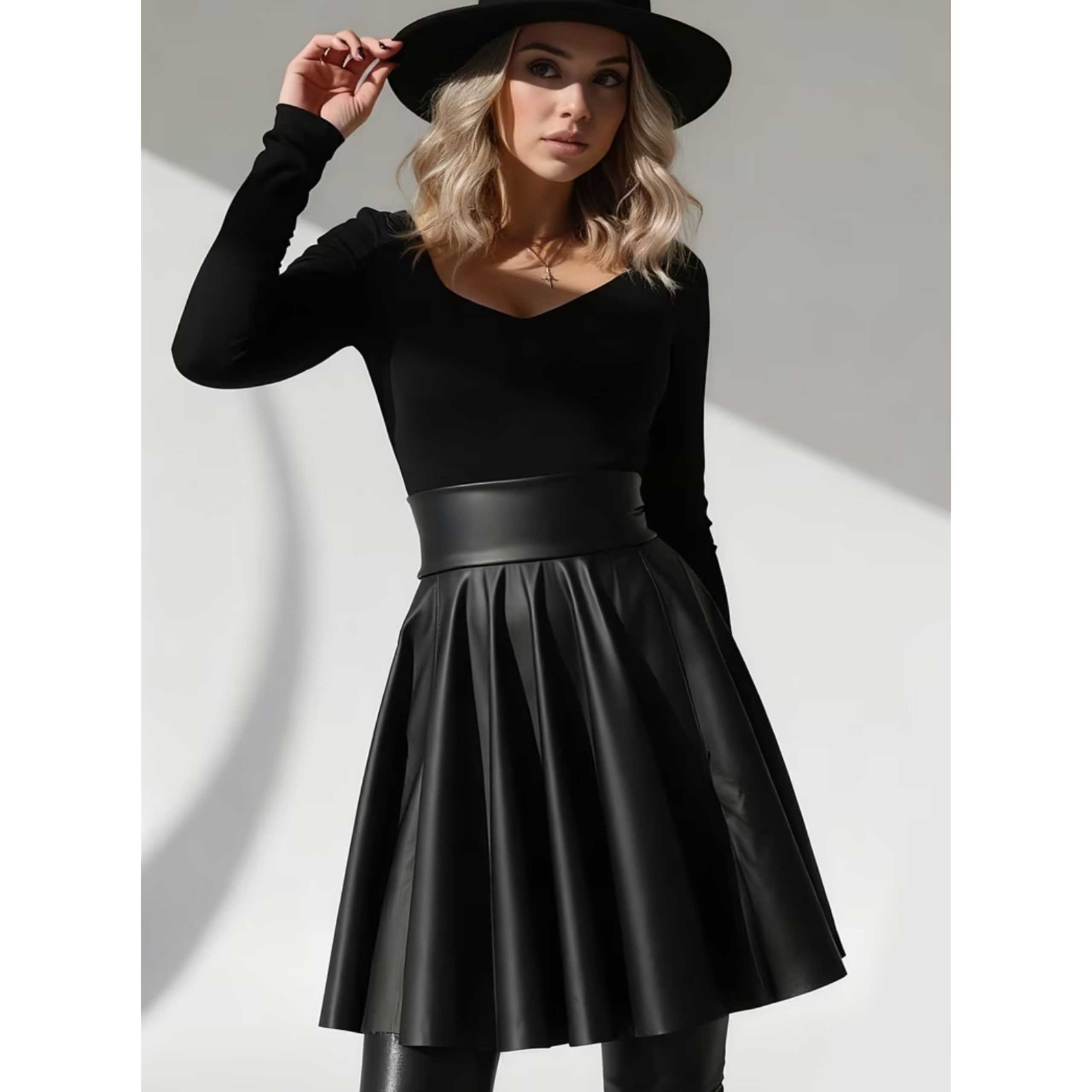 Fusta este confectionata din piele eco. In talie are fermoar ascuns.