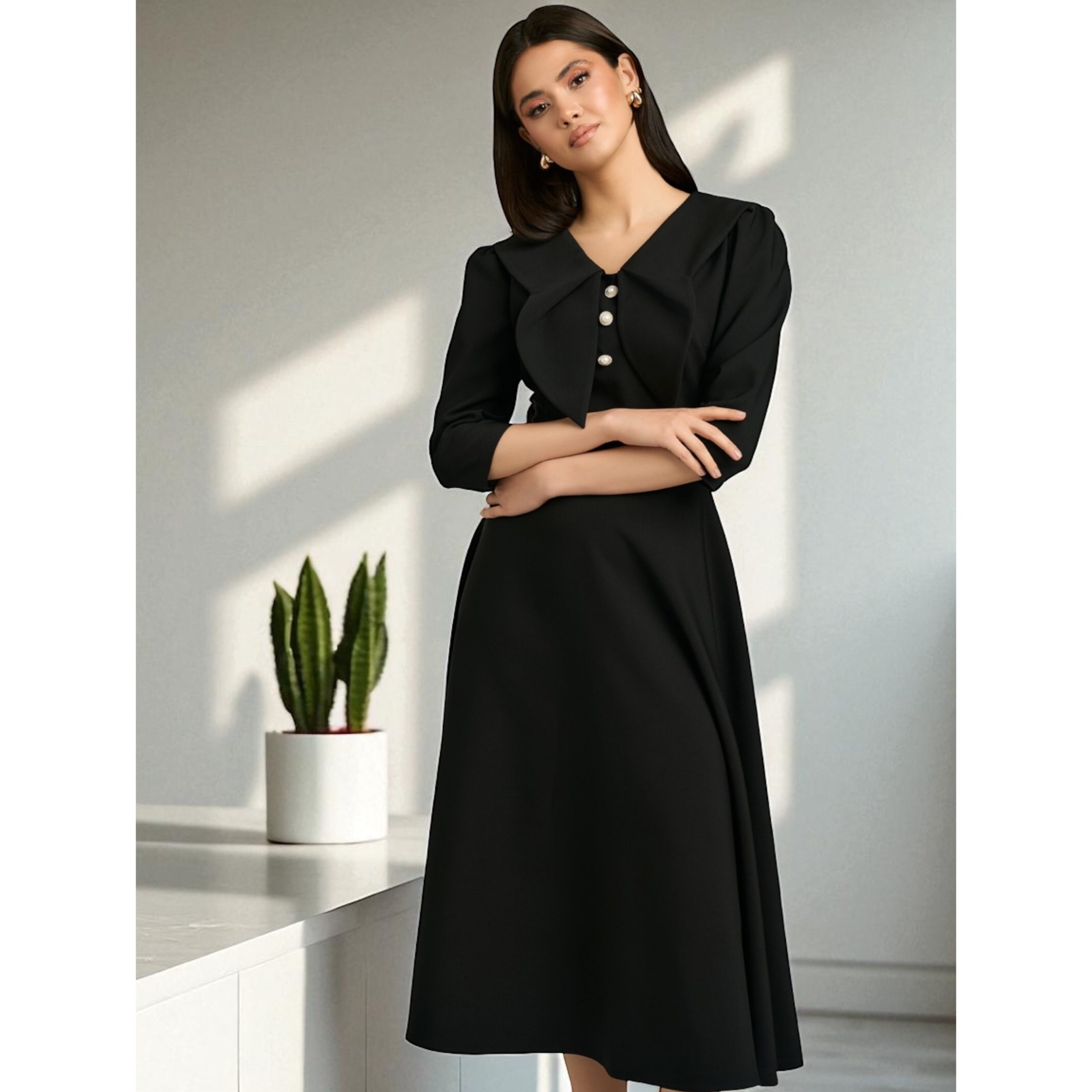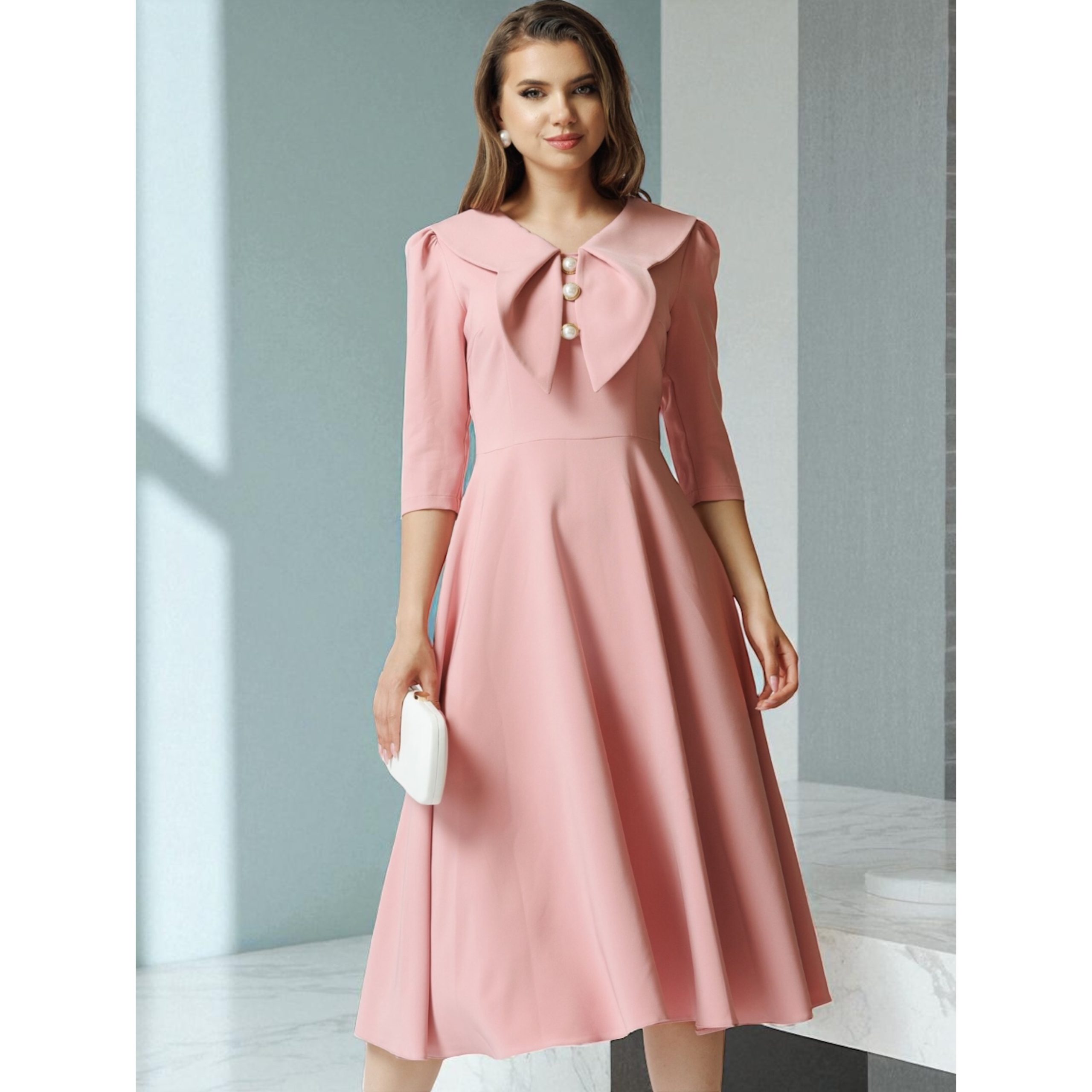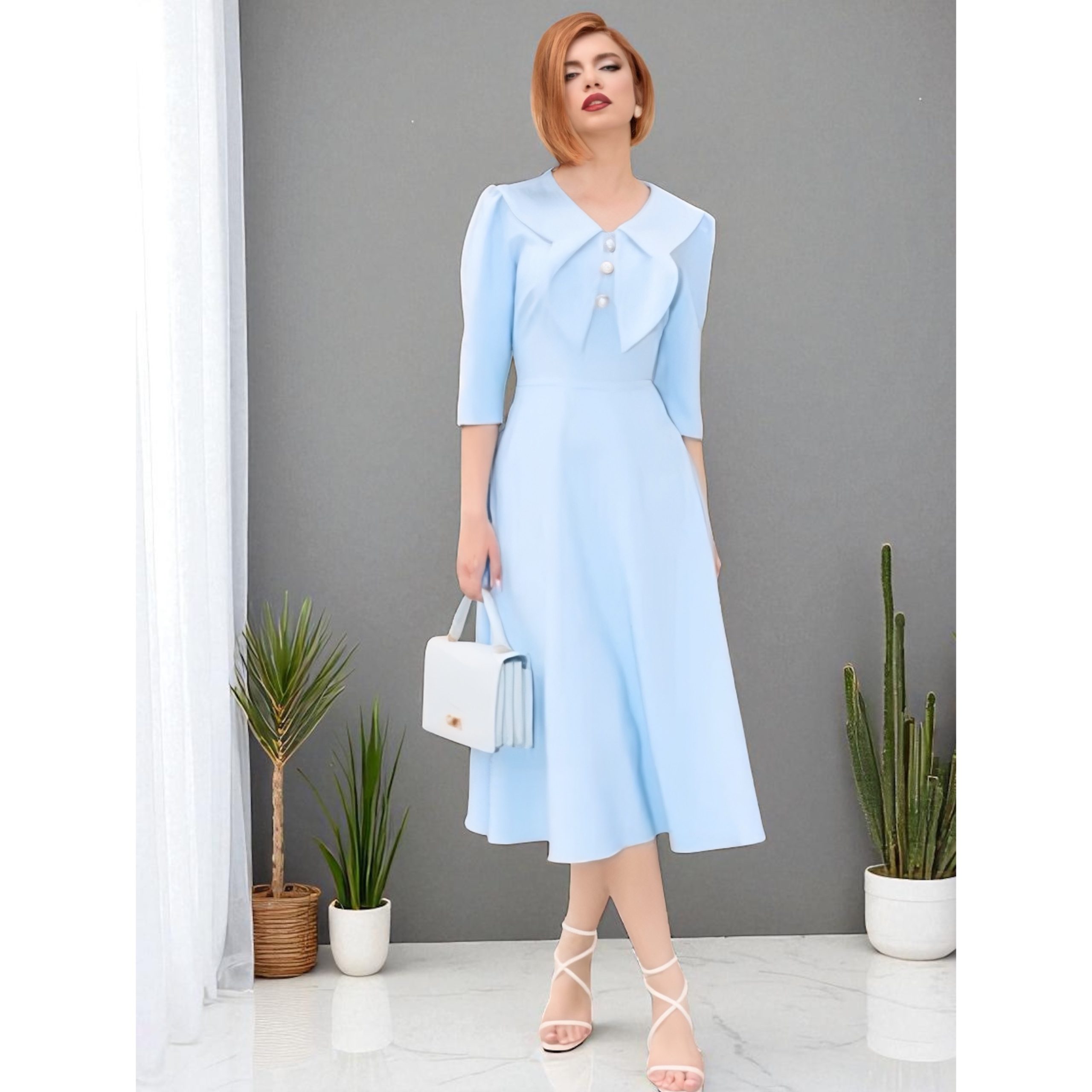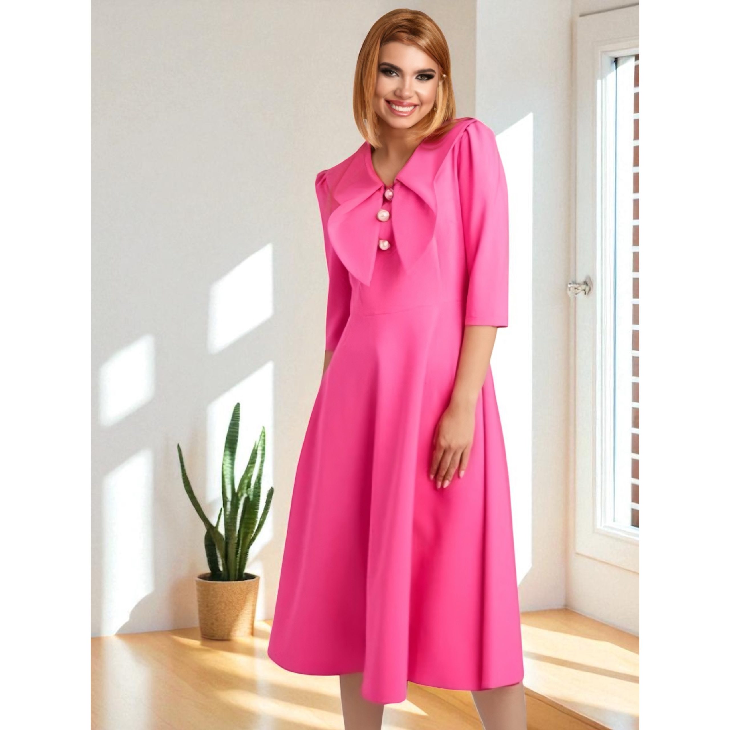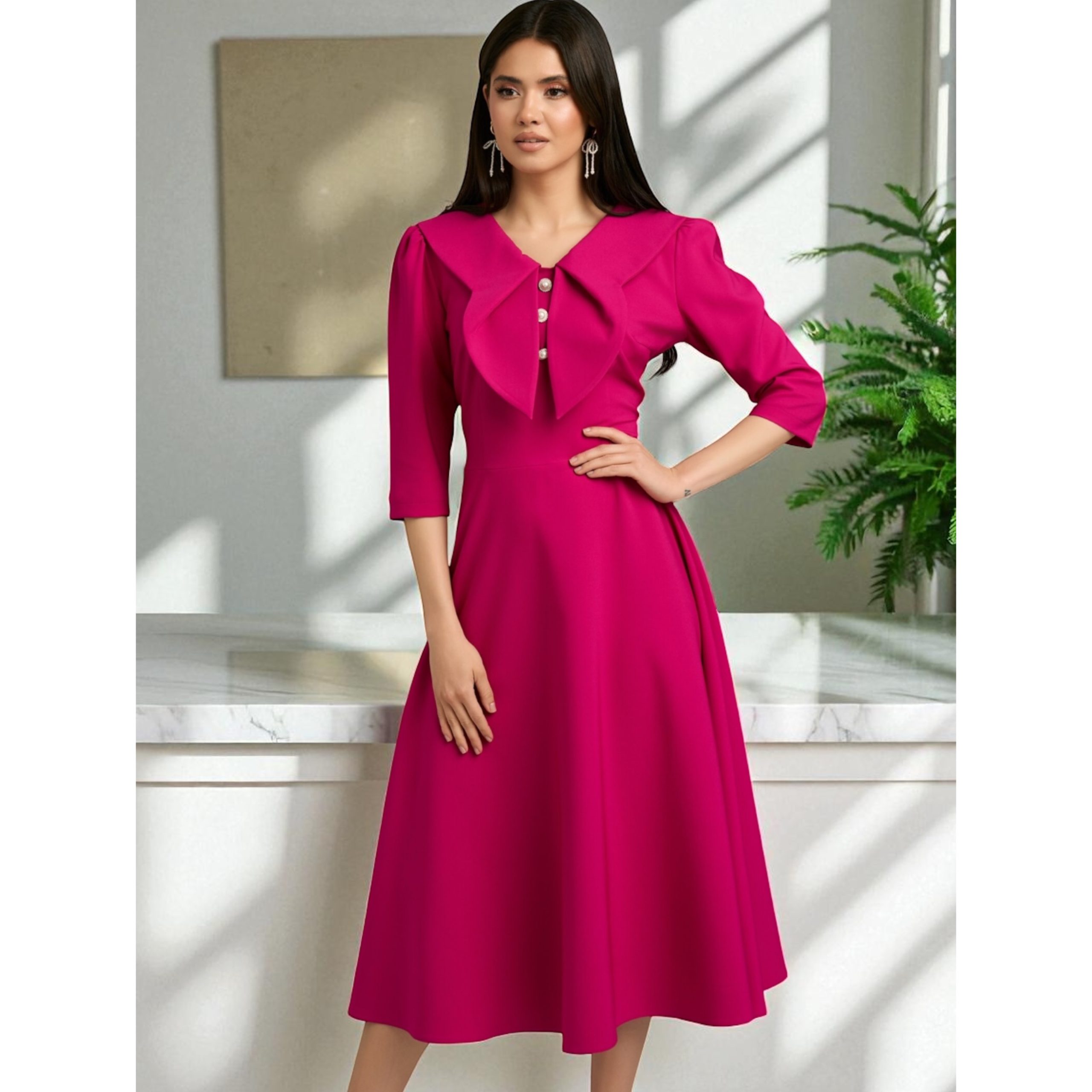 Rochia este confectionata din stofa barbie, material plin, usor elastic, care nu se electrizeaza, potrivit pentru rochii si fuste. Nasturii nu sunt functionali.