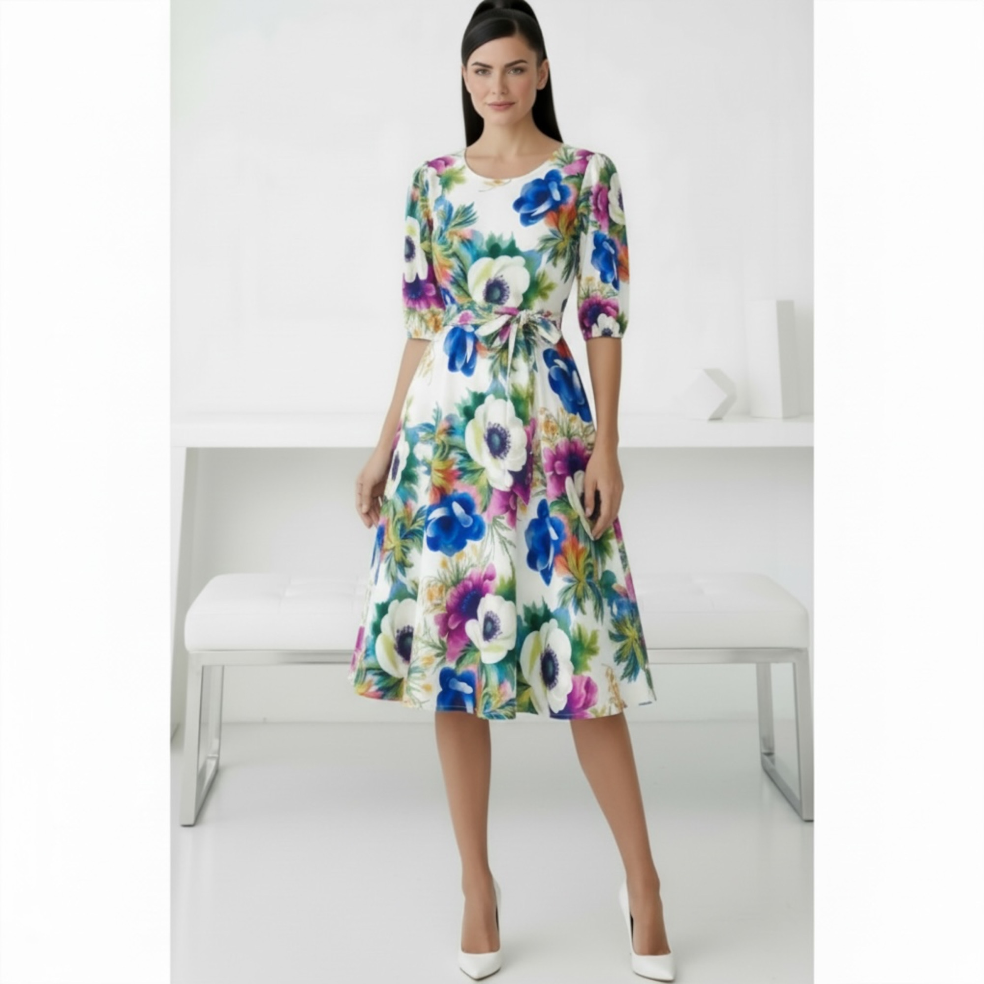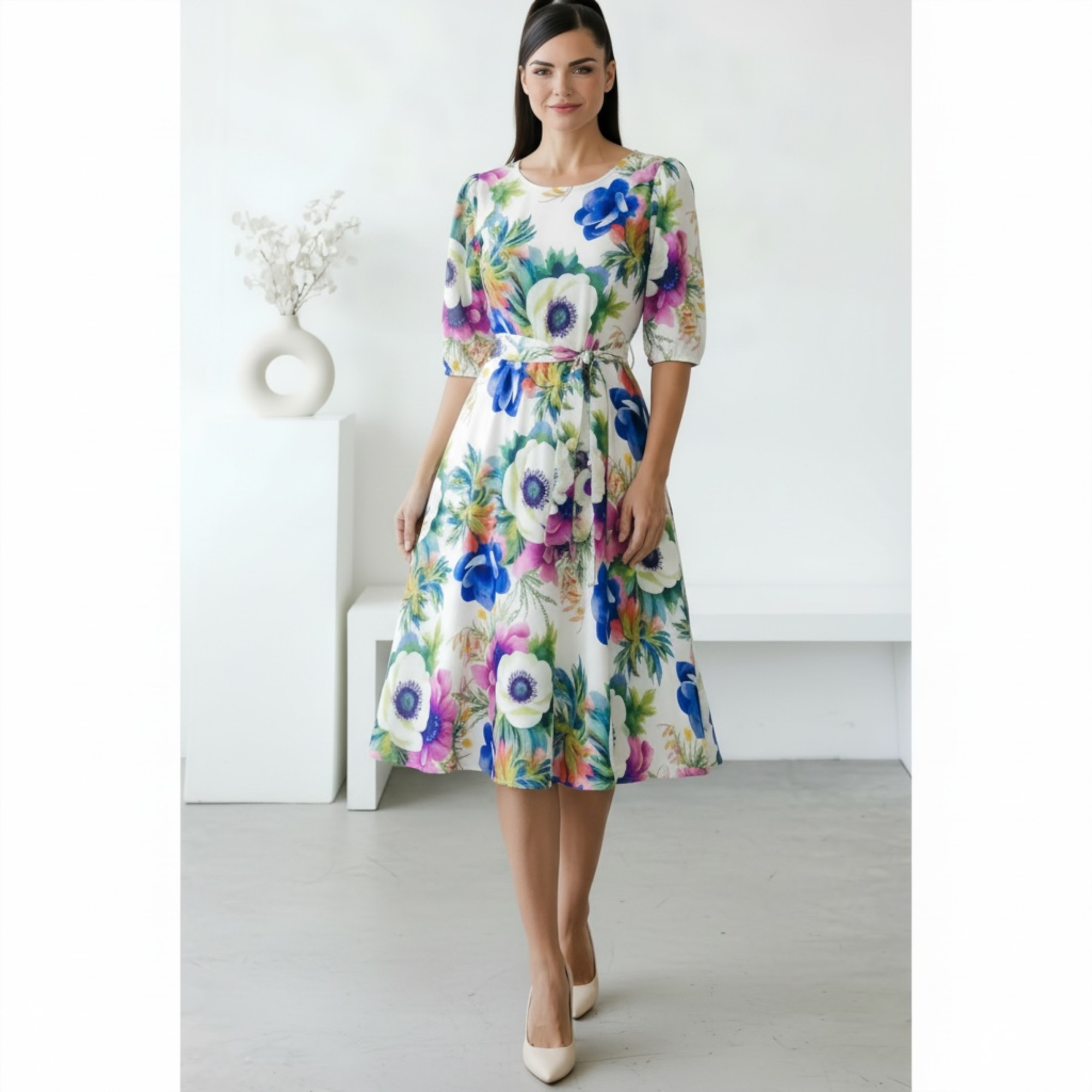 Rochia este confectionata din stofa barbie elastica, material plin, usor elastic. Are fermoar lateral.