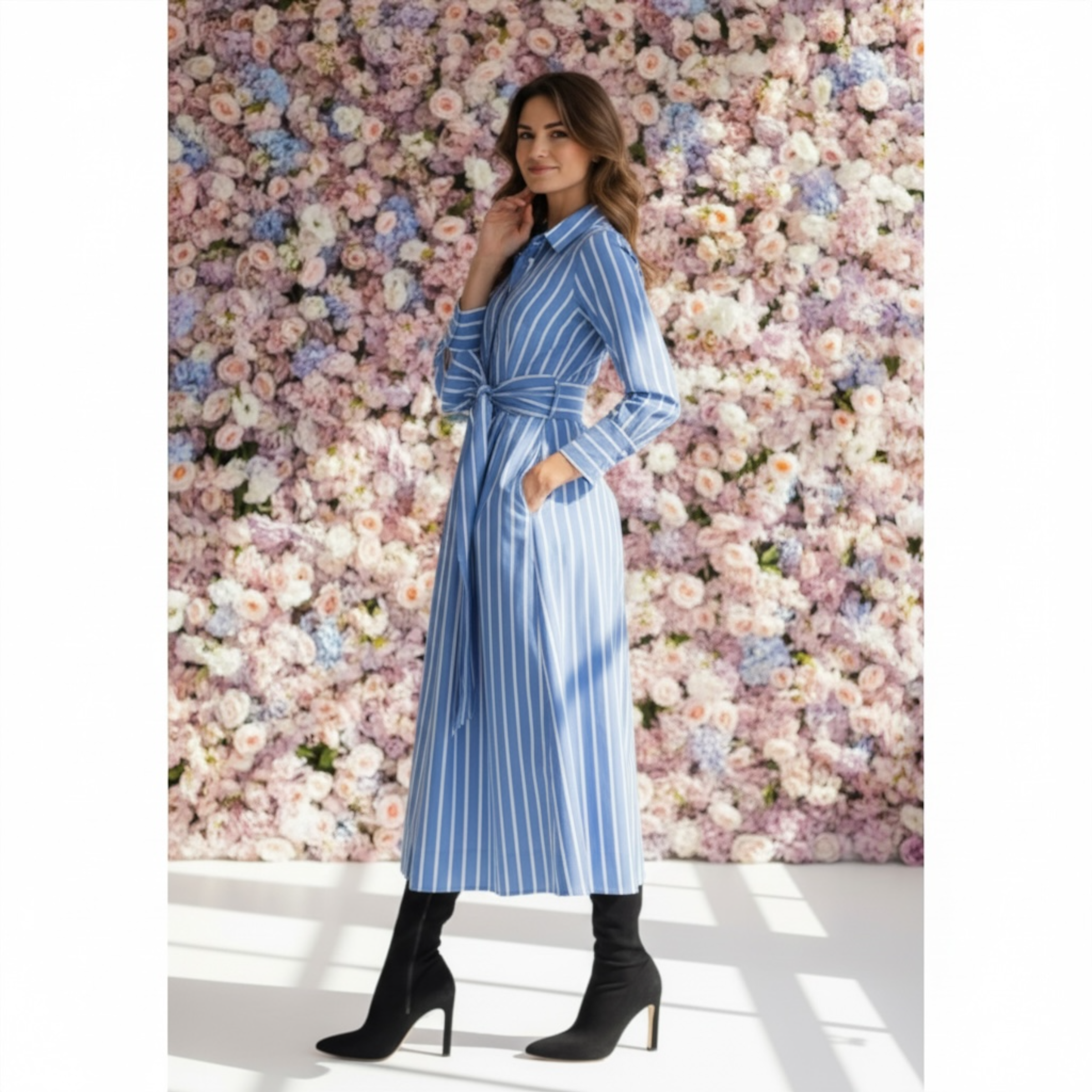 Rochia are croi lejer si este confectionata din bumbac. Are sistem de inchidere in nasturi si cordon detasabil.