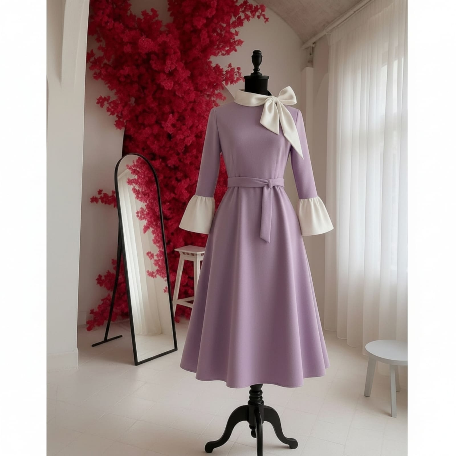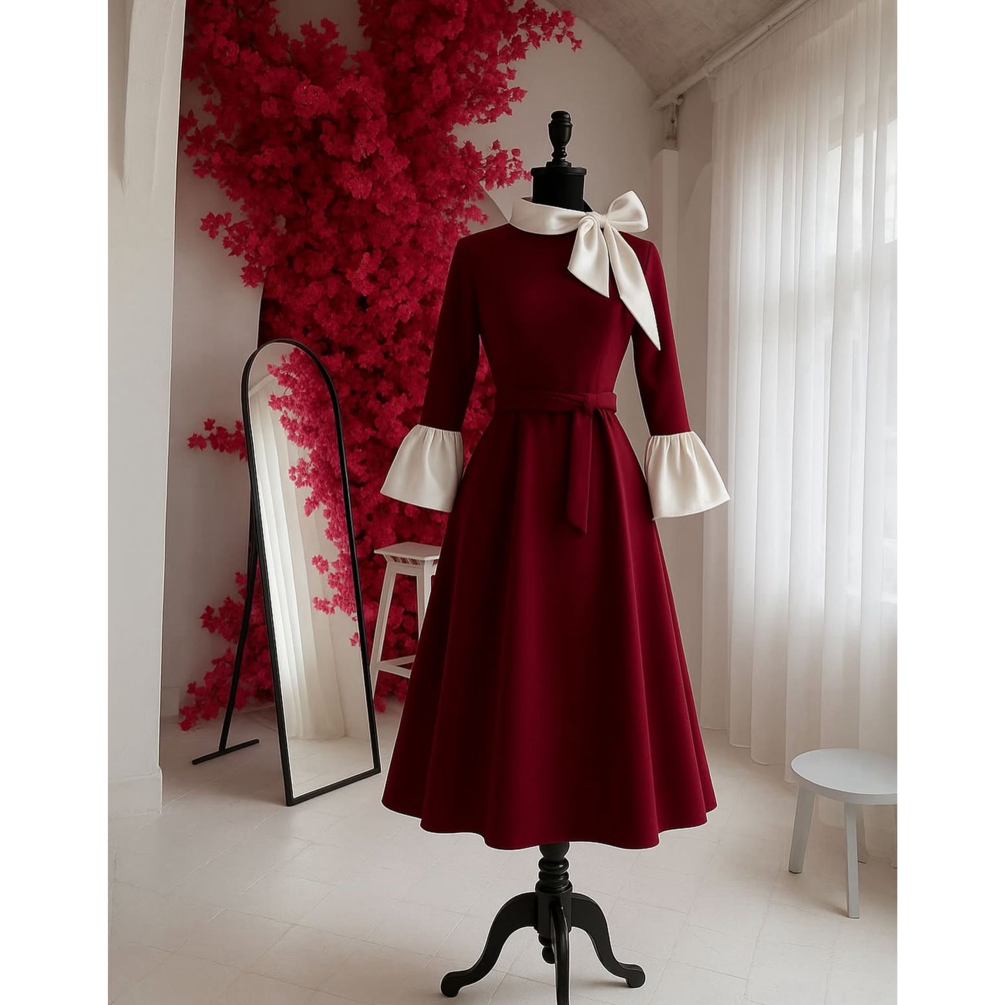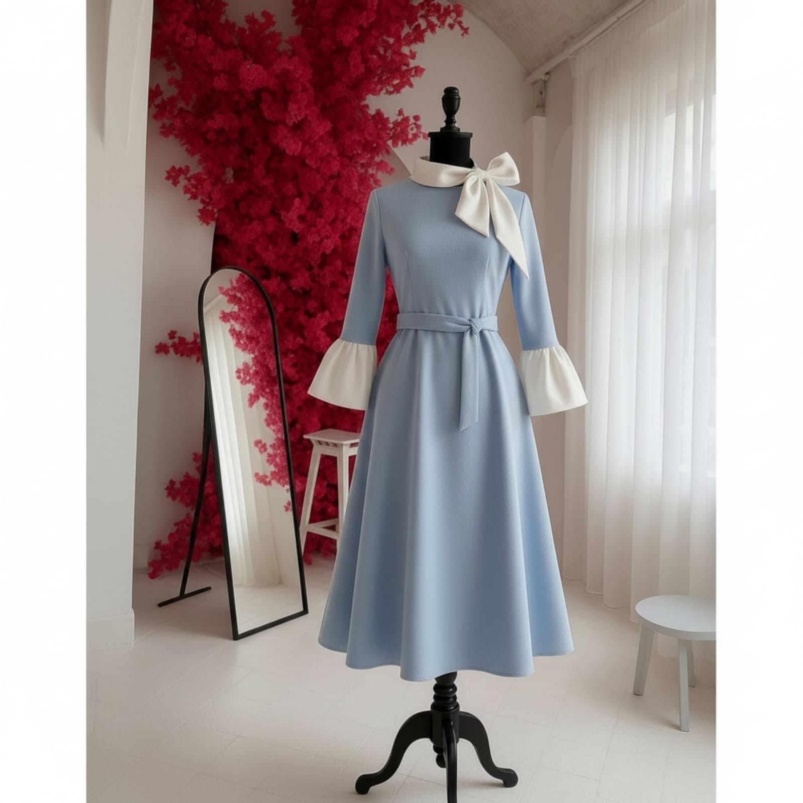 Rochia este confectionata din stofa barbie, material usor elastic, potrivit si pentru sezonul rece. Lungime standard 115 cm. Gulerul si mansetele raman albe, indiferent de culoarea selectata pentru rochie.