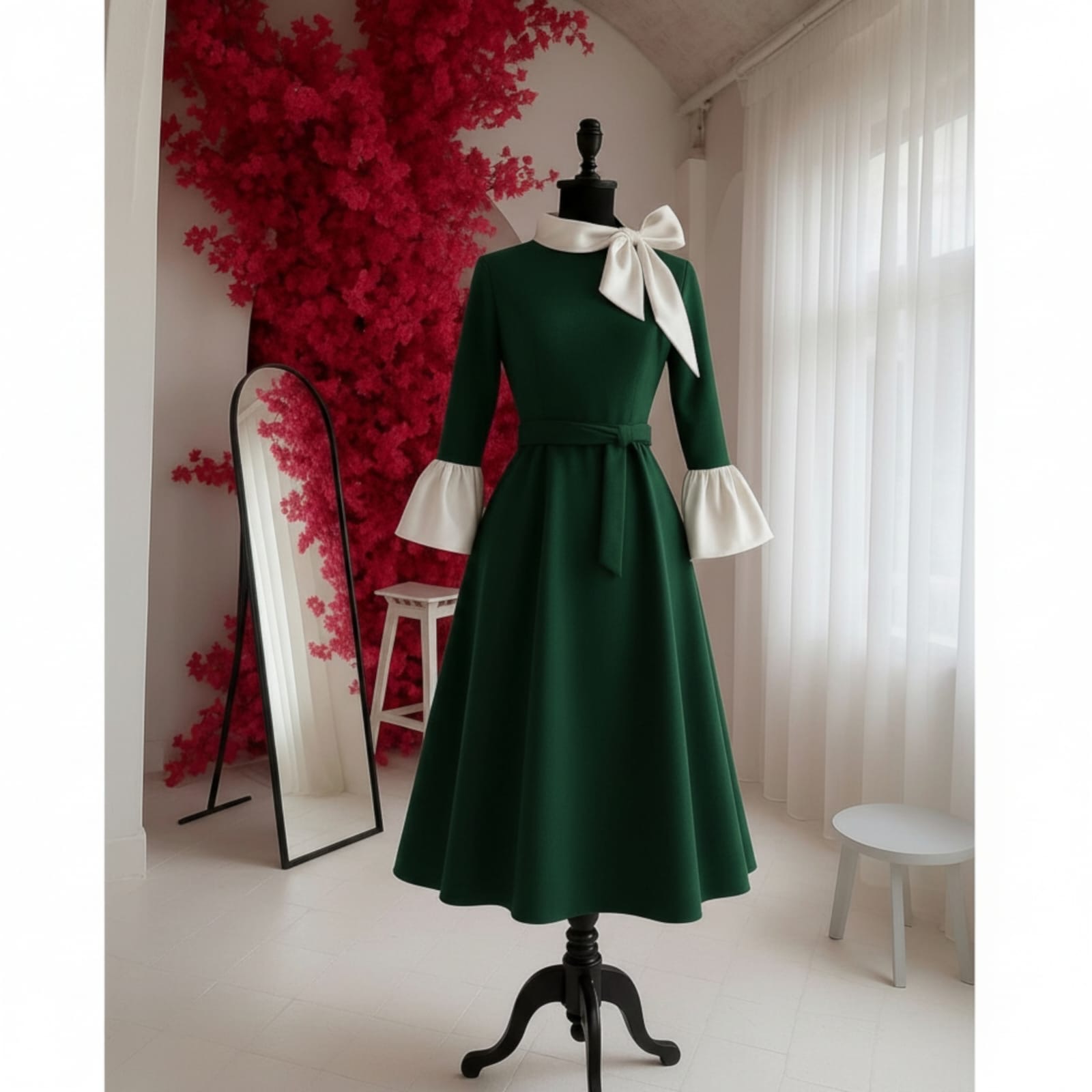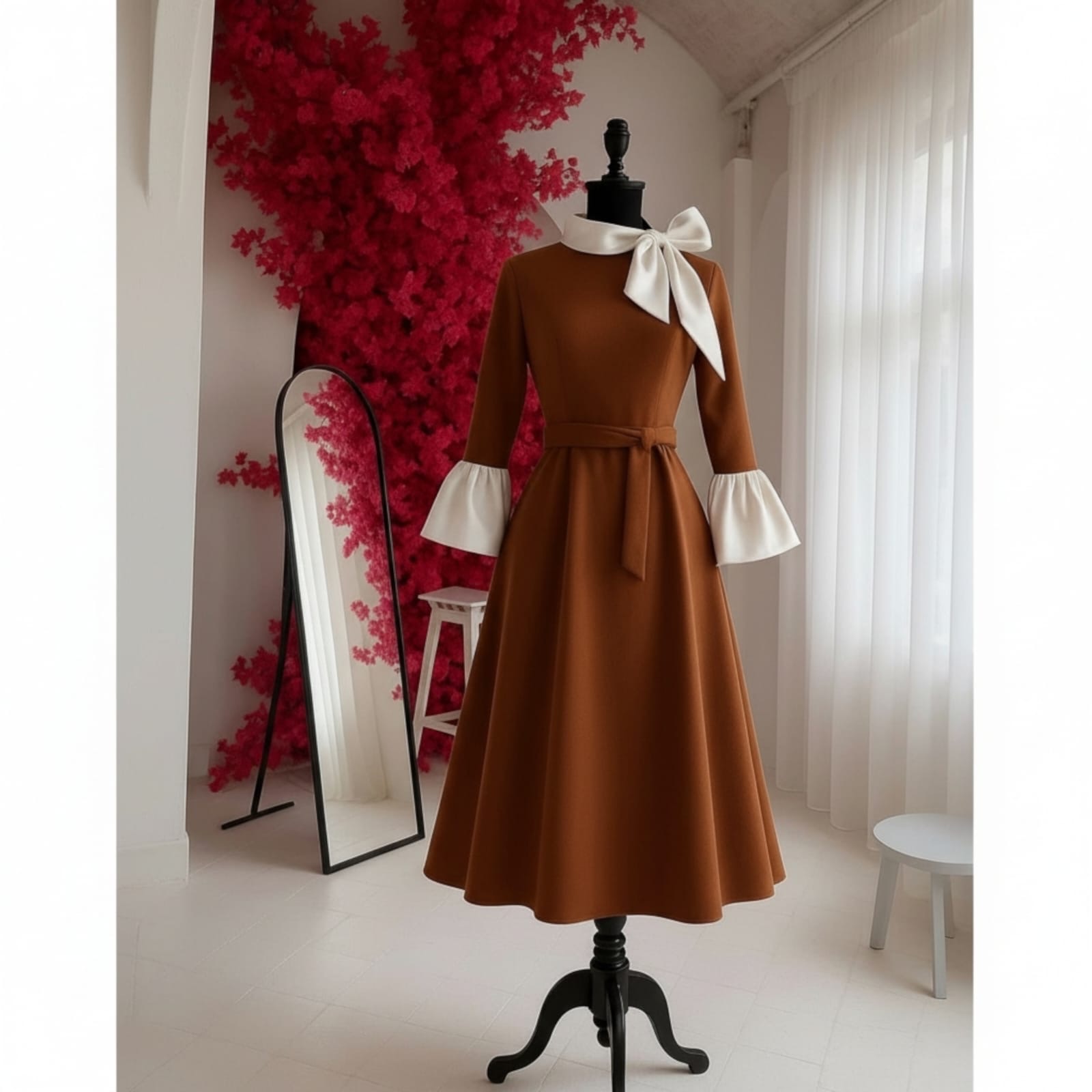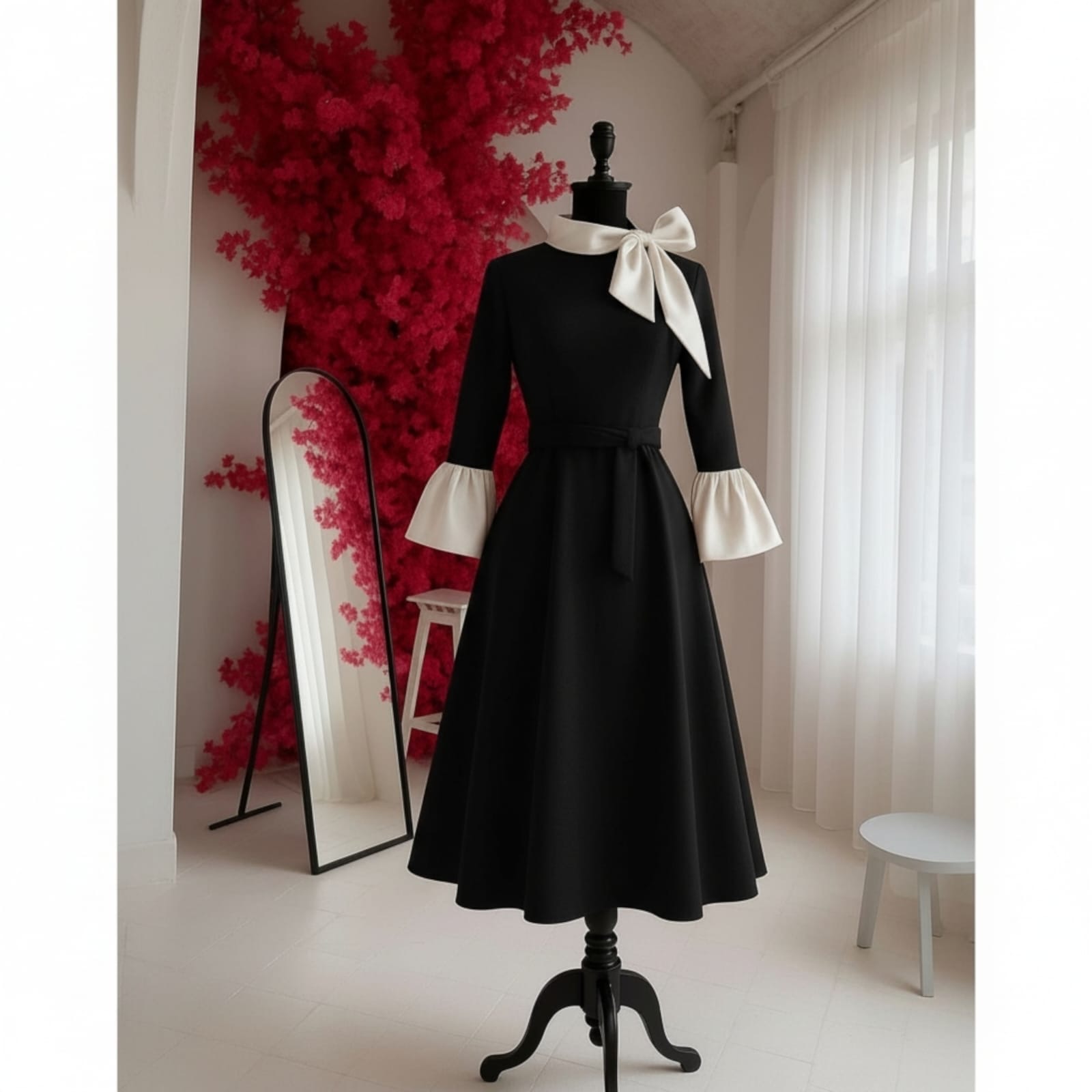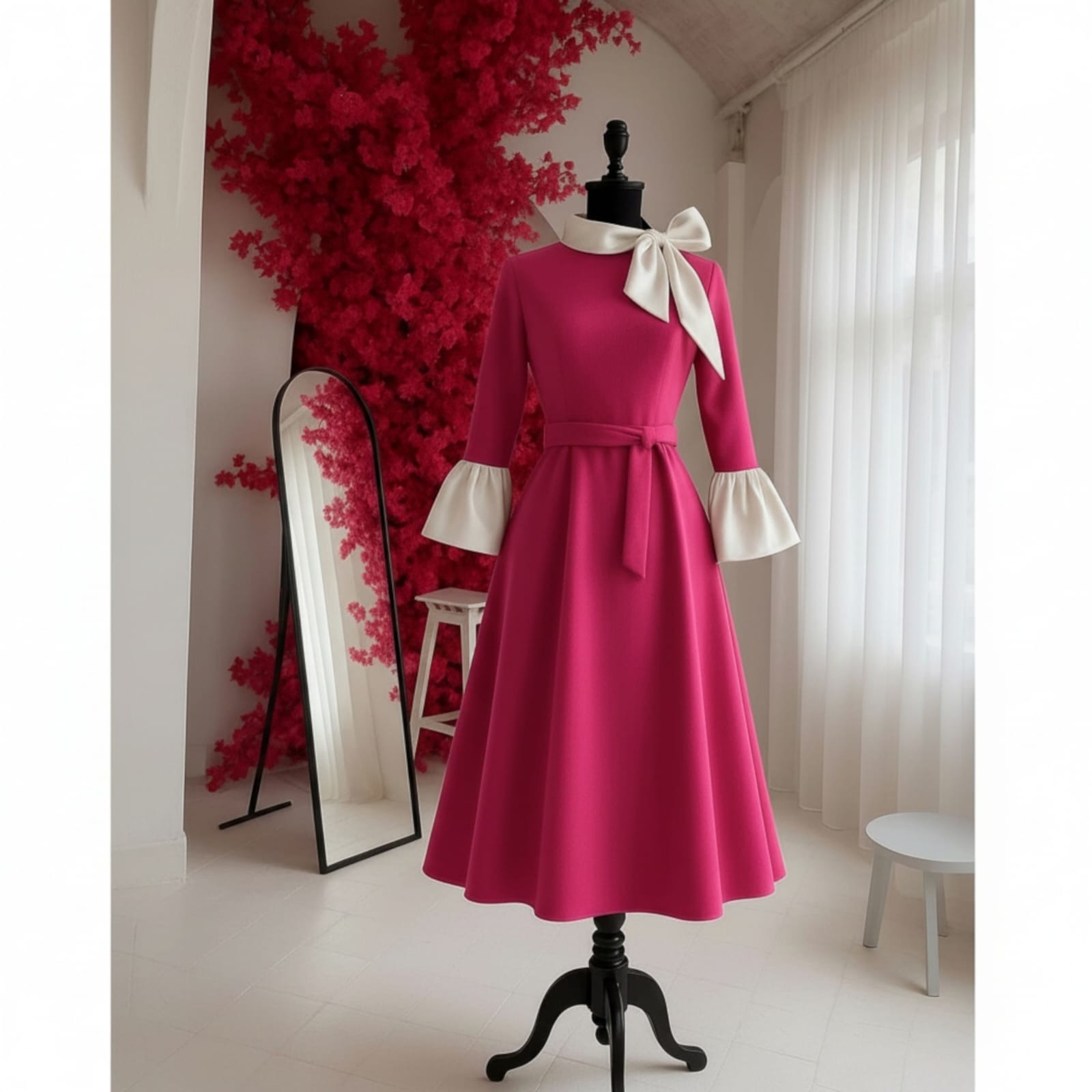 Rochia este confectionata din stofa barbie, material usor elastic, potrivit si pentru sezonul rece. Lungime standard 115 cm. Gulerul si mansetele raman albe, indiferent de culoarea selectata pentru rochie.