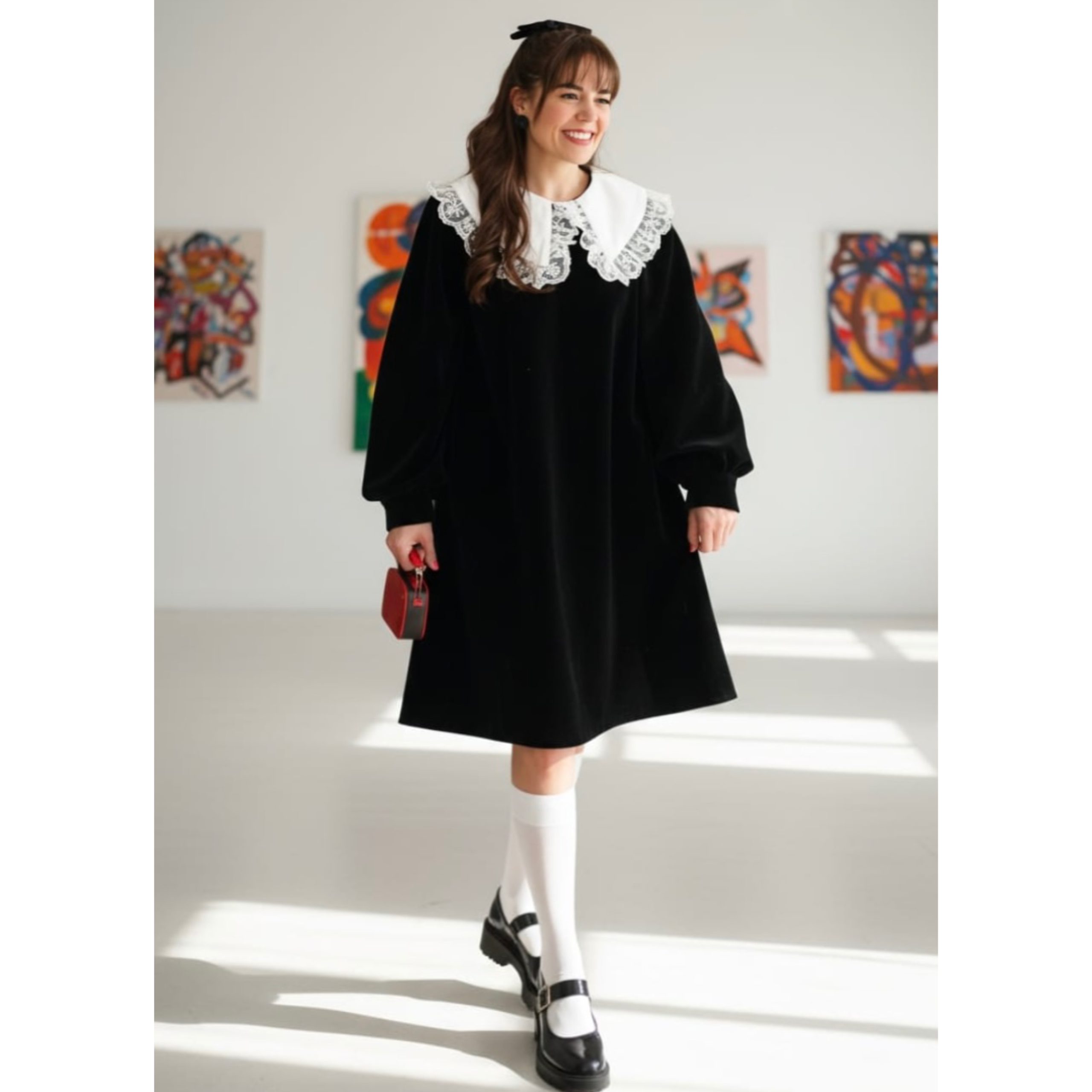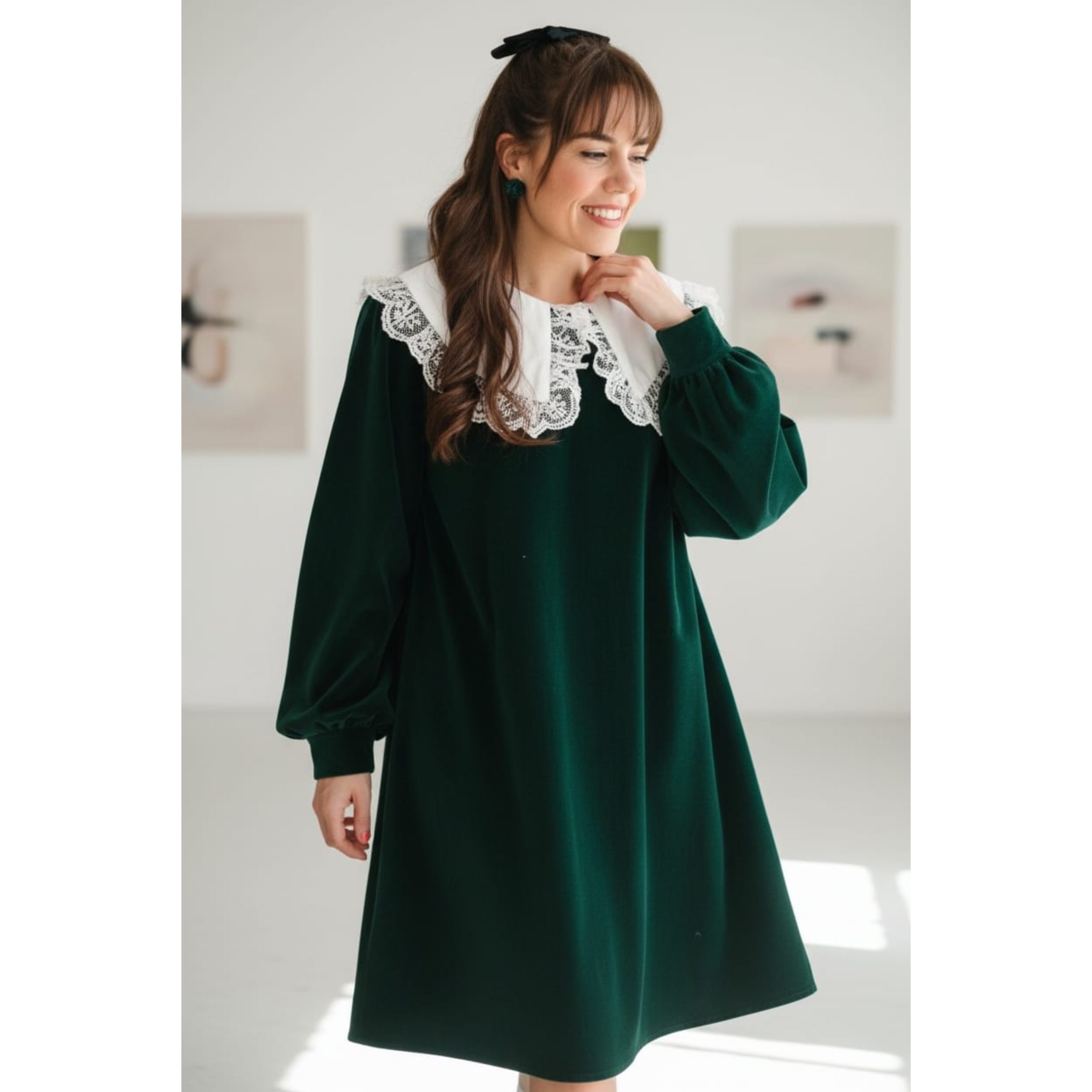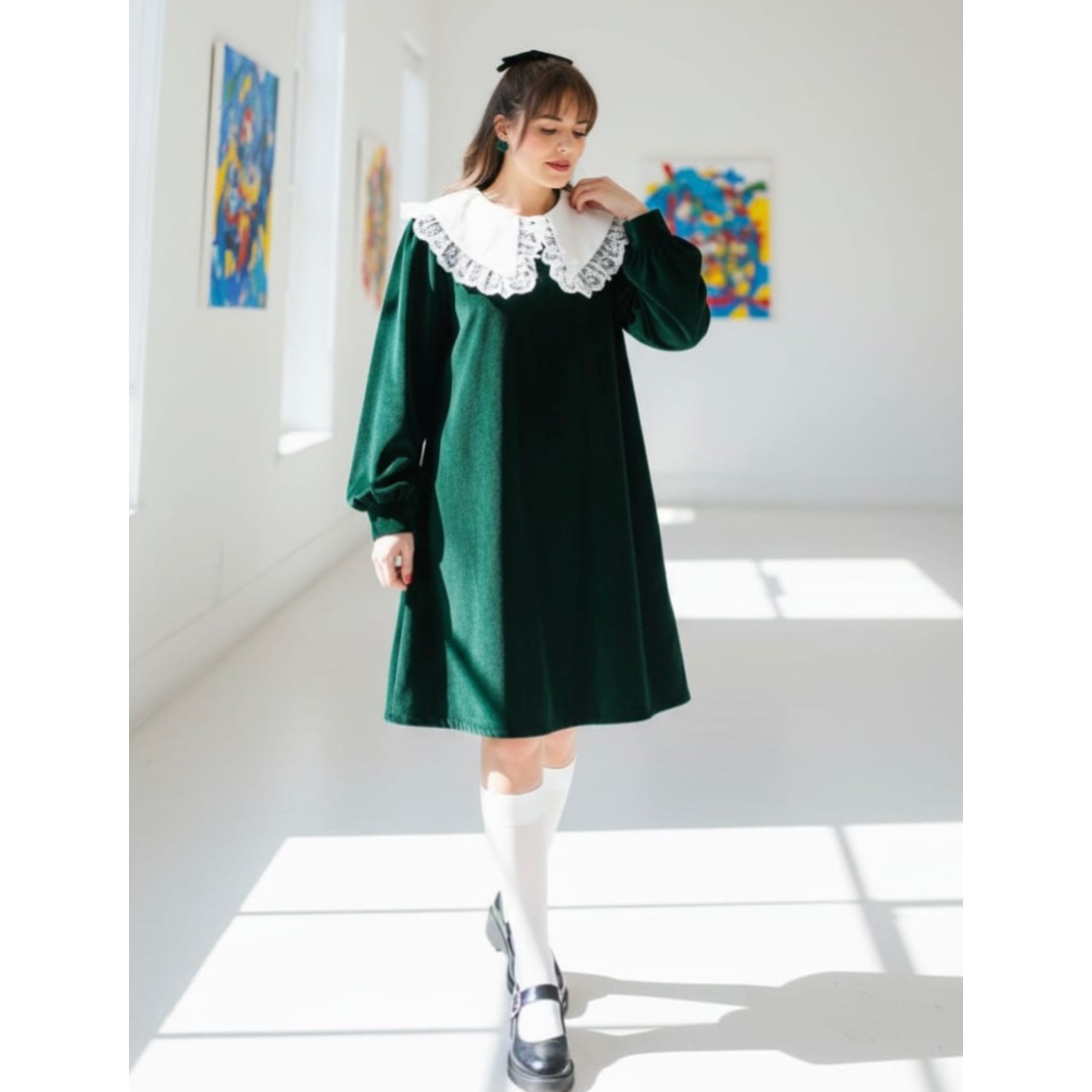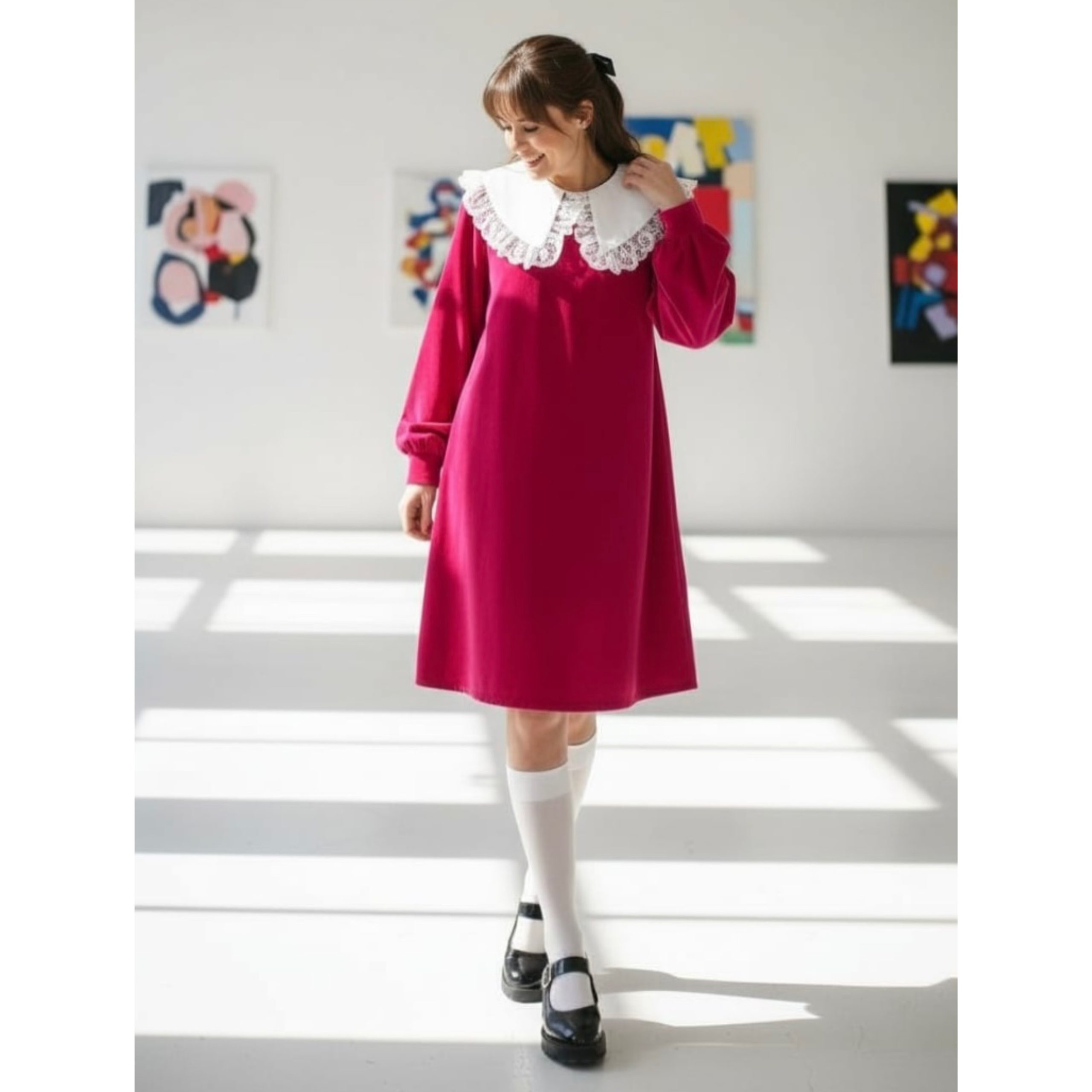 Rochia este confectionata din stofa, material plin. Gulerul nu este detasabil. Croi lejer. Lungime standard 95/100 cm