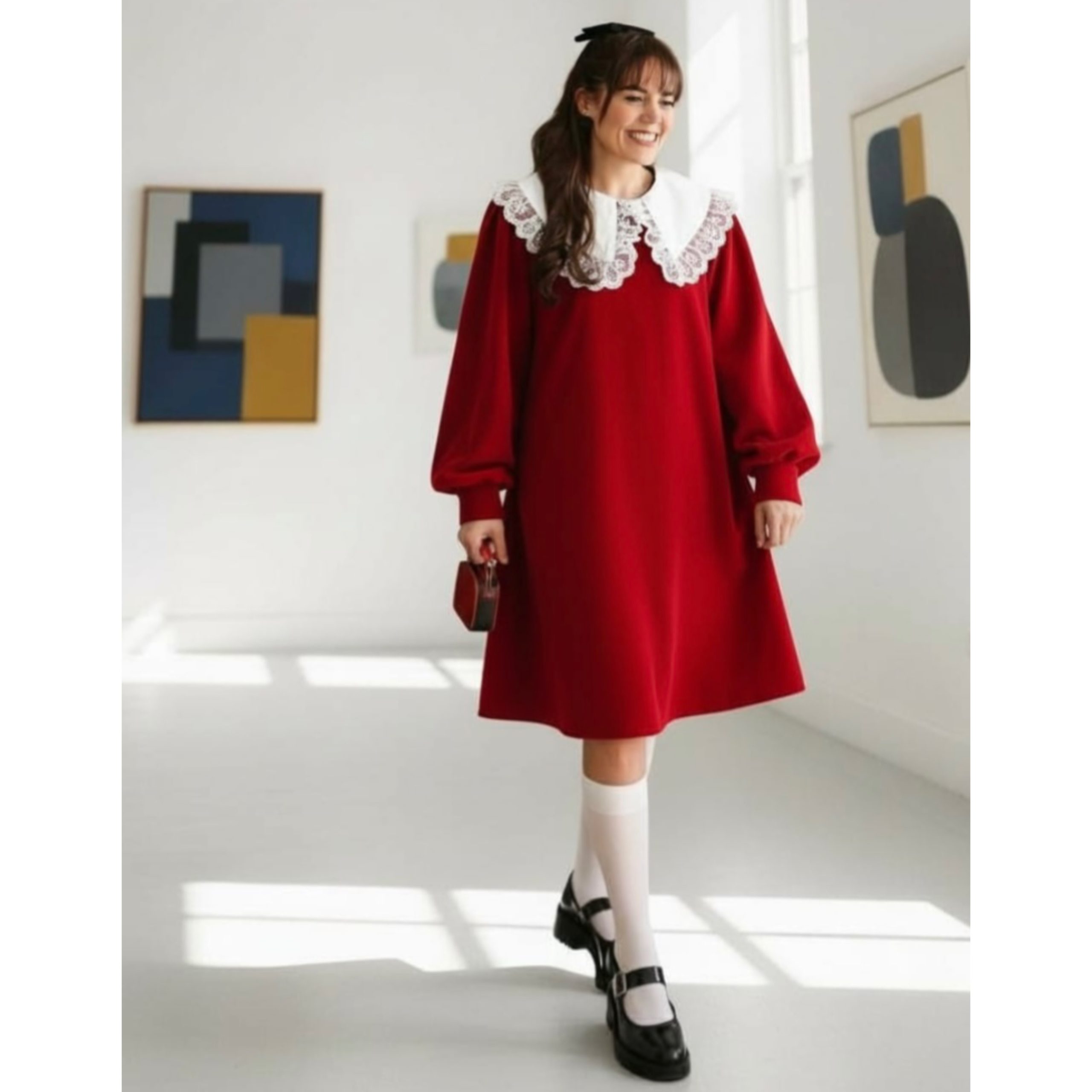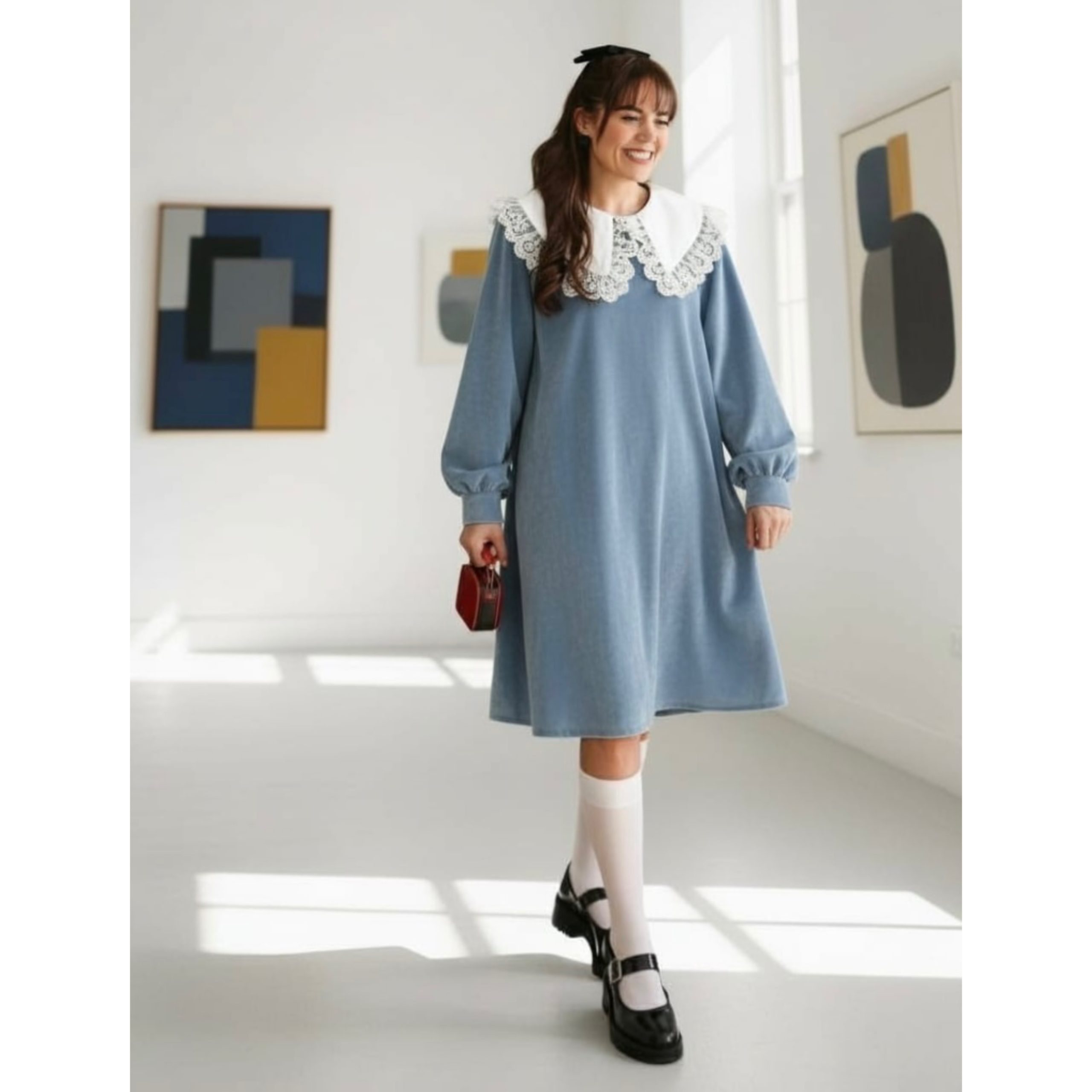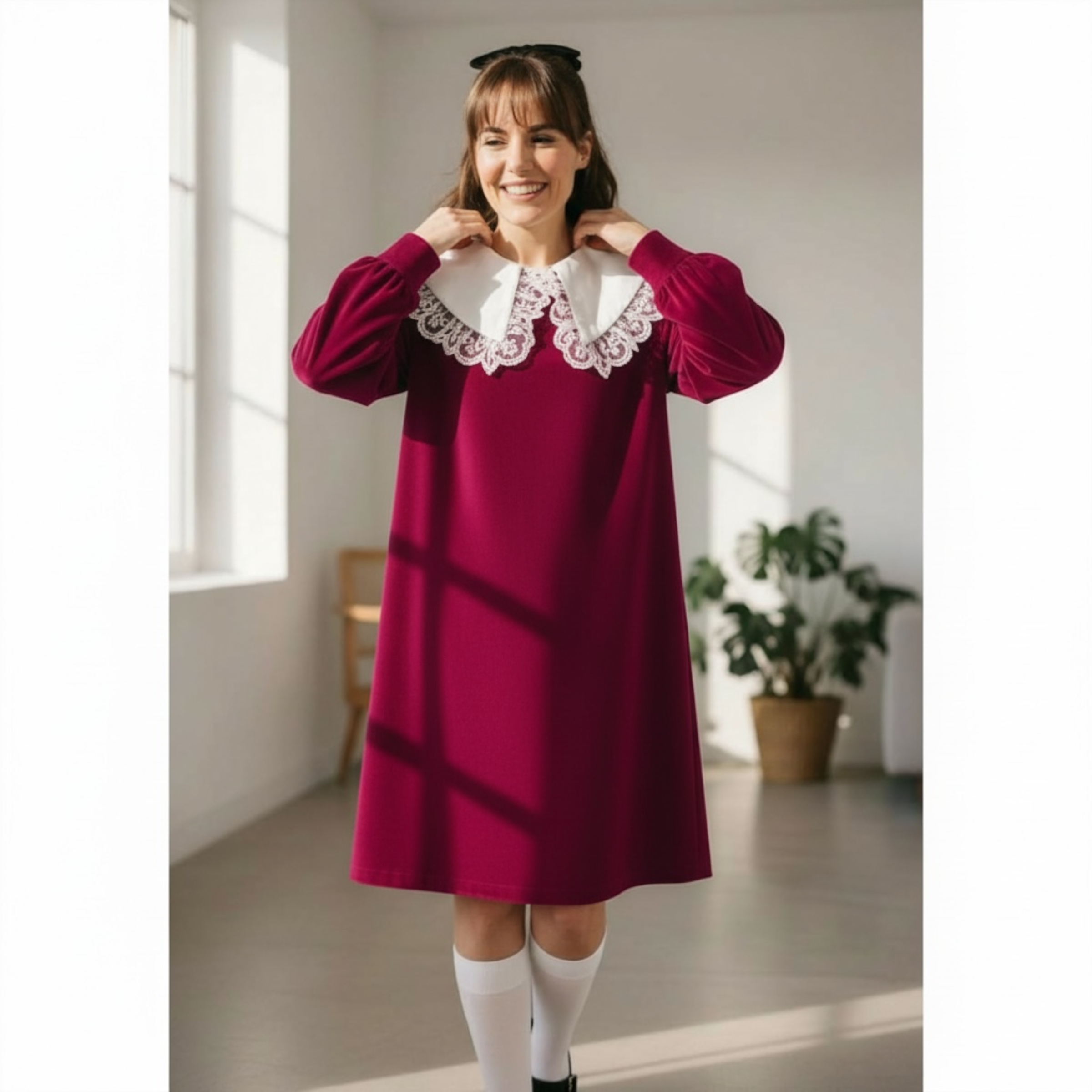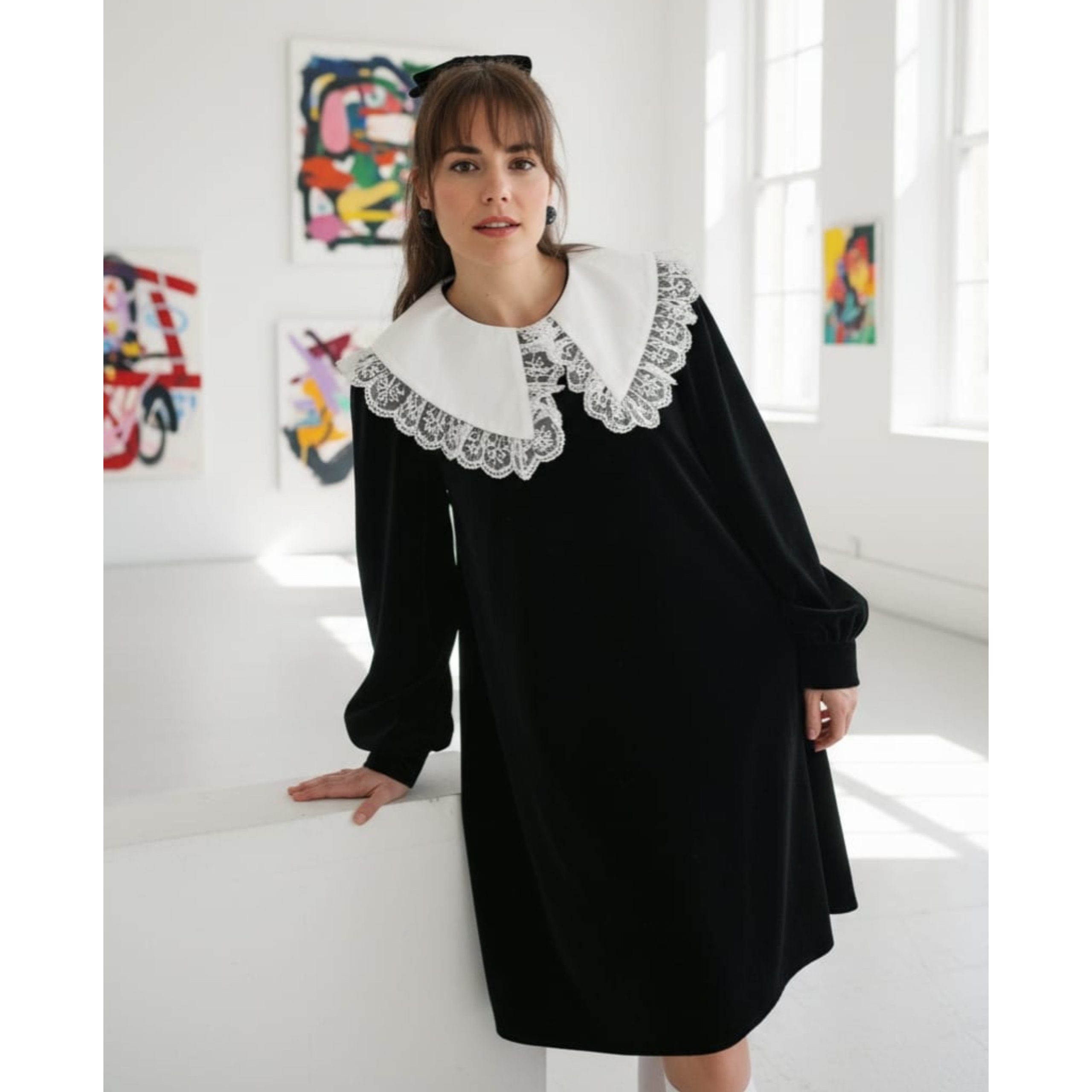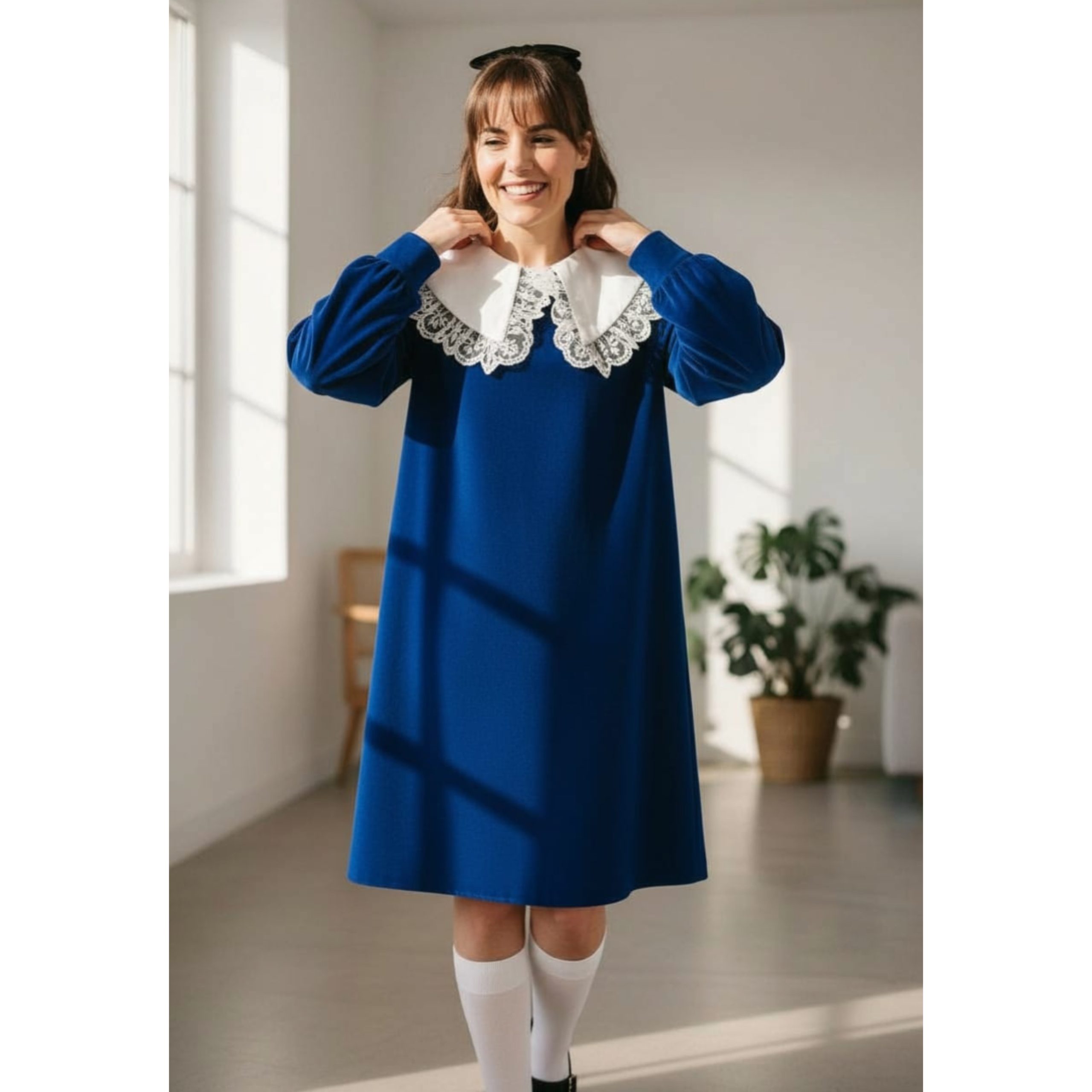 Rochia este confectionata din stofa, material plin. Gulerul nu este detasabil. Croi lejer. Lungime standard 95/100 cm