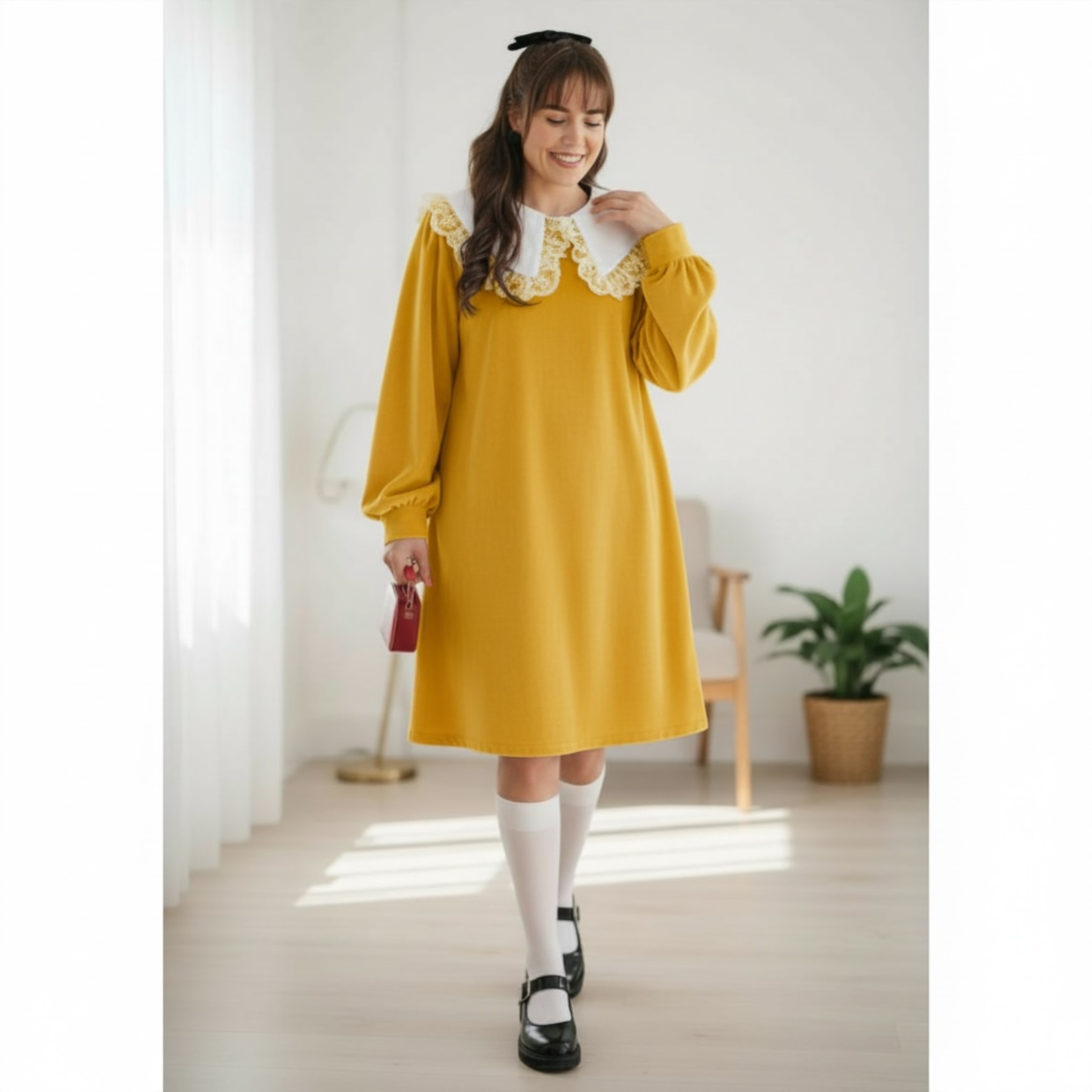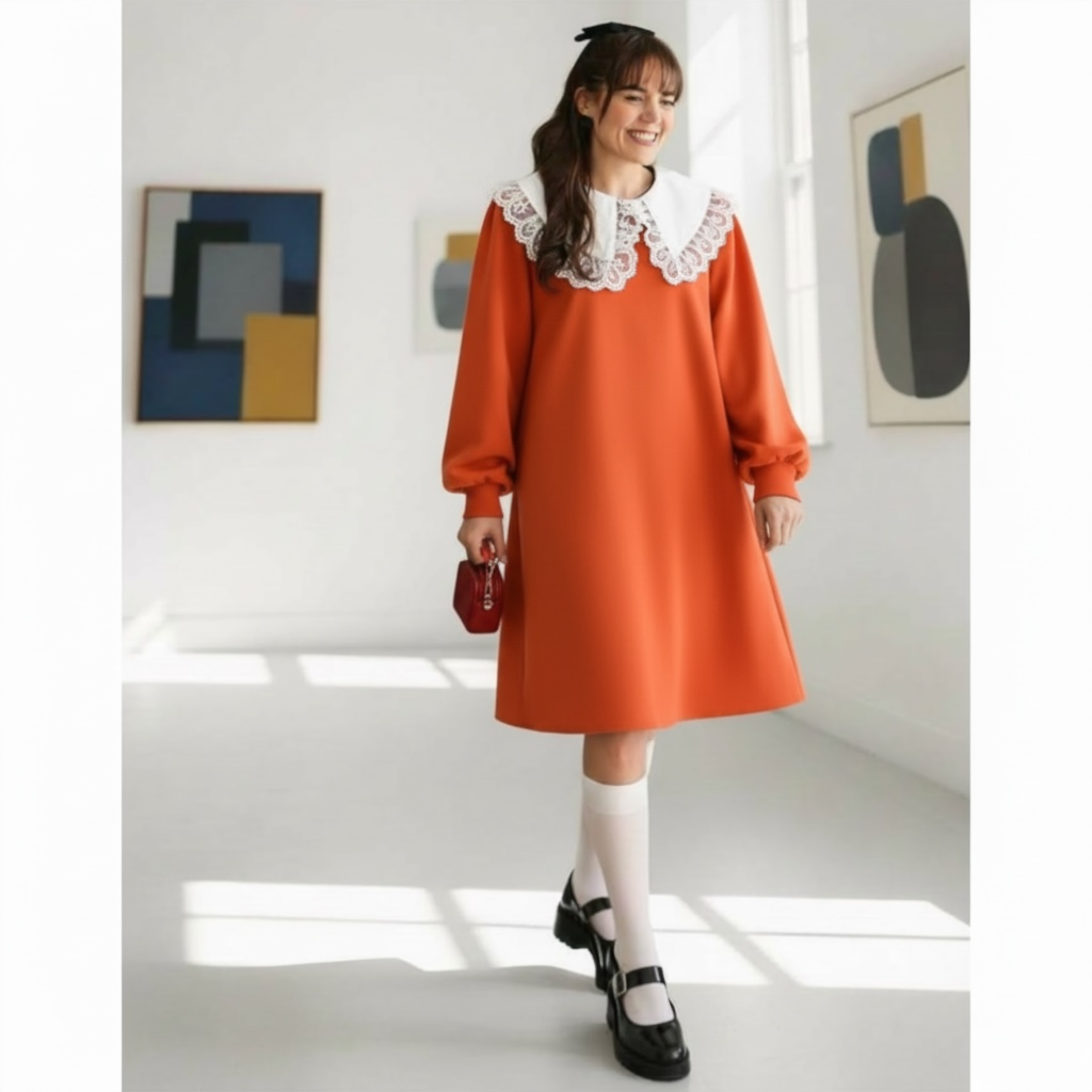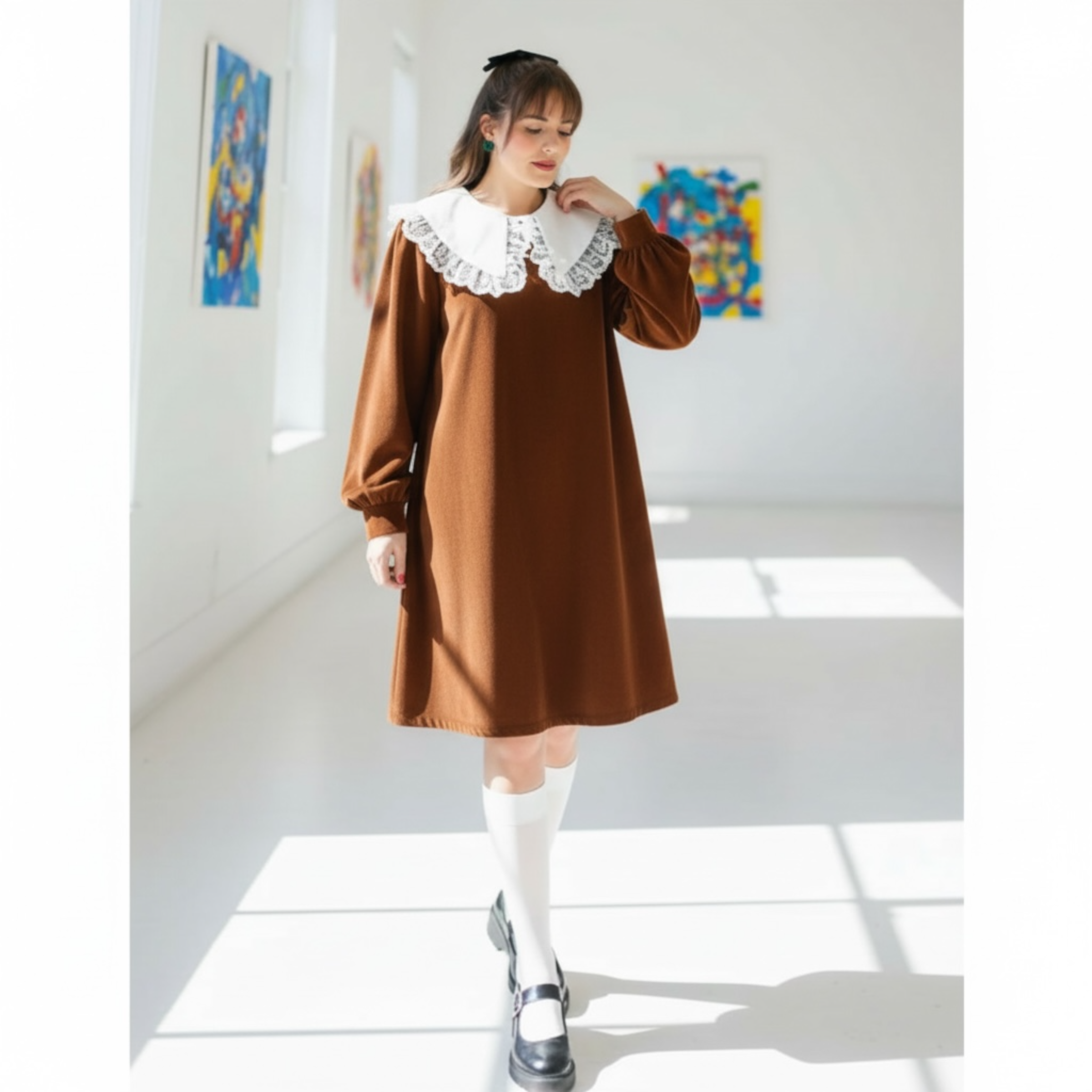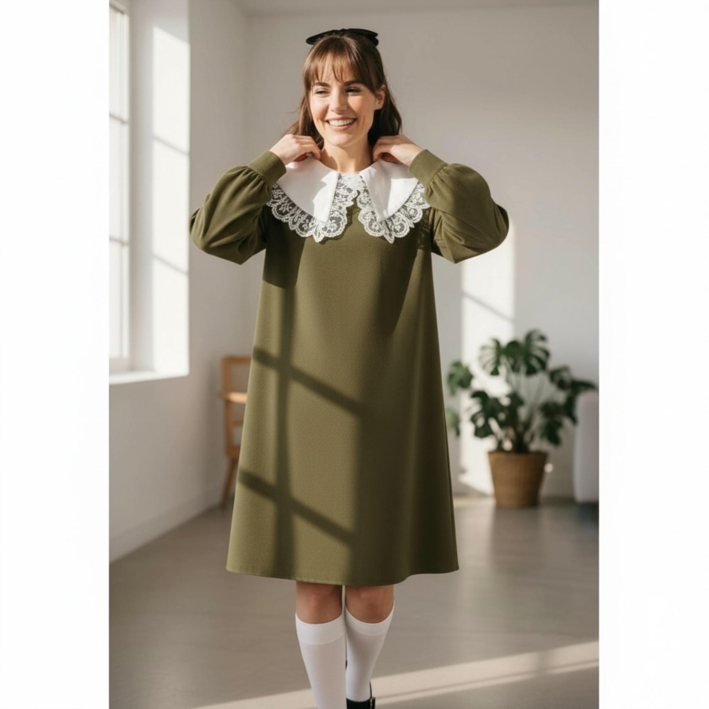 Rochia este confectionata din stofa, material plin. Gulerul nu este detasabil. Croi lejer. Lungime standard 95/100 cm