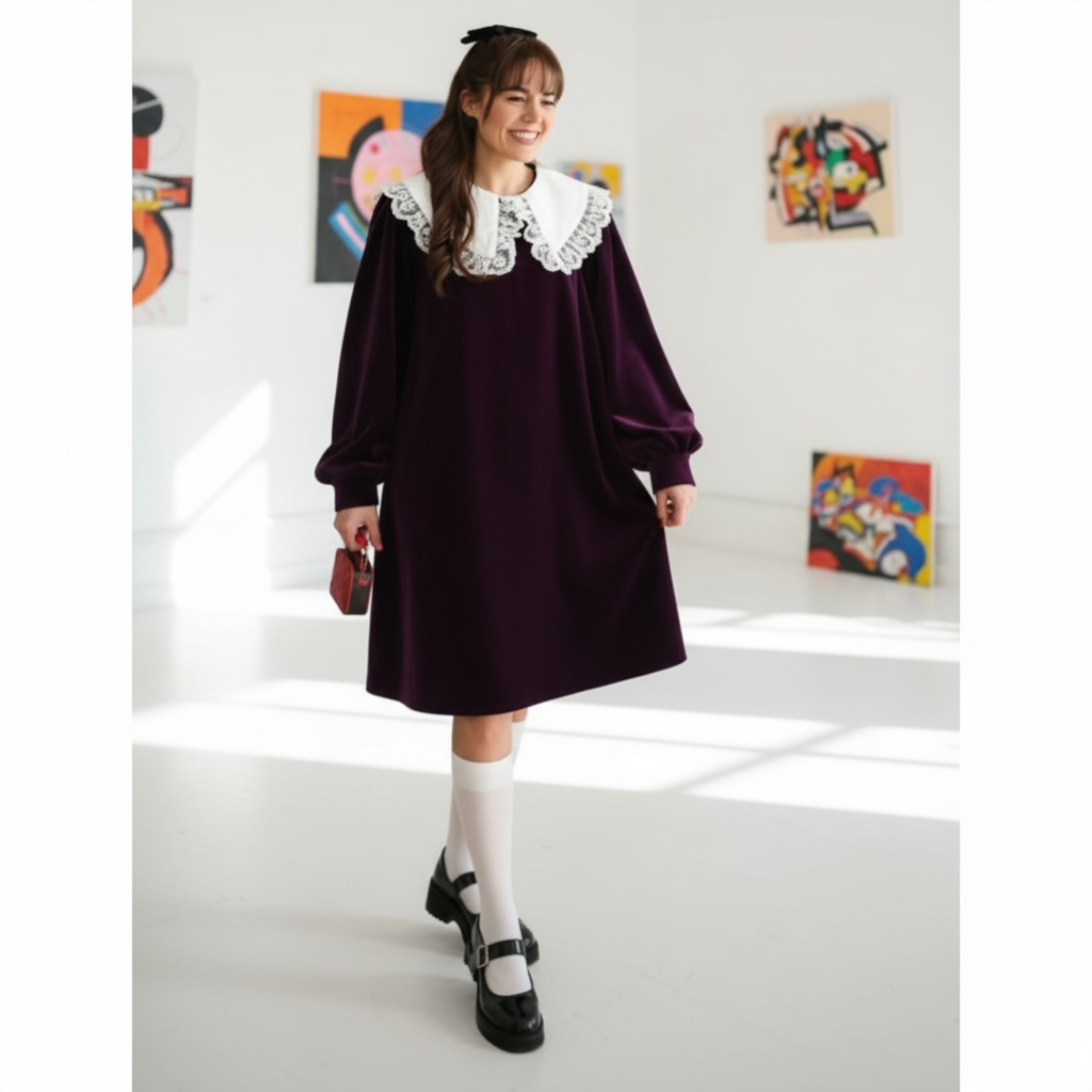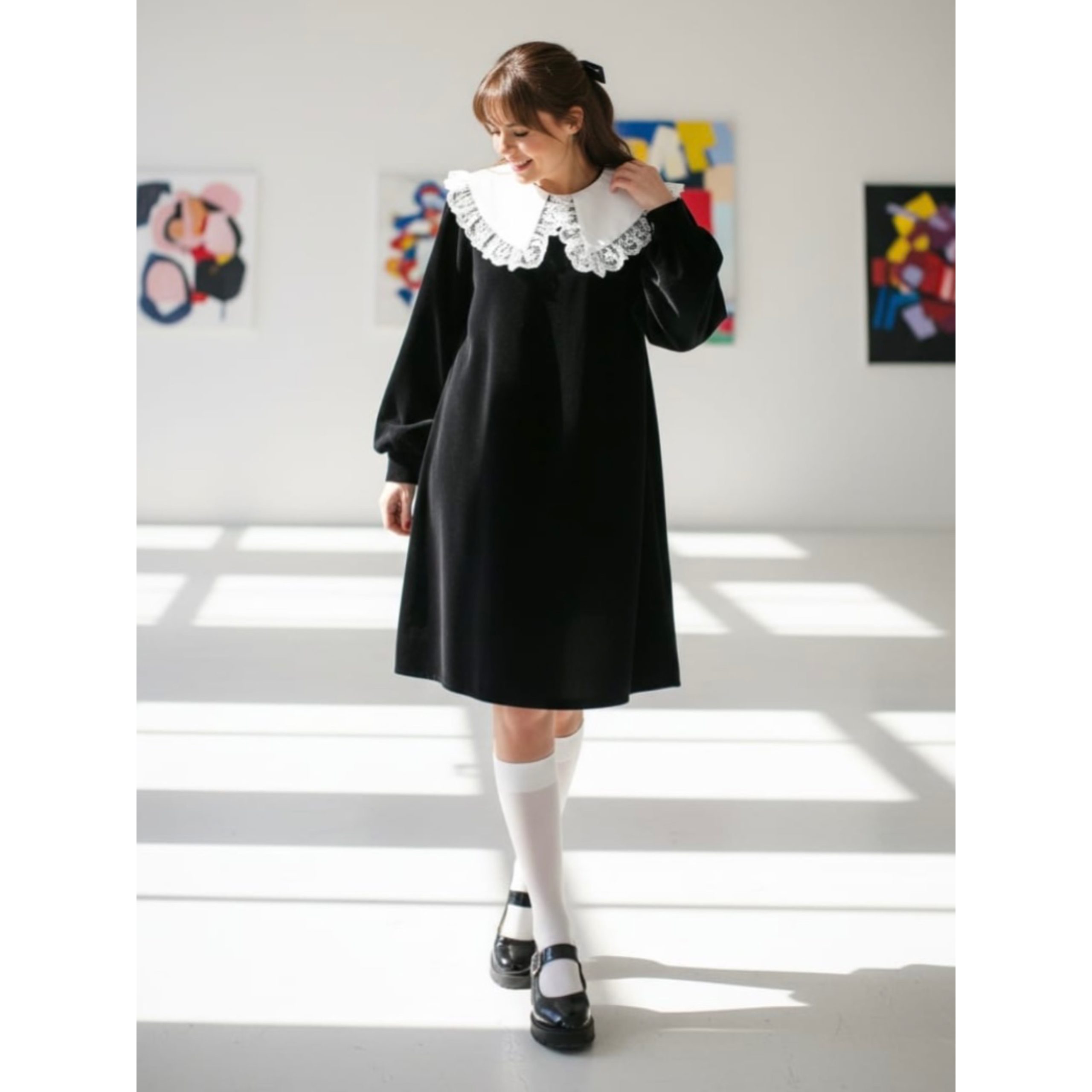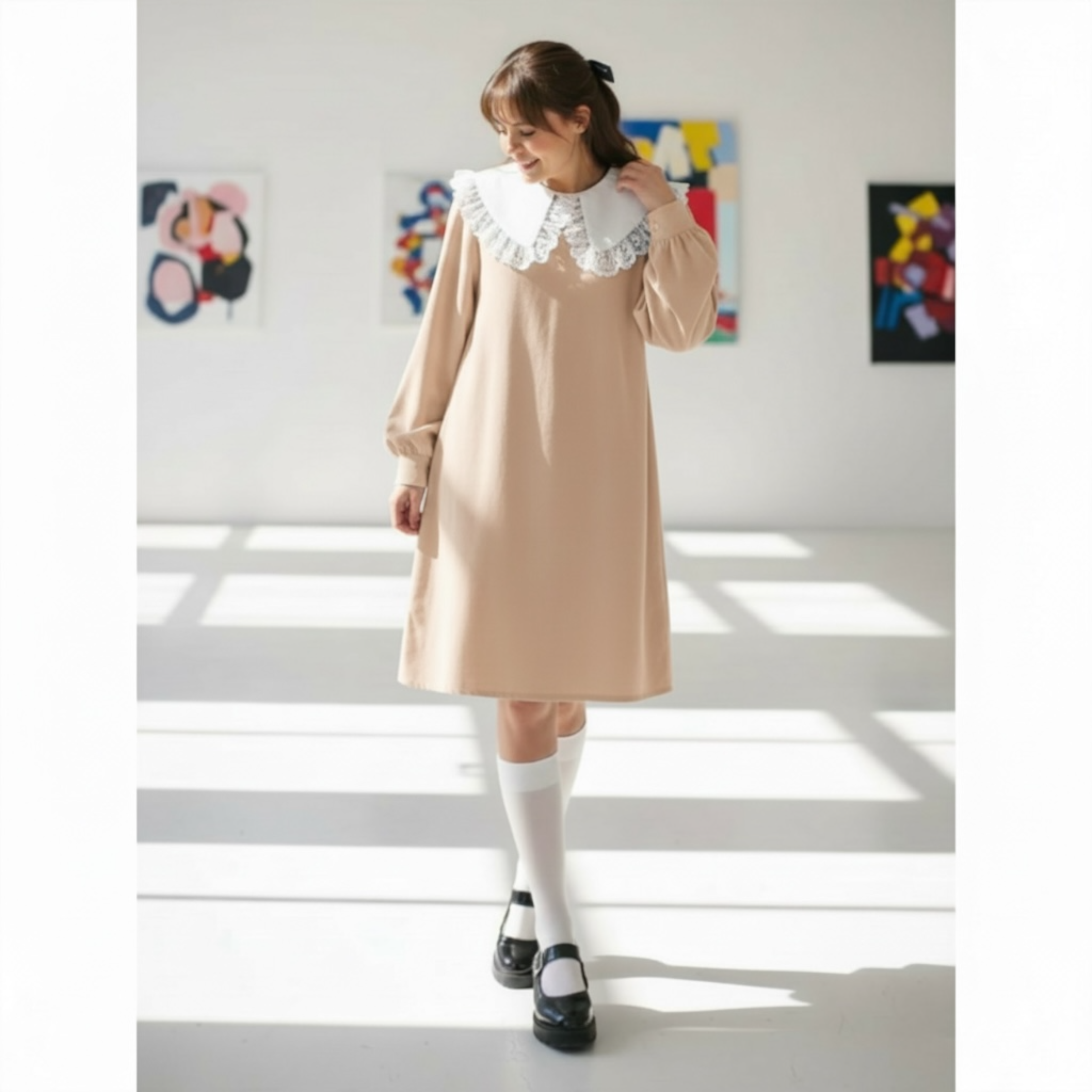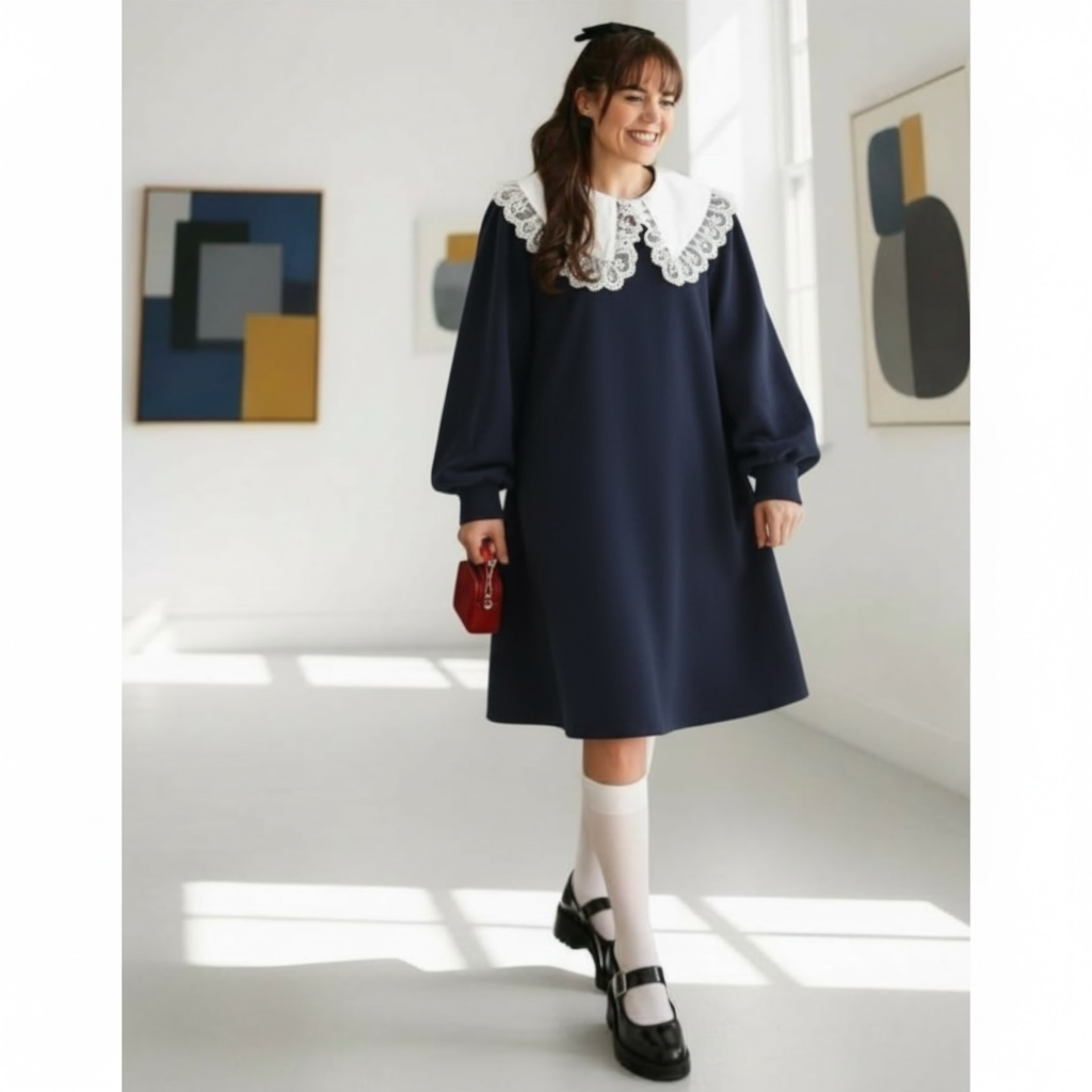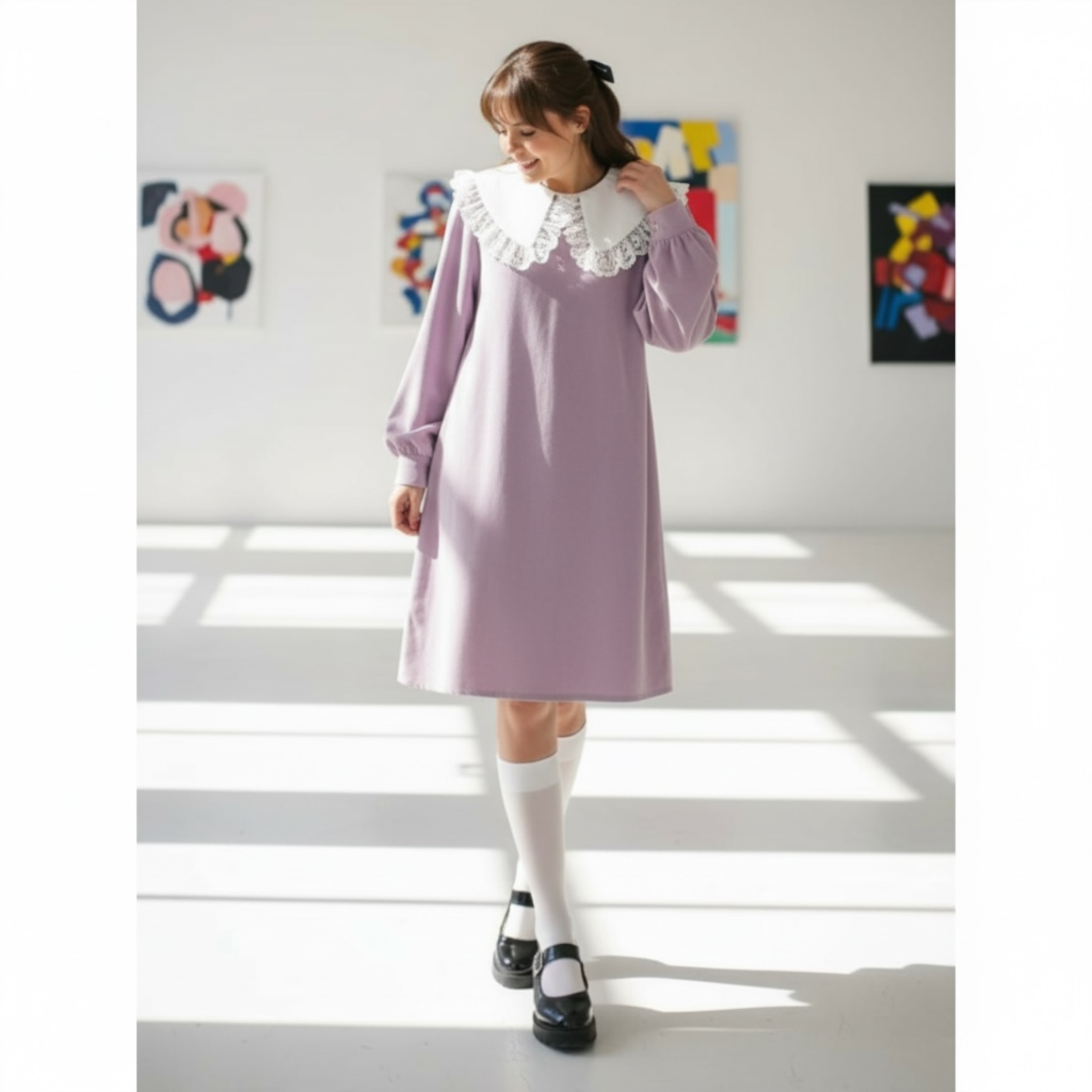 Rochia este confectionata din stofa, material plin. Gulerul nu este detasabil. Croi lejer. Lungime standard 95/100 cm