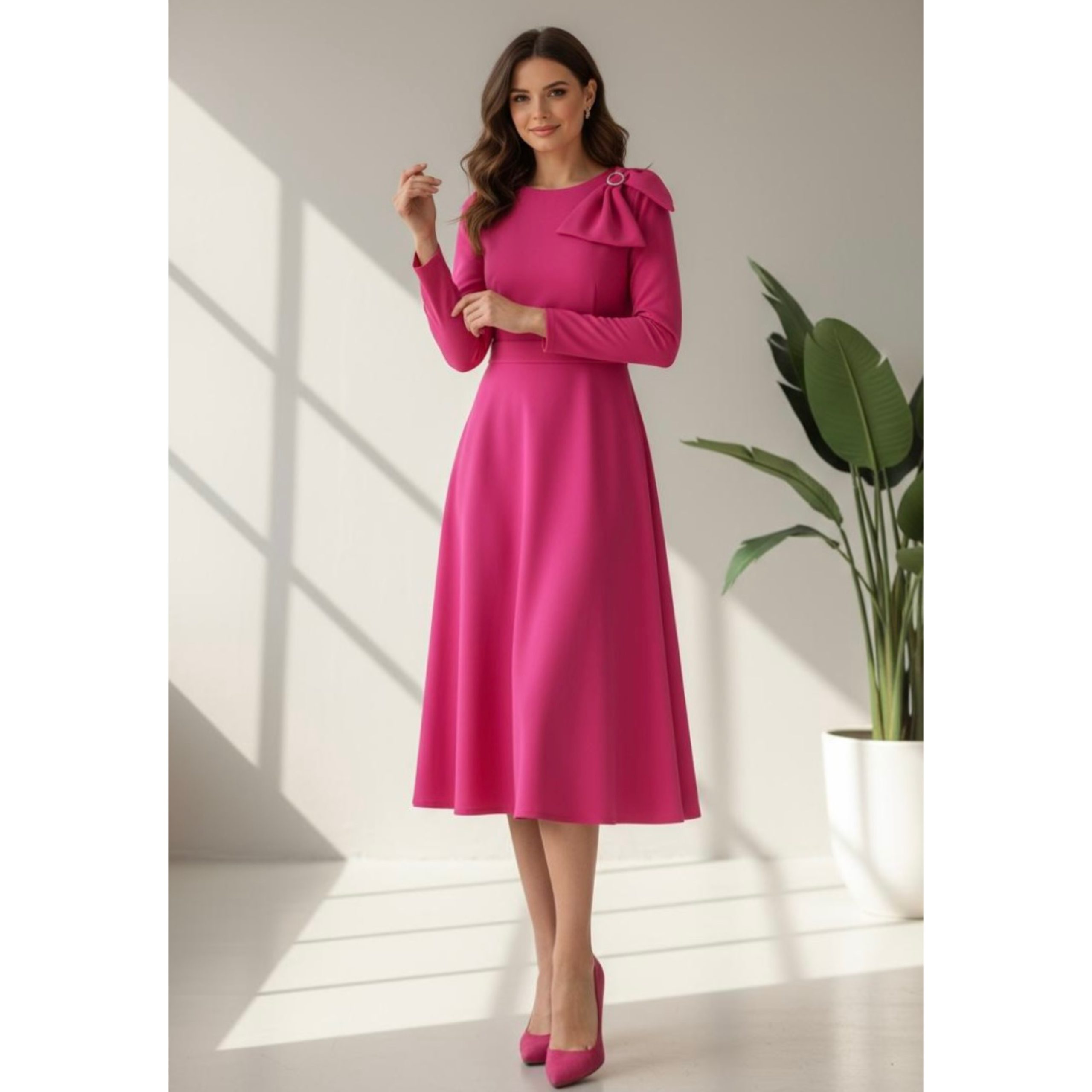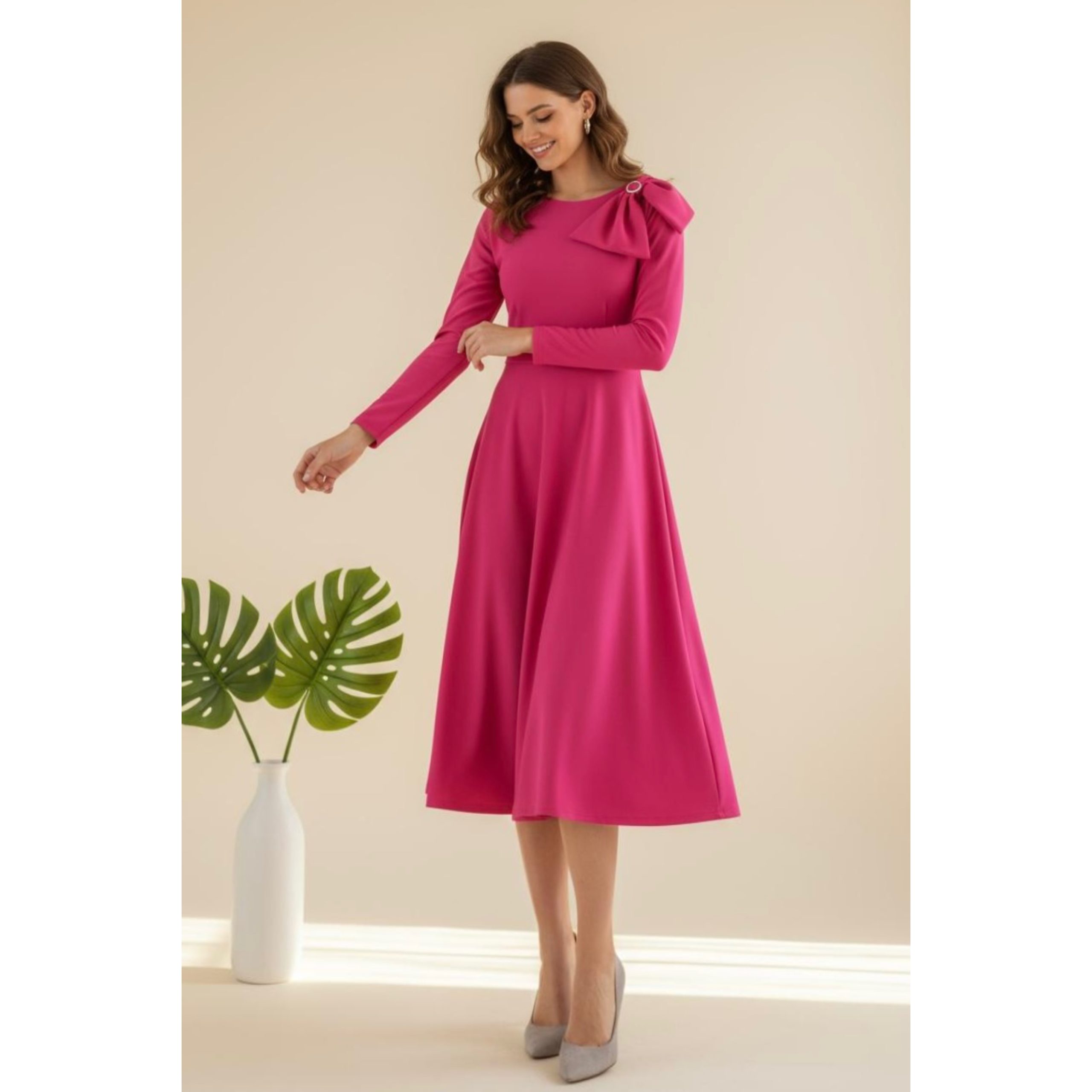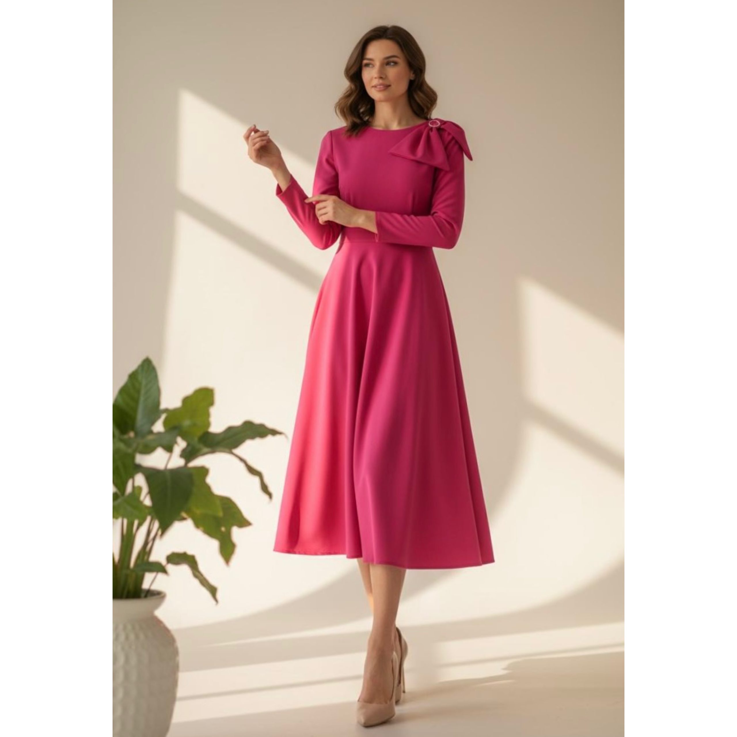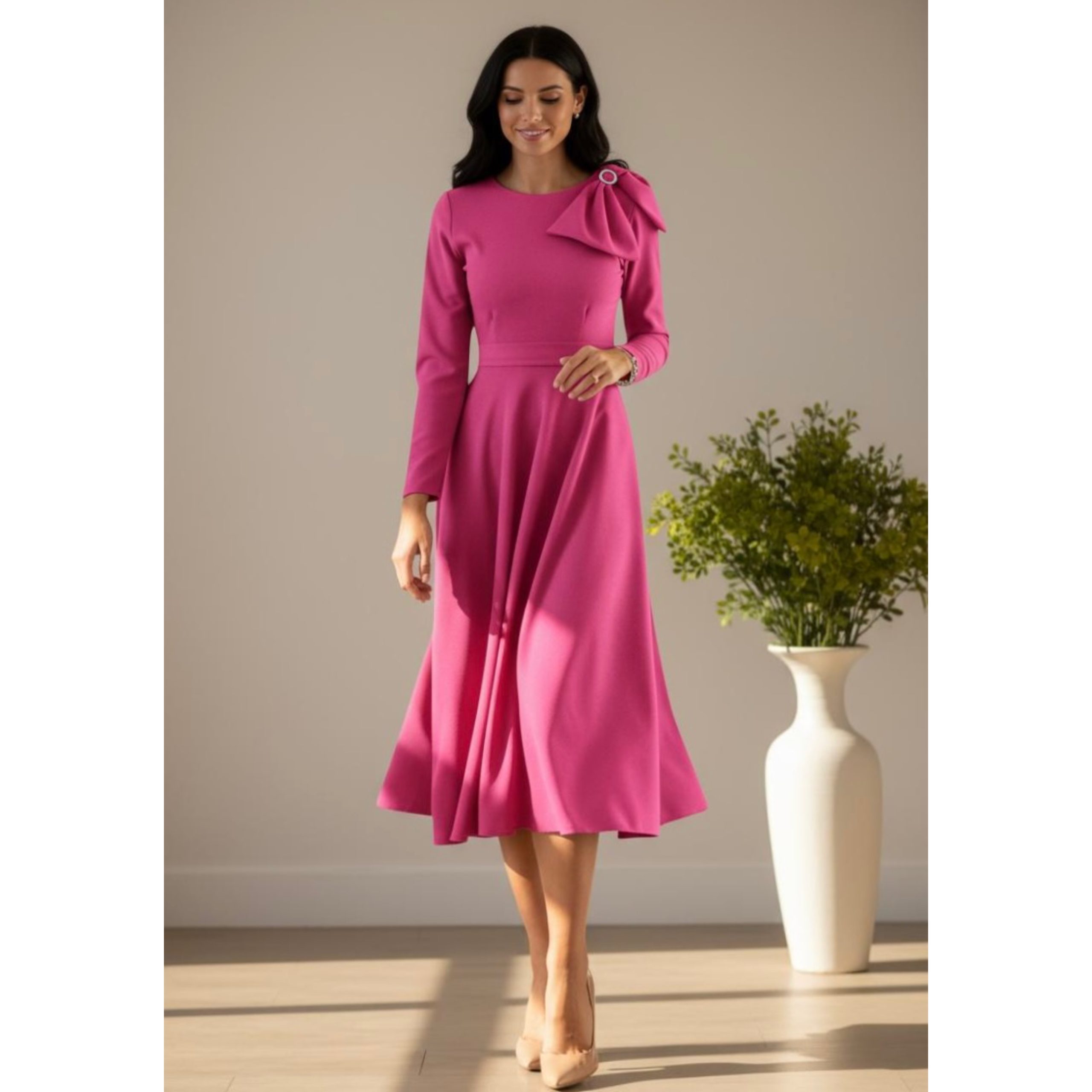 Rochia este confectionata din stofa barbie, material plin, usor elastic. Funda din piept este accesorizata cu o catarama cu pietricele si nu este detasabila.