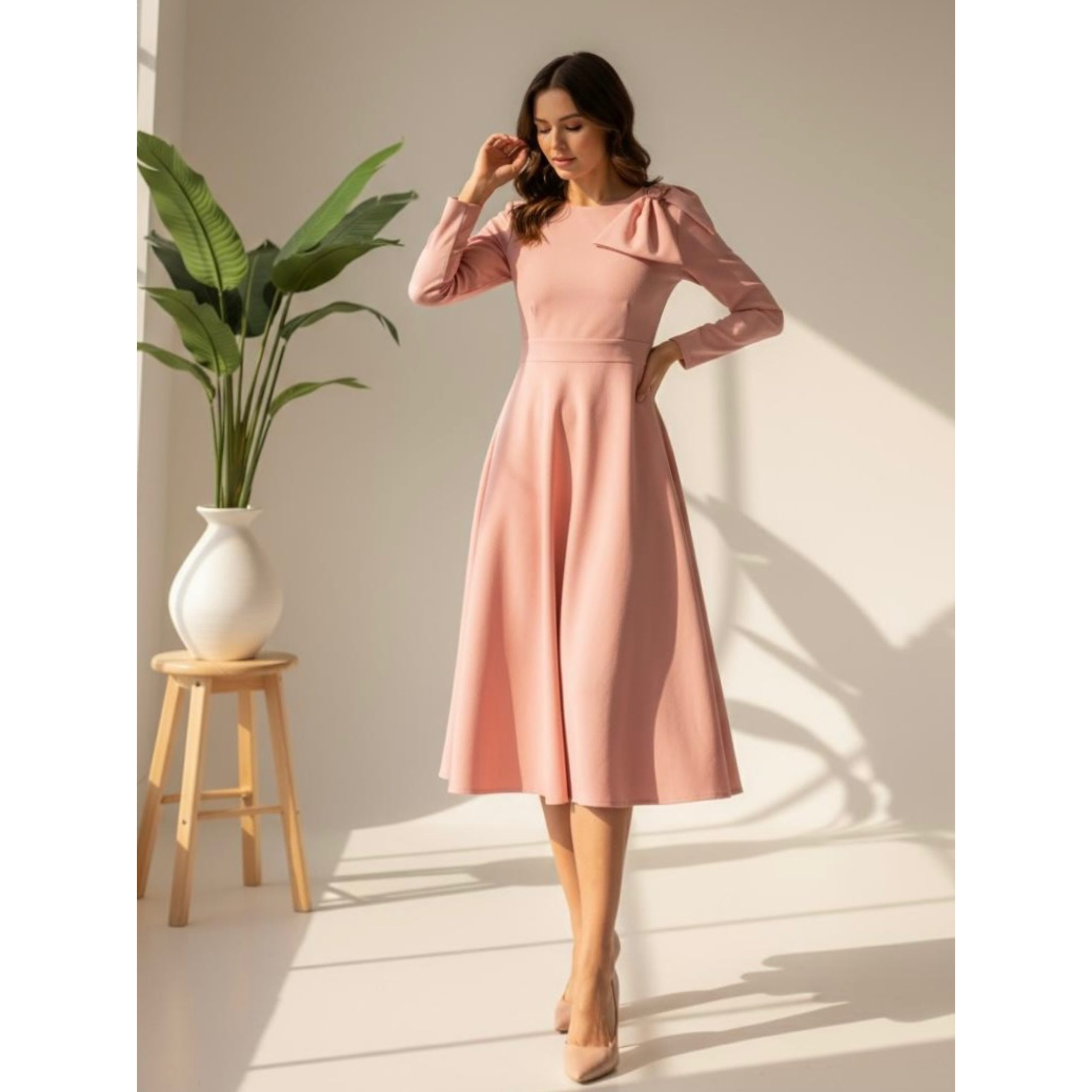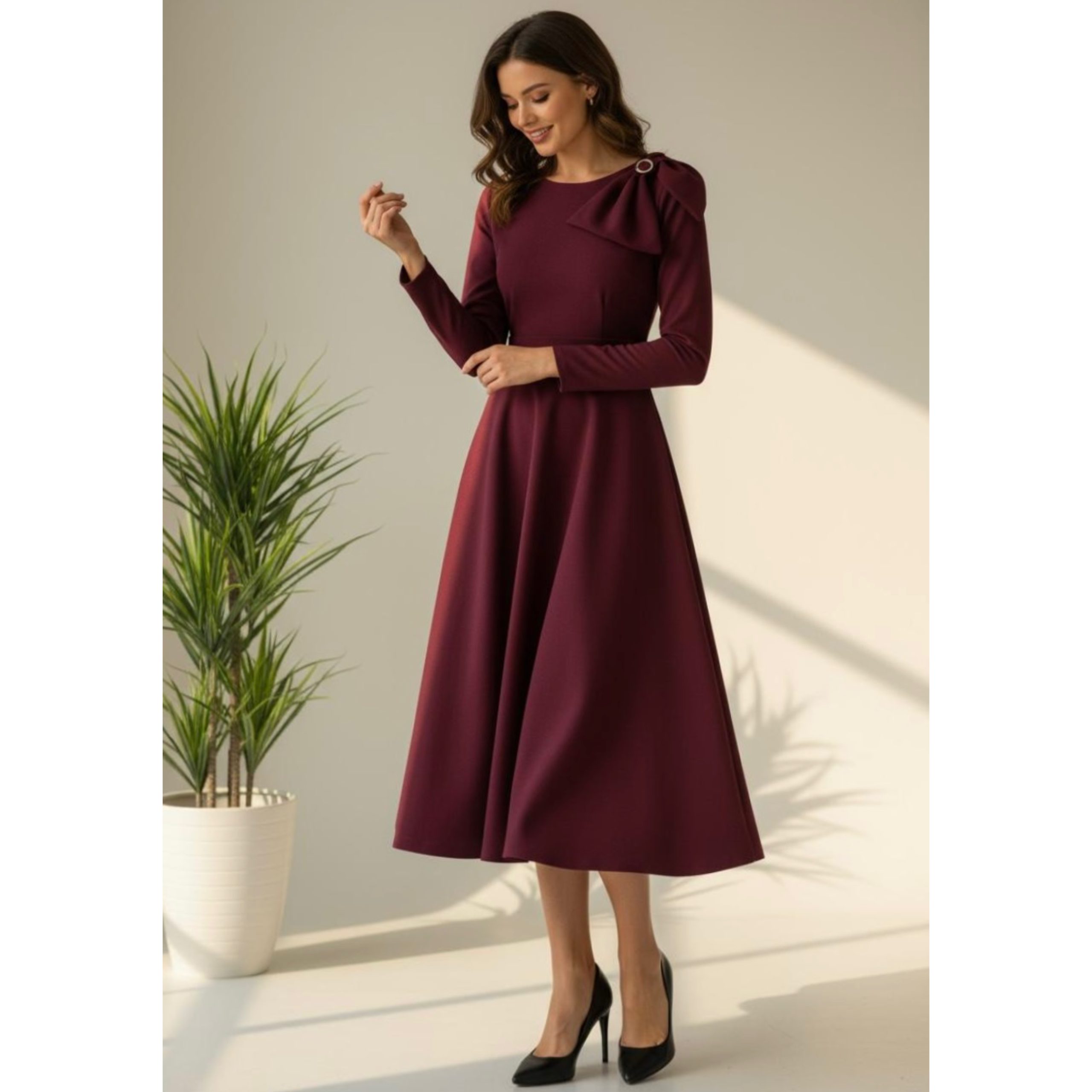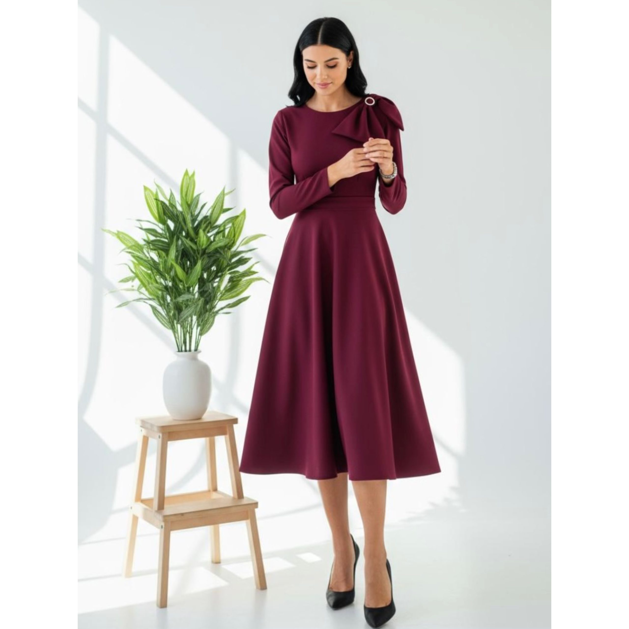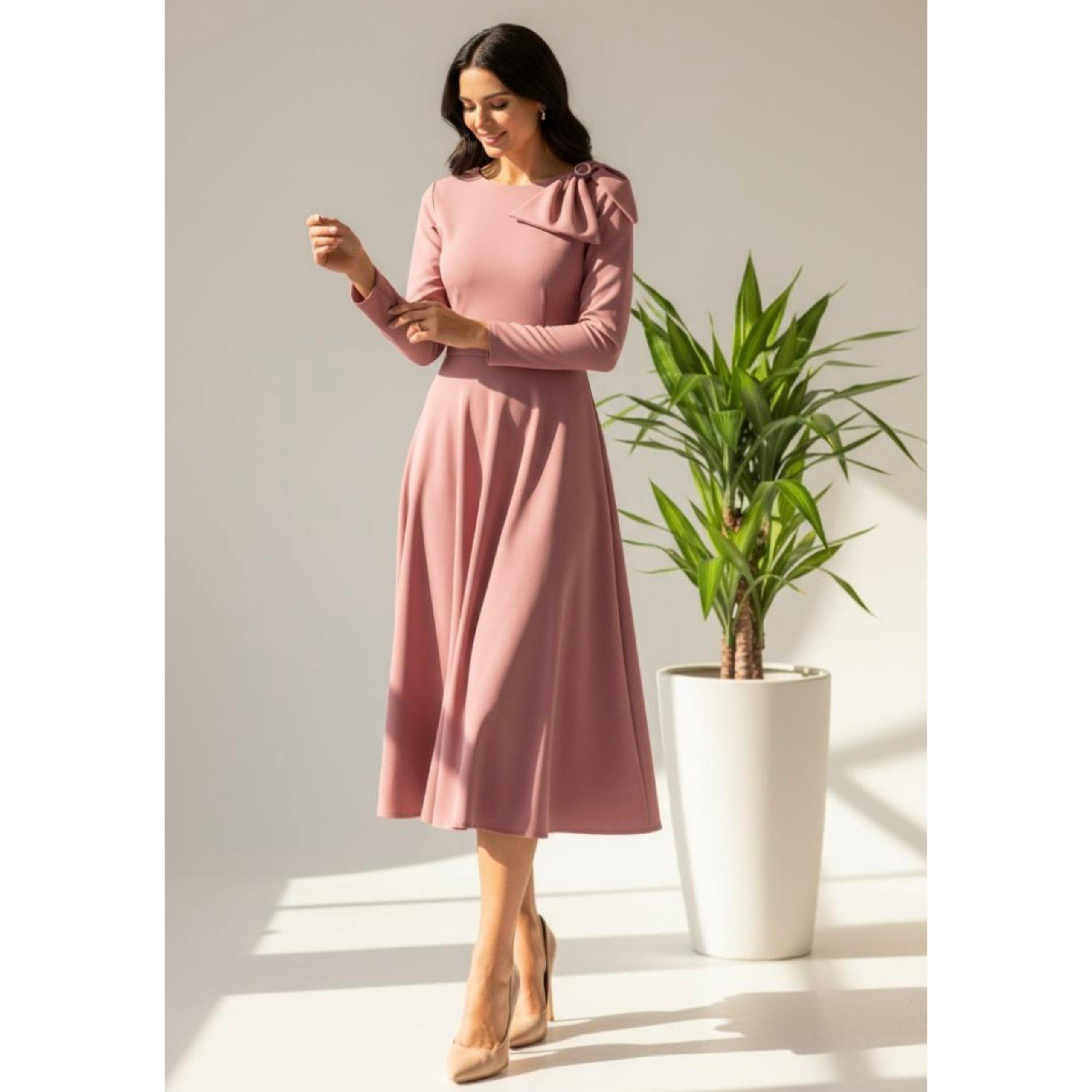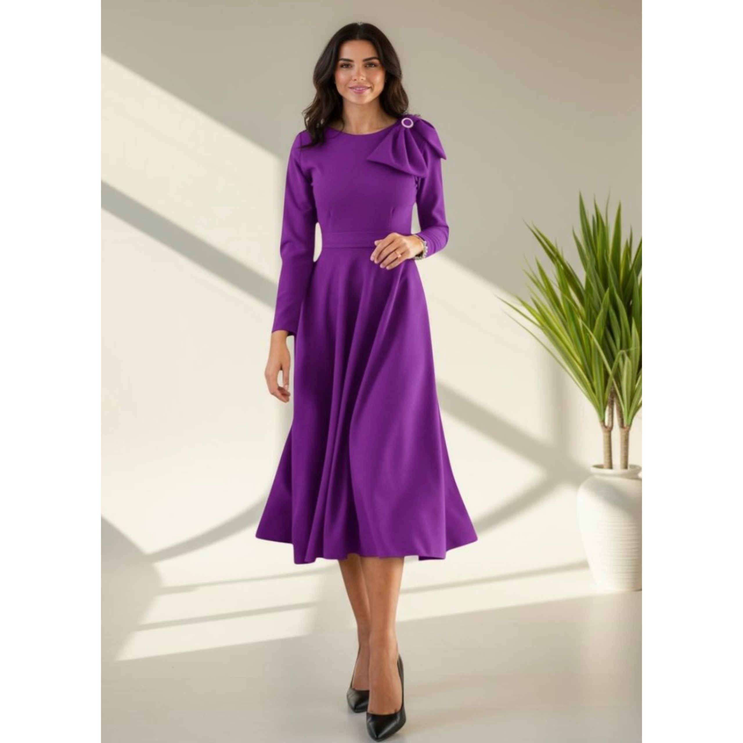 Rochia este confectionata din stofa barbie, material plin, usor elastic. Funda din piept este accesorizata cu o catarama cu pietricele si nu este detasabila.