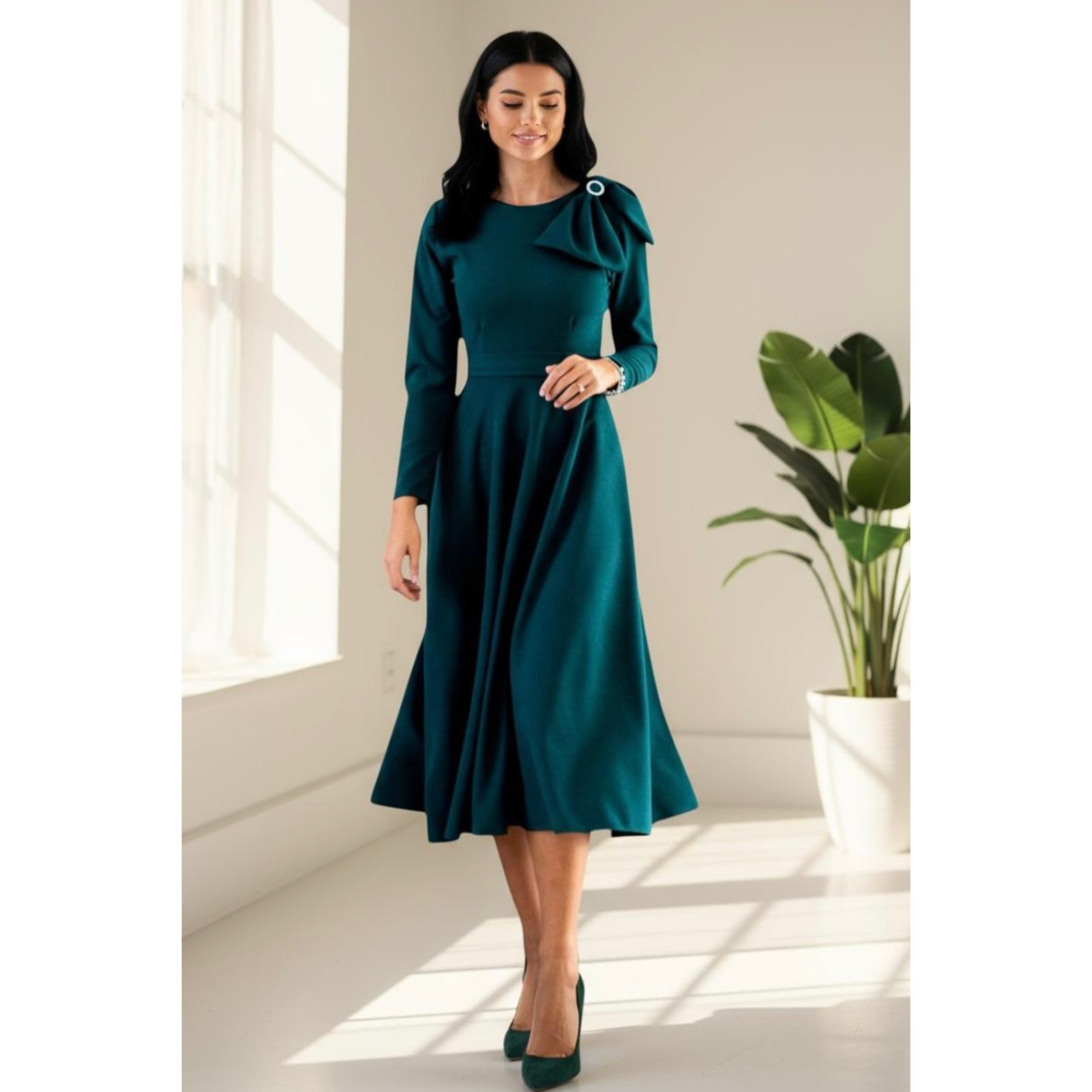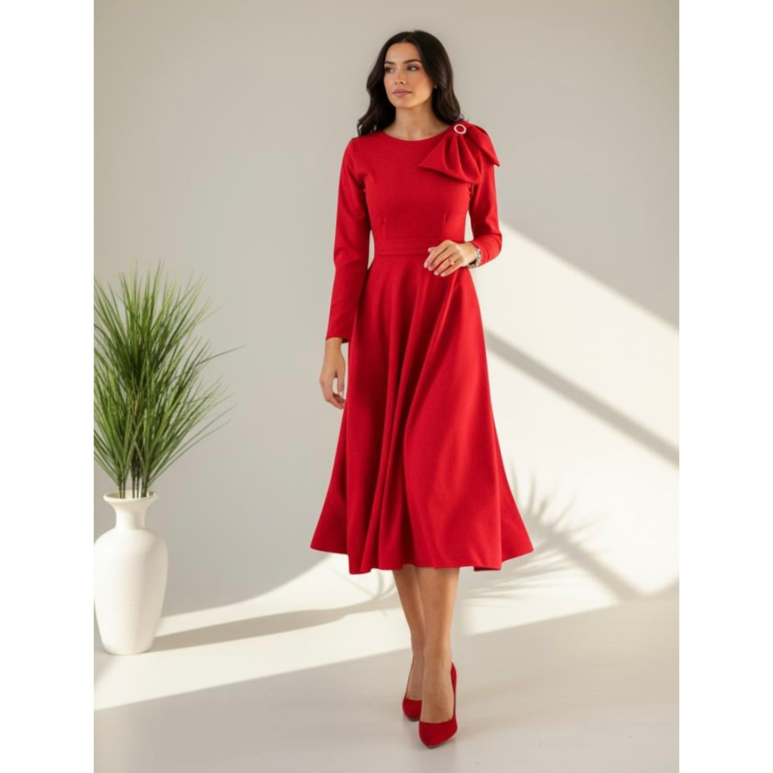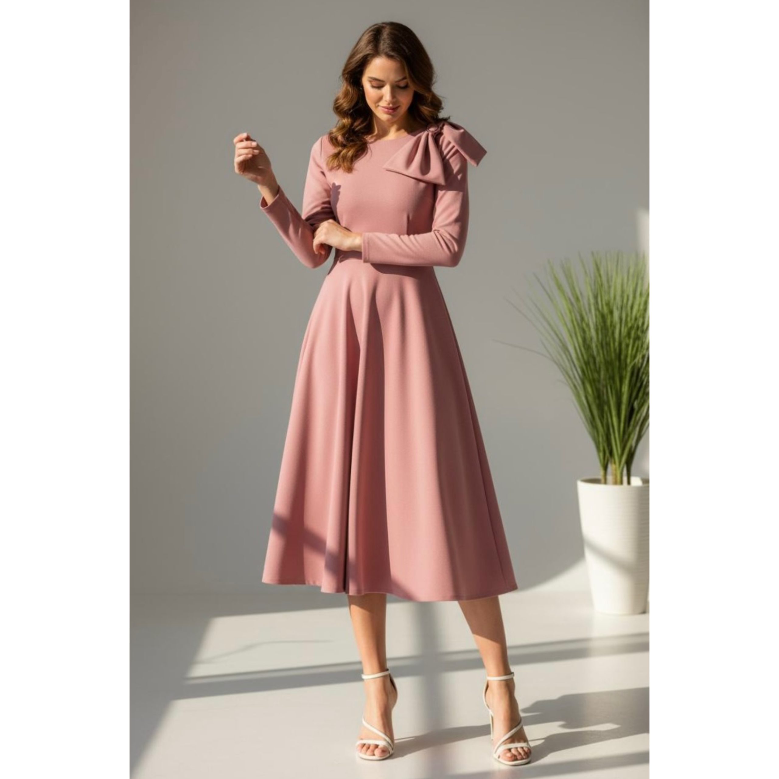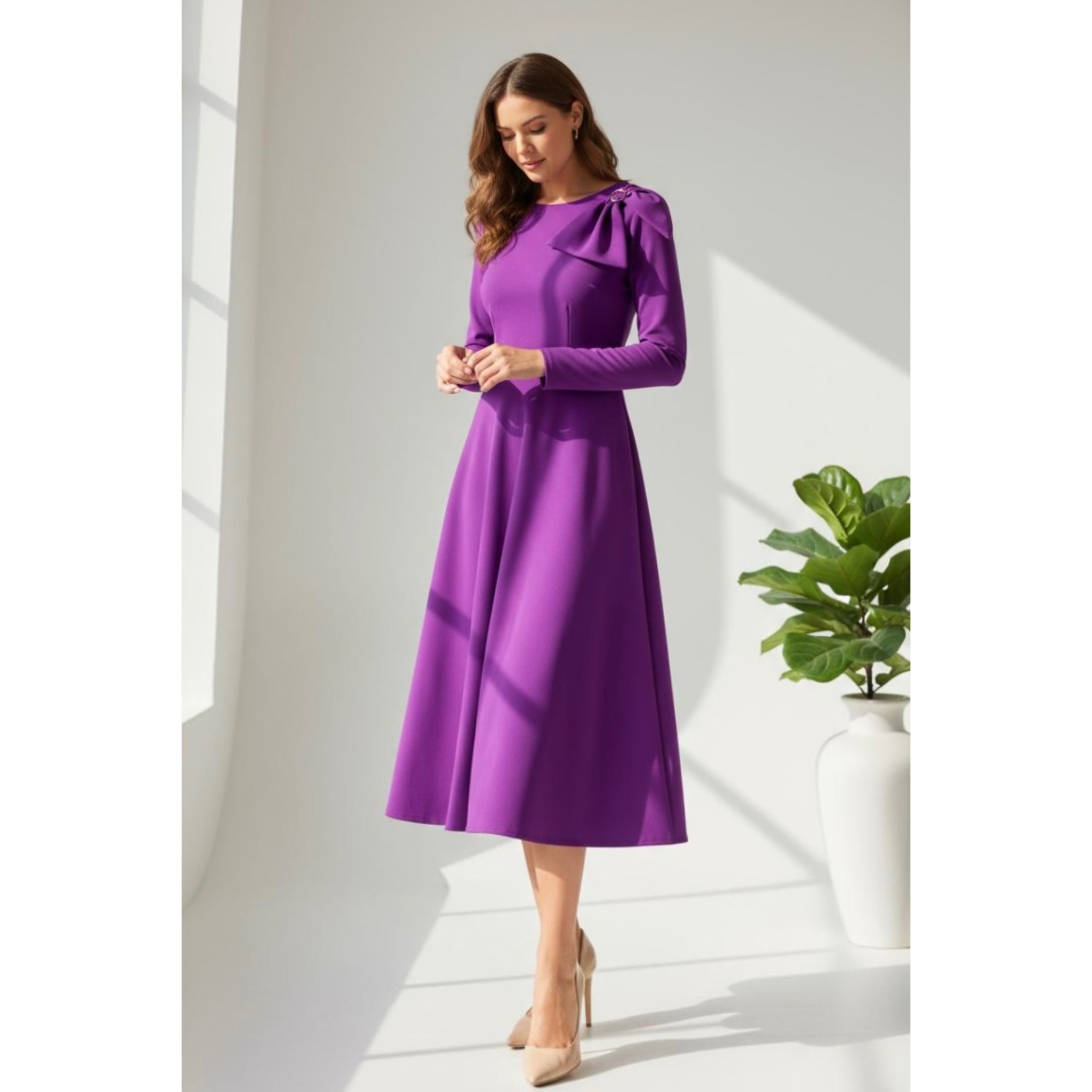Rochia este confectionata din stofa barbie, material plin, usor elastic. Funda din piept este accesorizata cu o catarama cu pietricele si nu este detasabila.