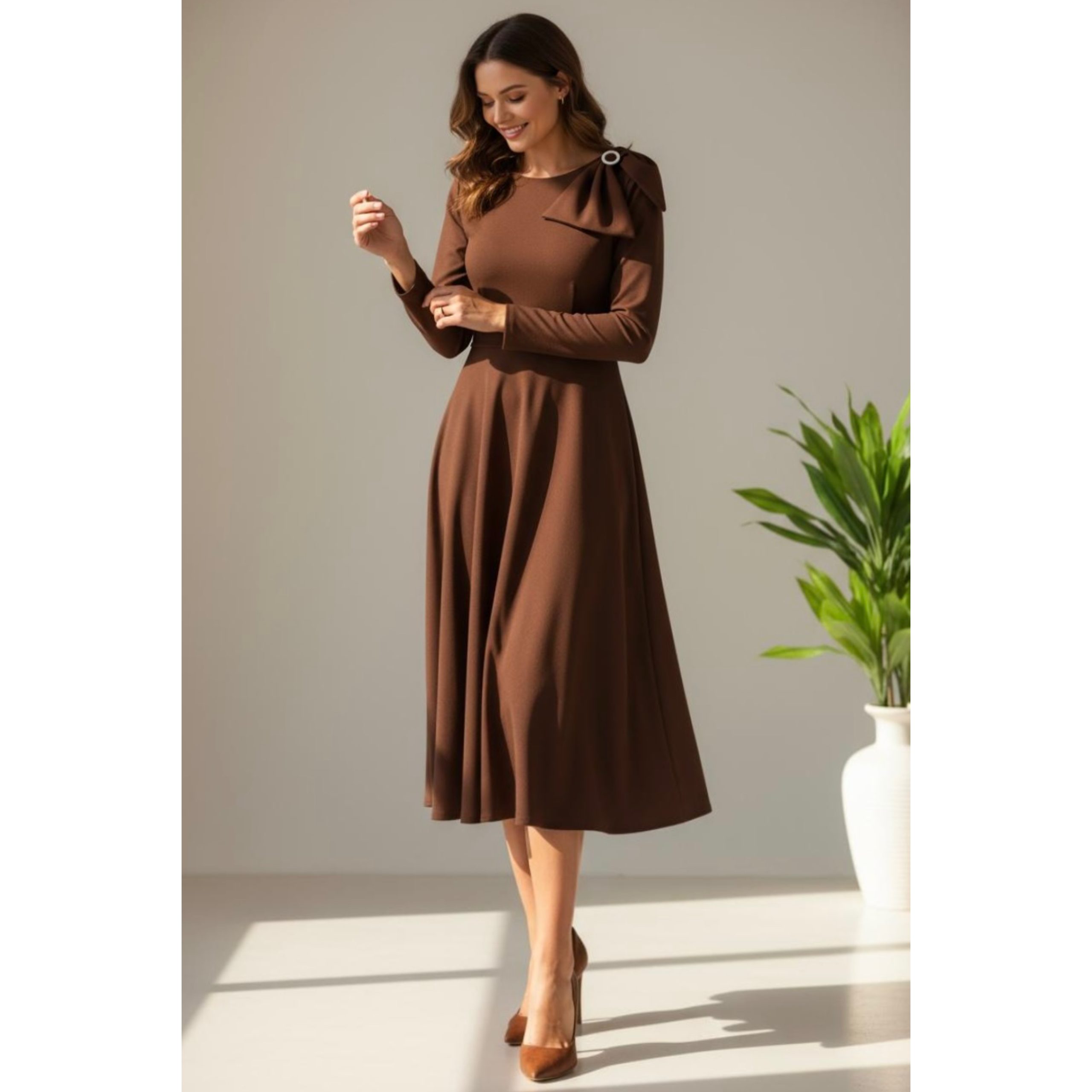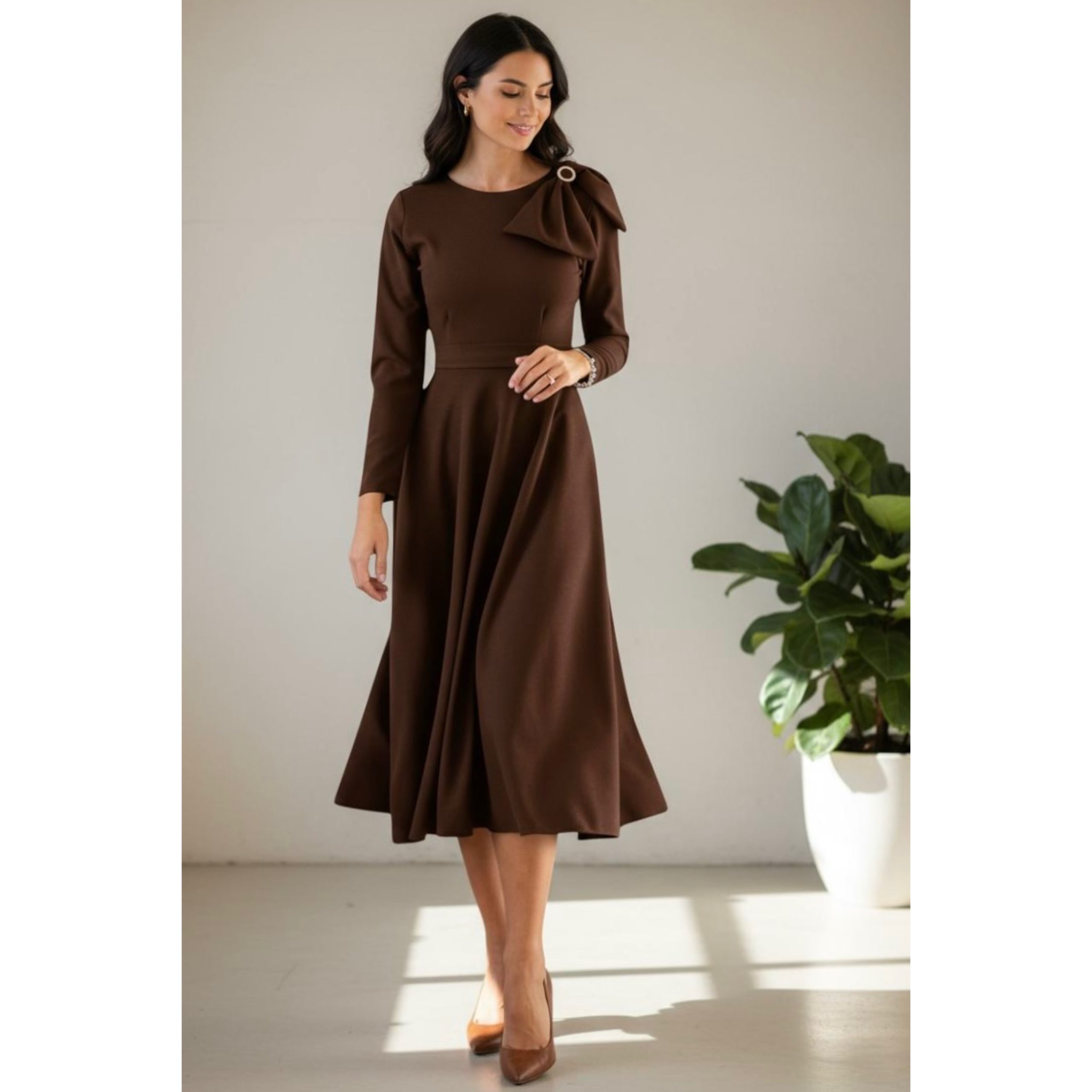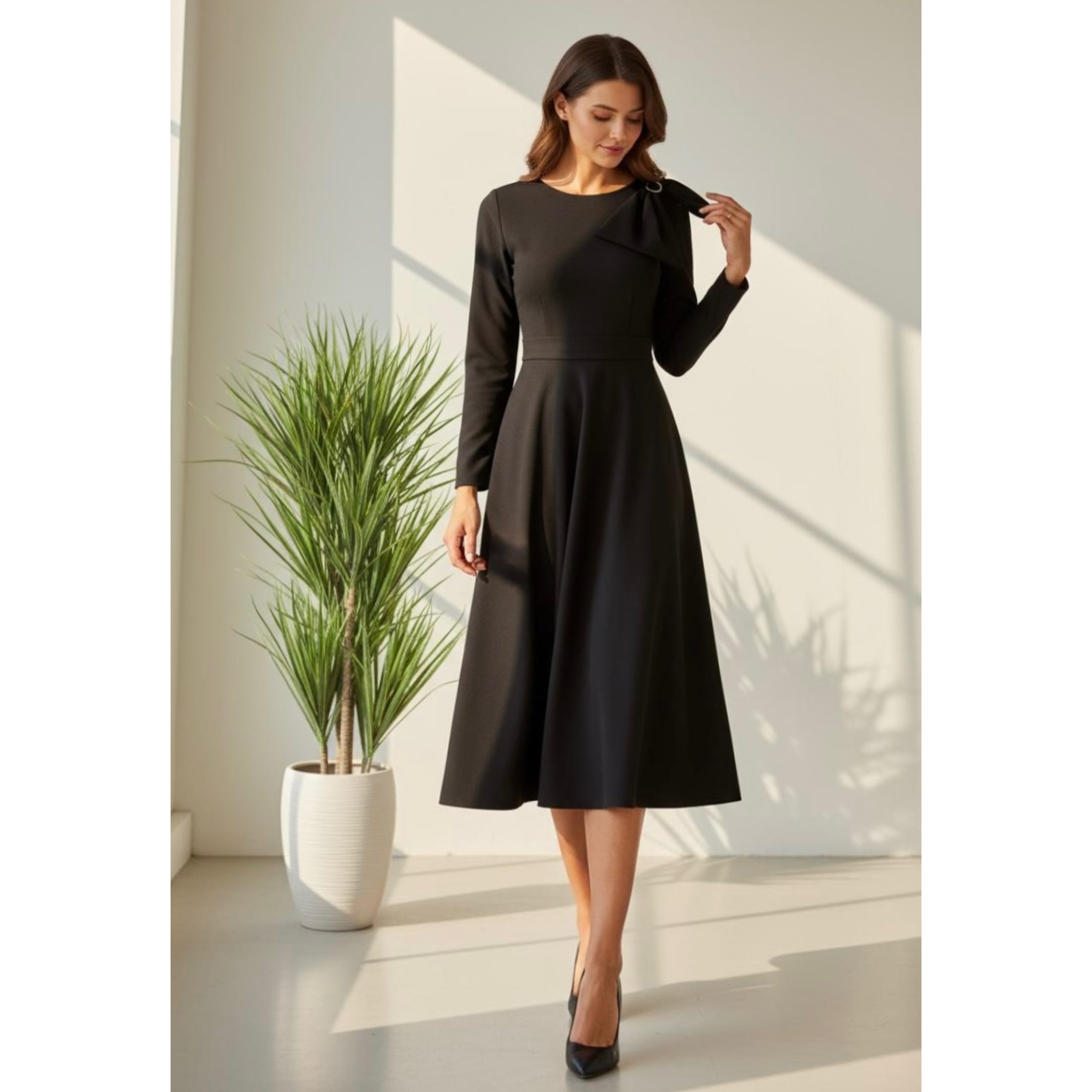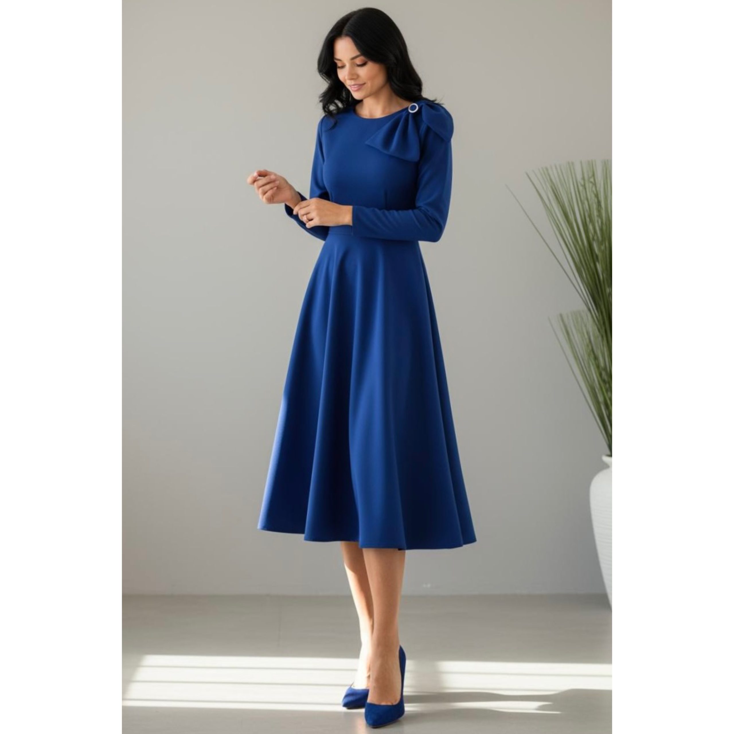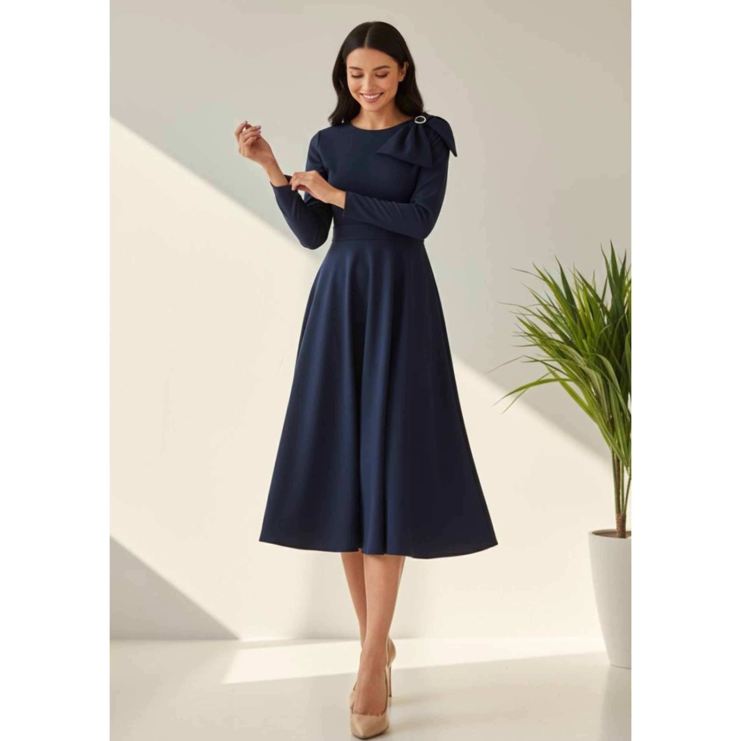 Rochia este confectionata din stofa barbie, material plin, usor elastic. Funda din piept este accesorizata cu o catarama cu pietricele si nu este detasabila.