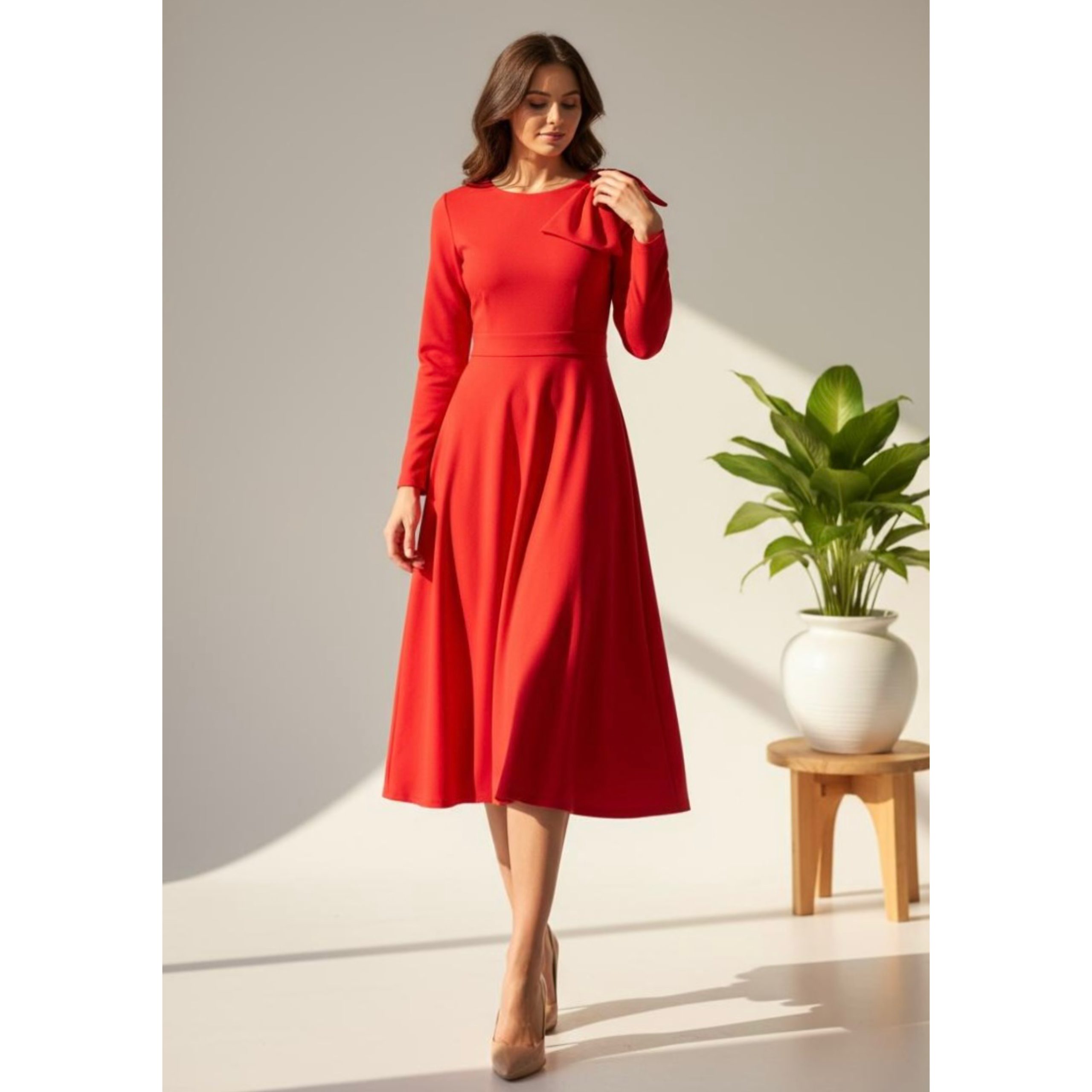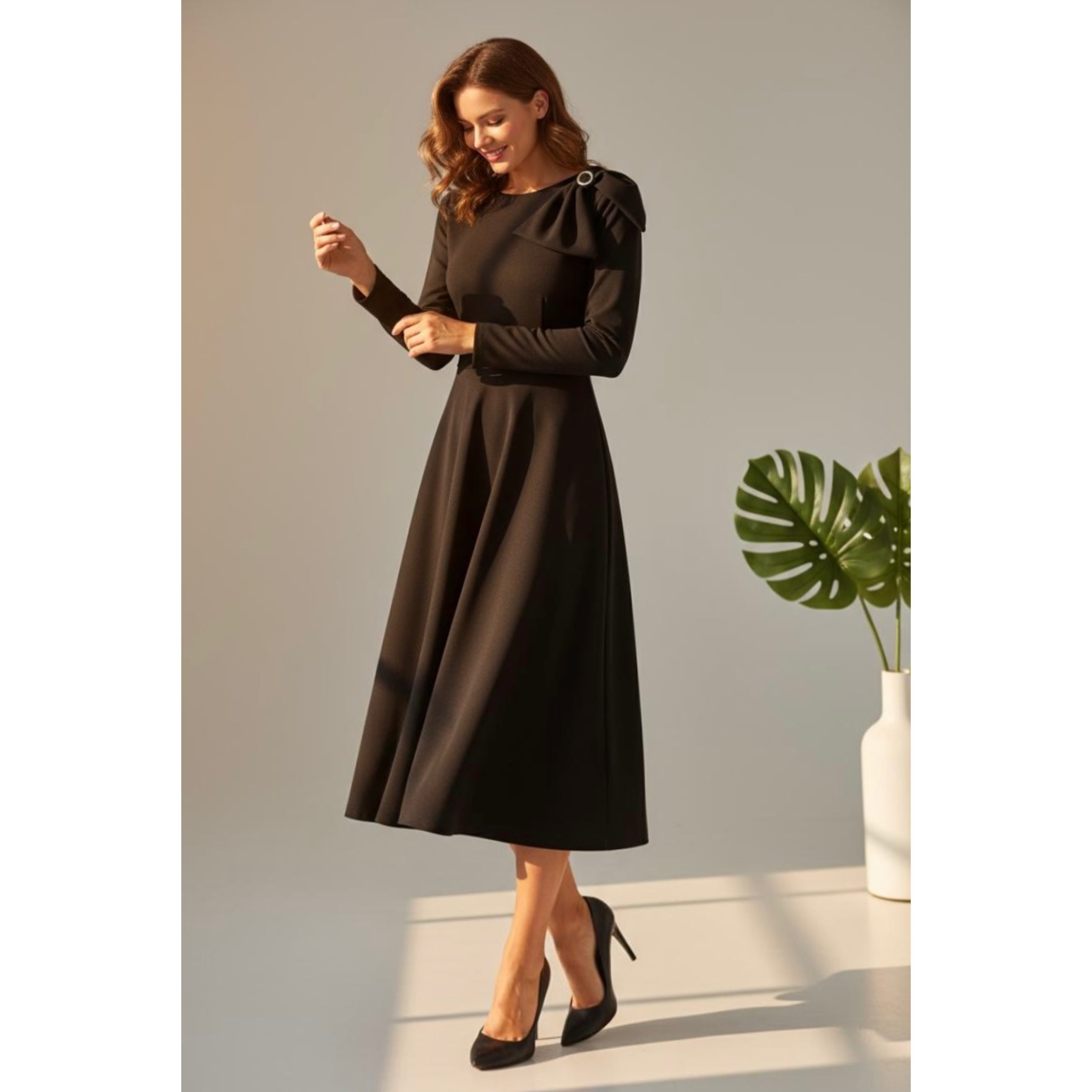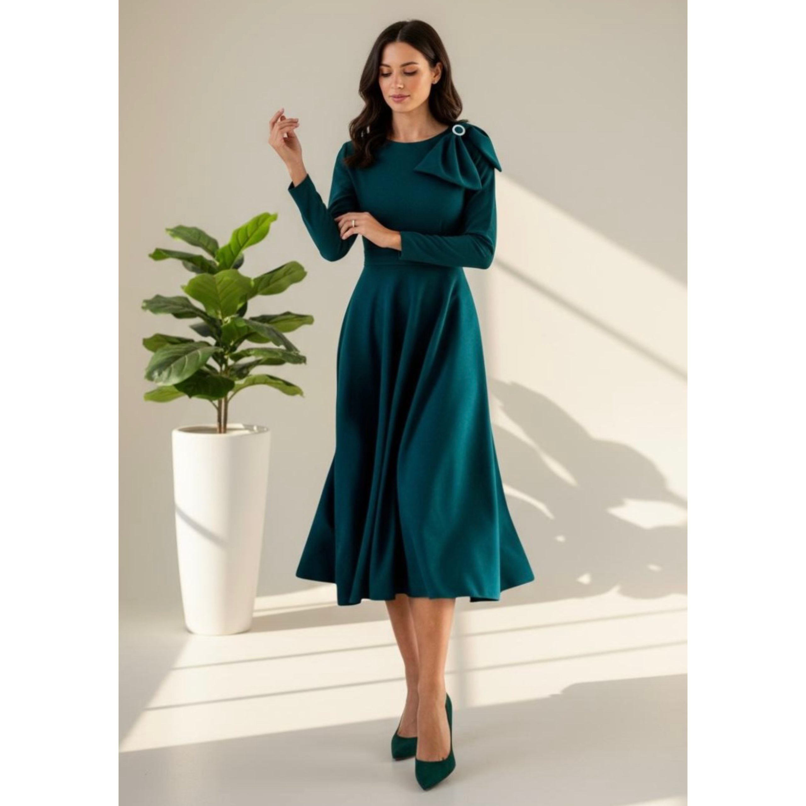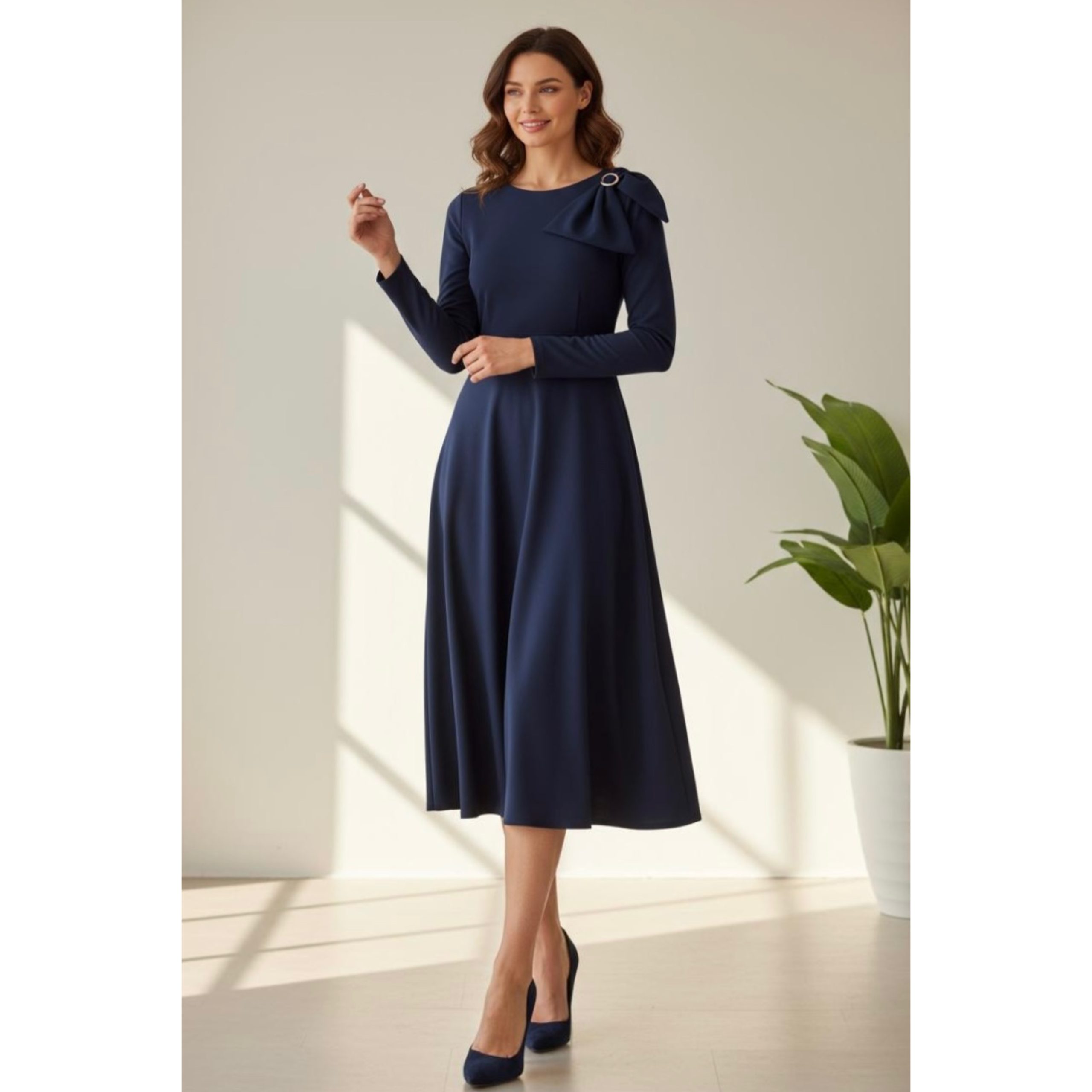 Rochia este confectionata din stofa barbie, material plin, usor elastic. Funda din piept este accesorizata cu o catarama cu pietricele si nu este detasabila.