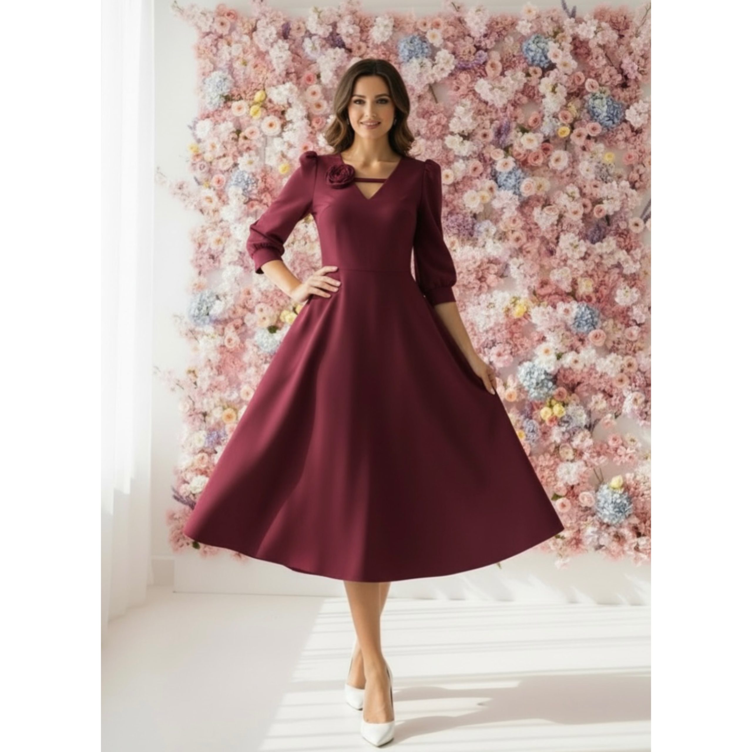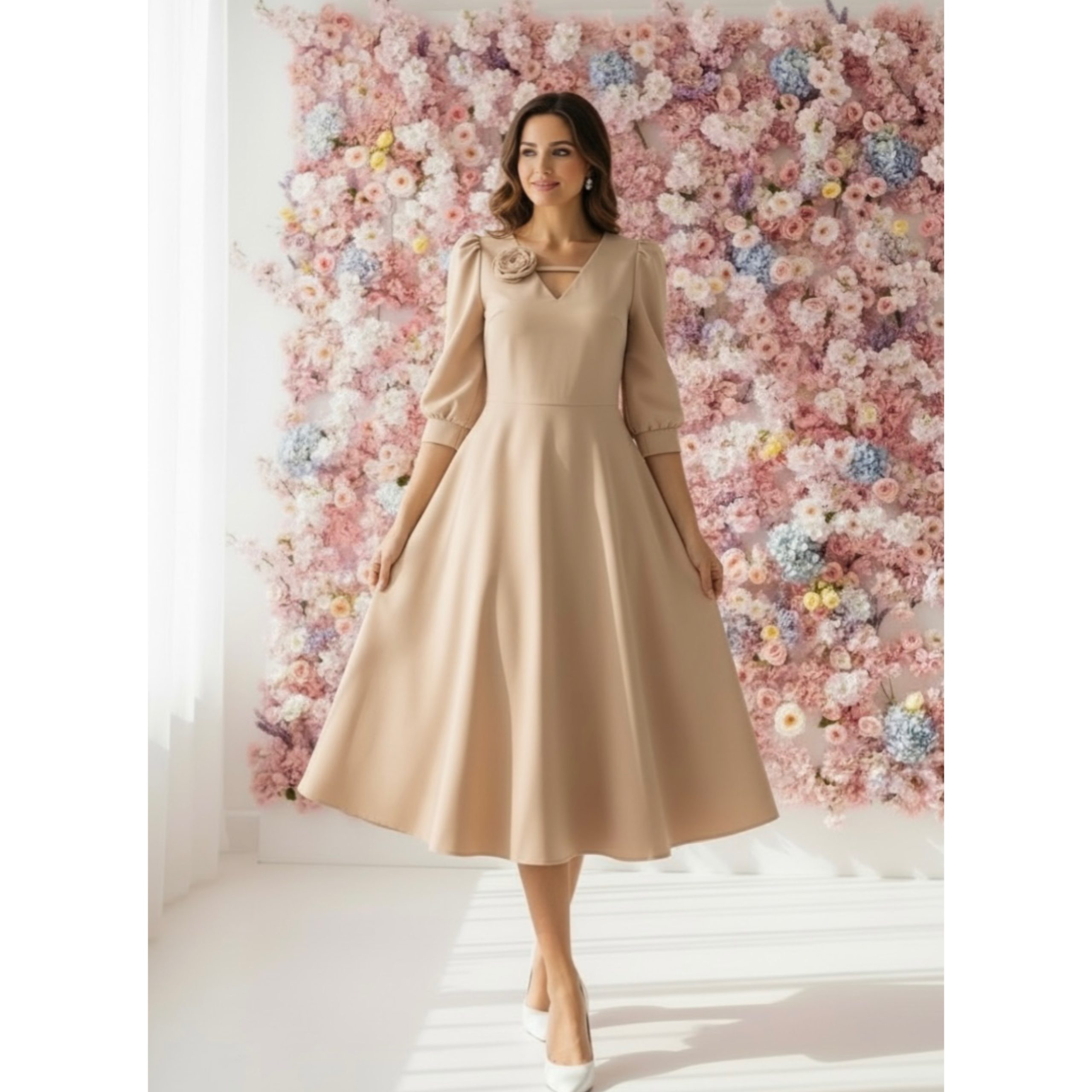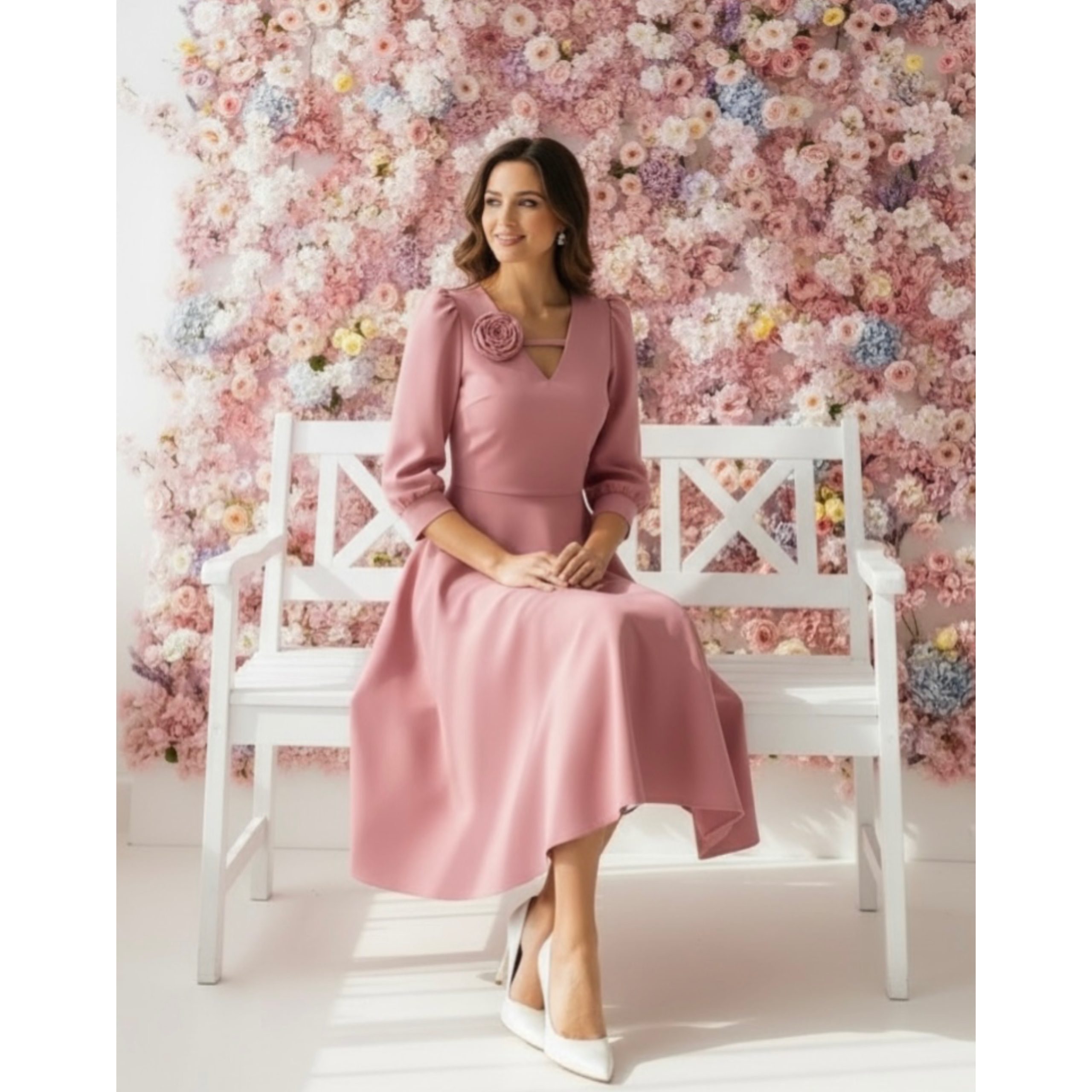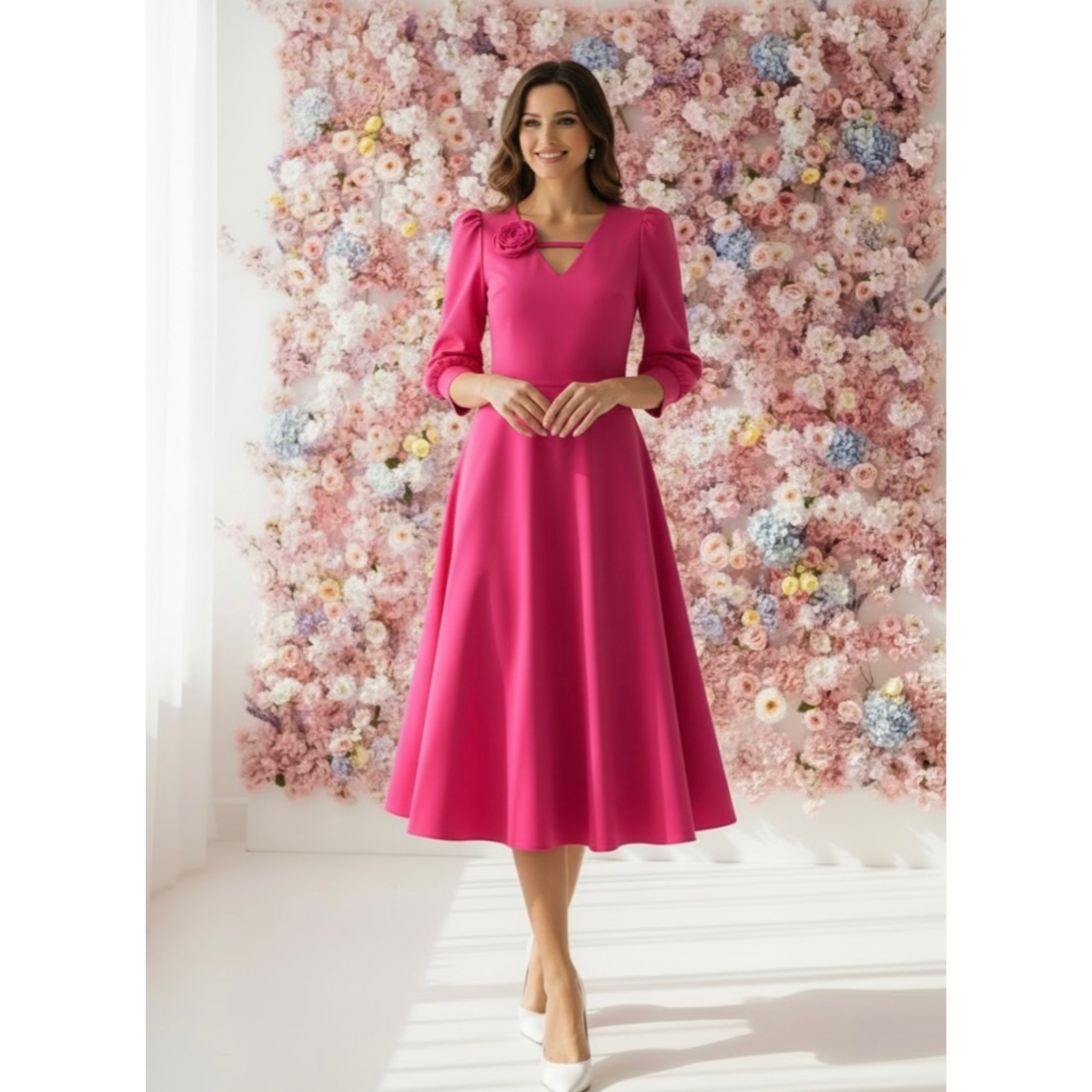 Rochia este confectionata din stofa barbie, material plin, usor elastic.