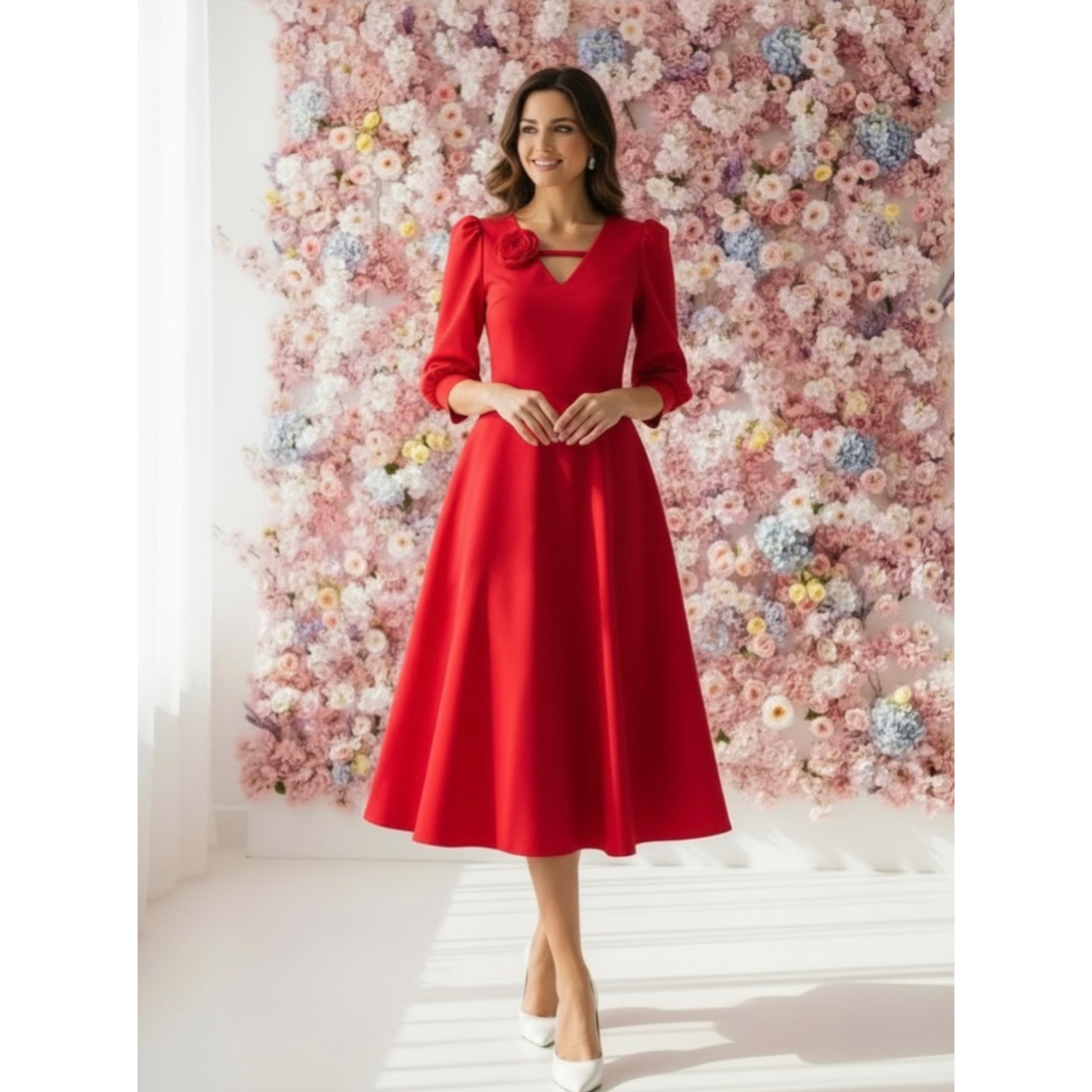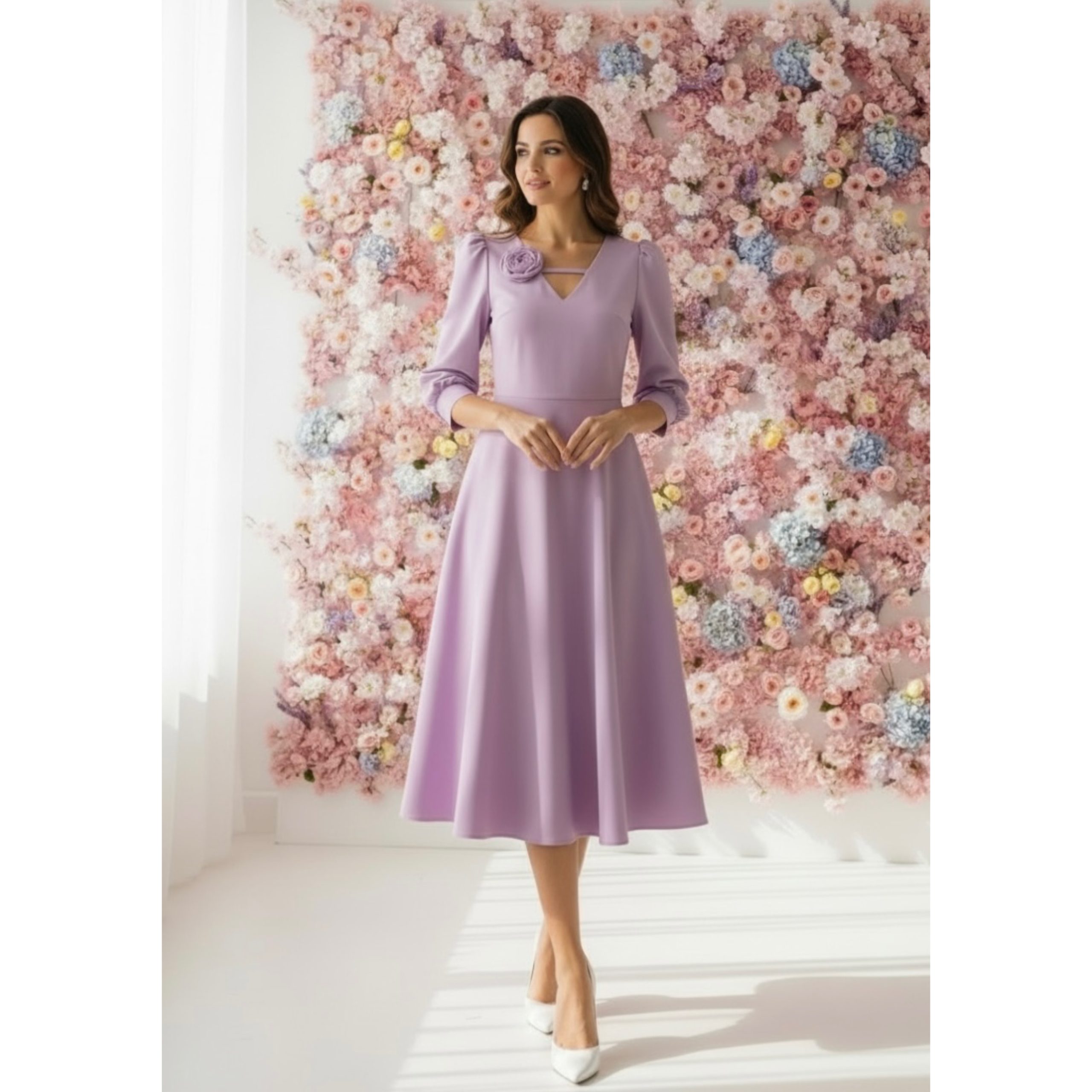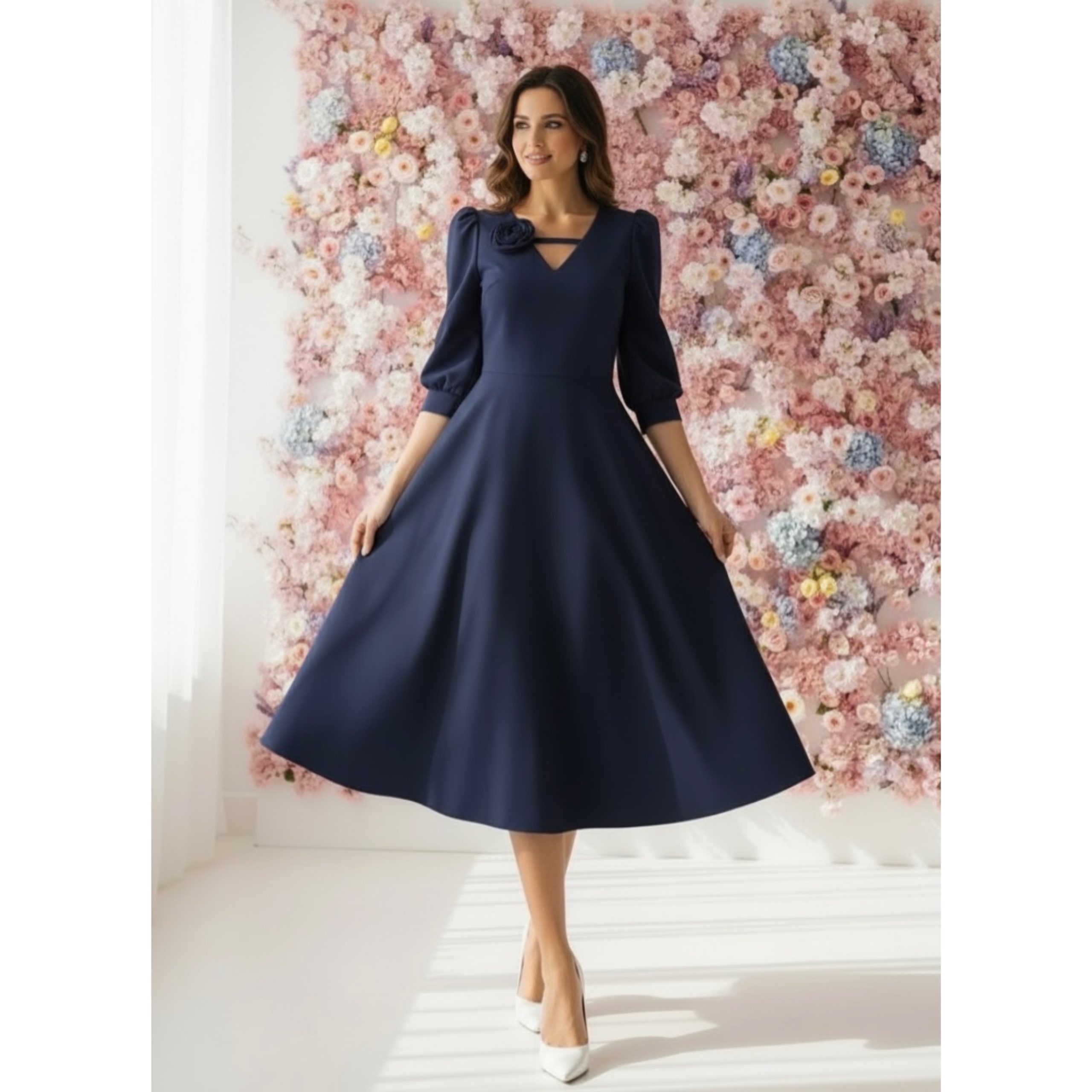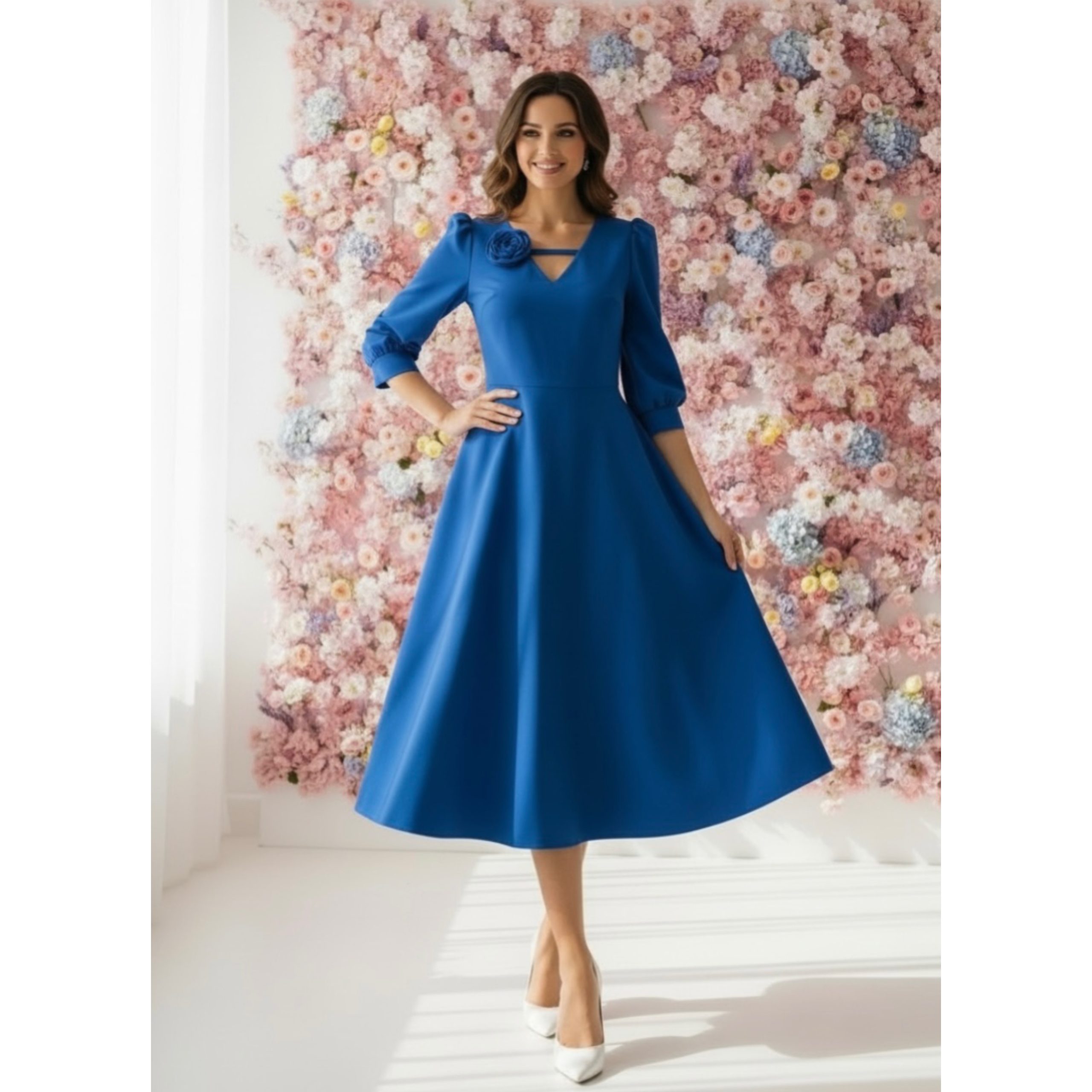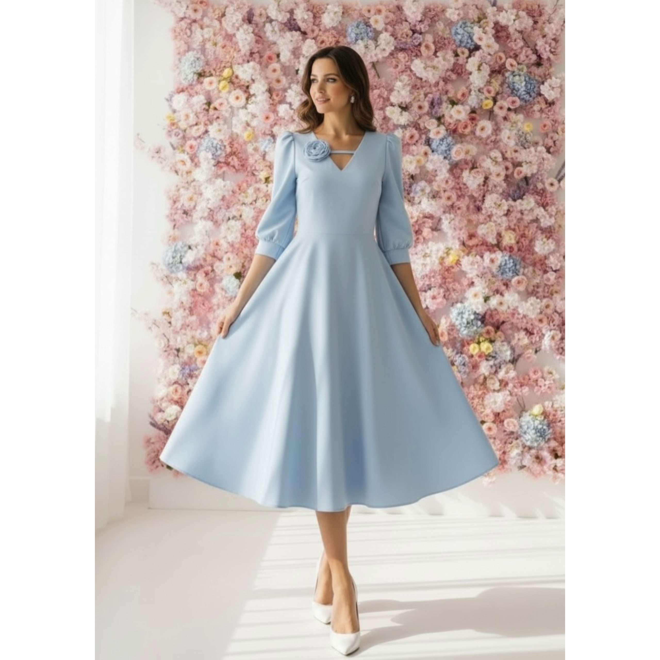 Rochia este confectionata din stofa barbie, material plin, usor elastic.