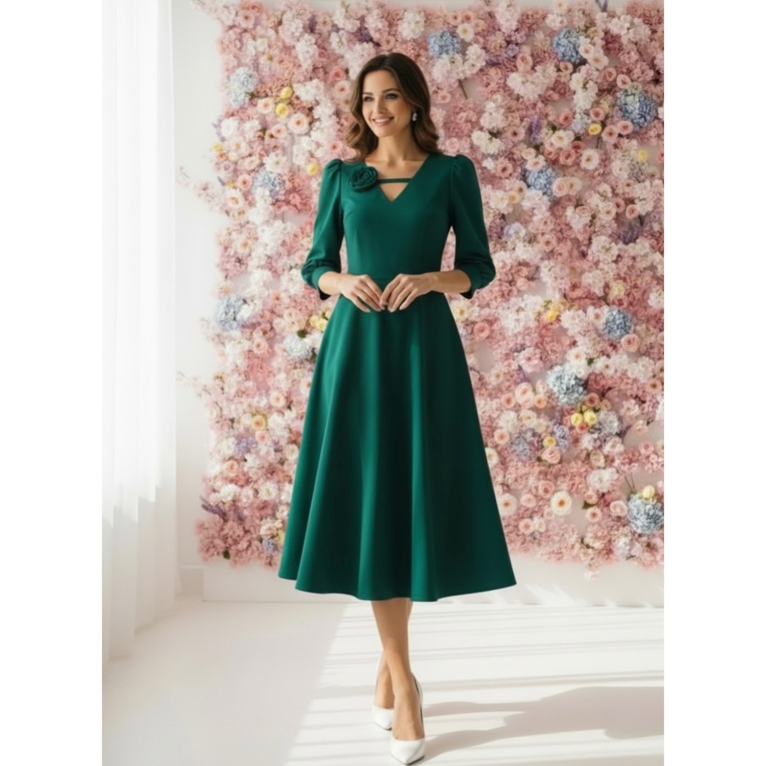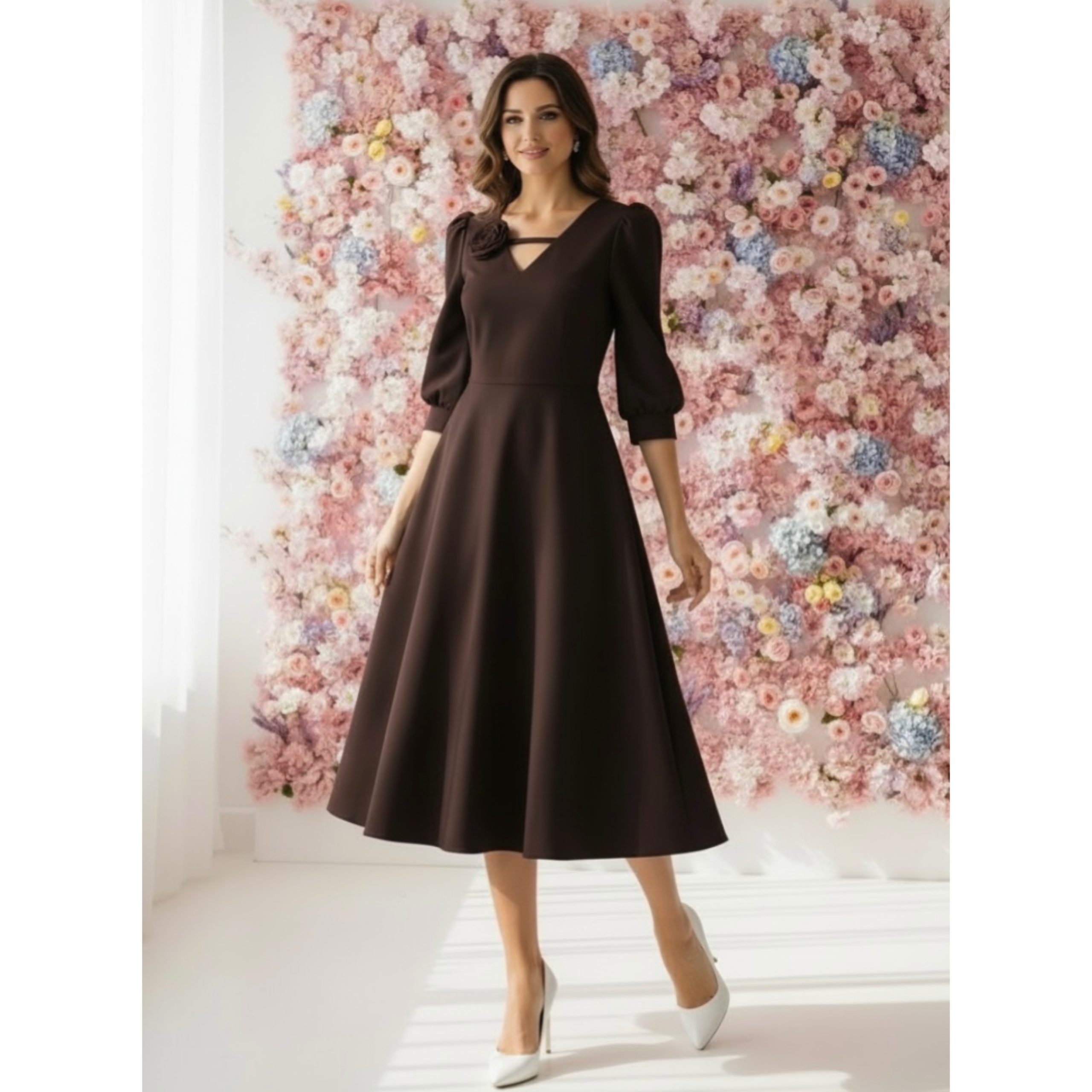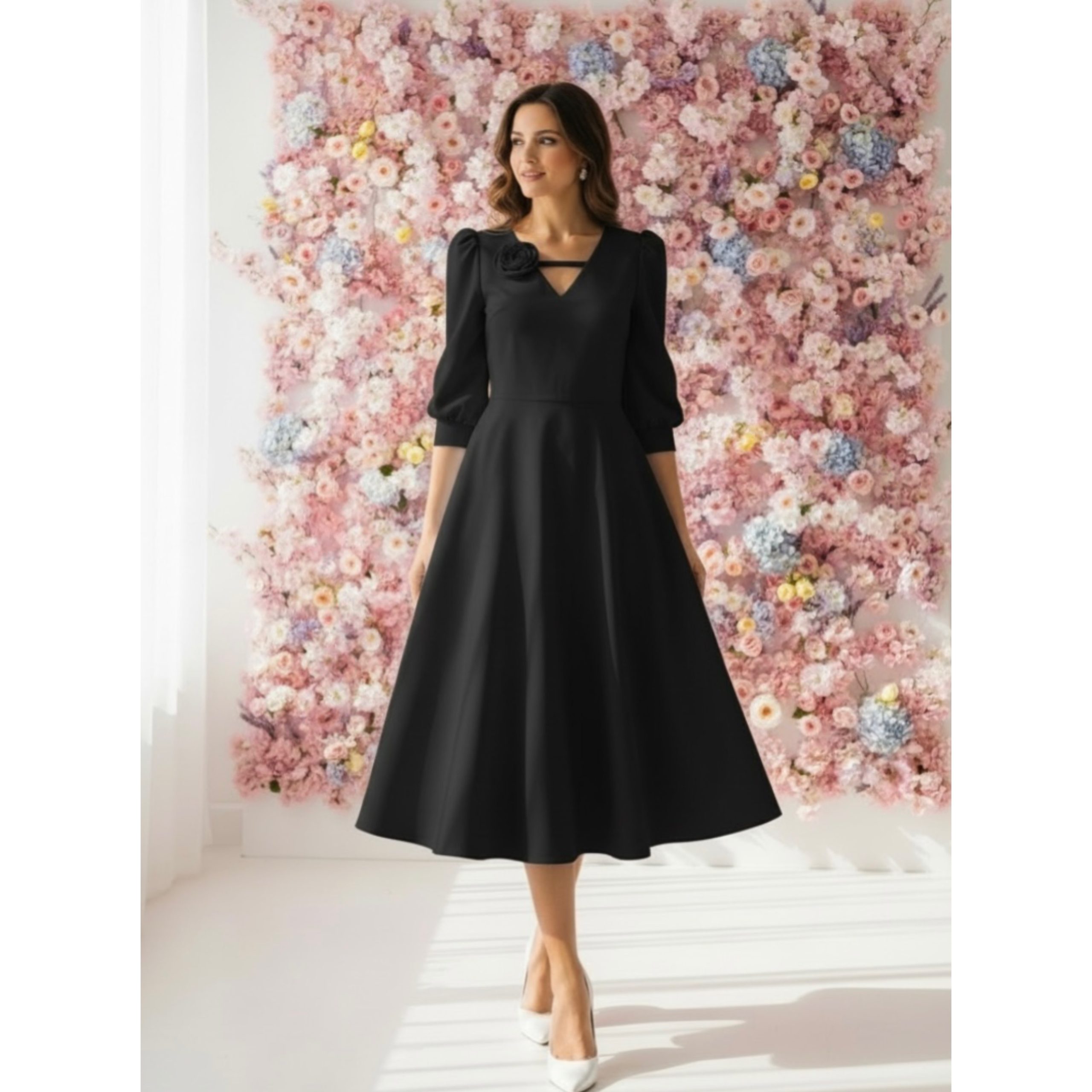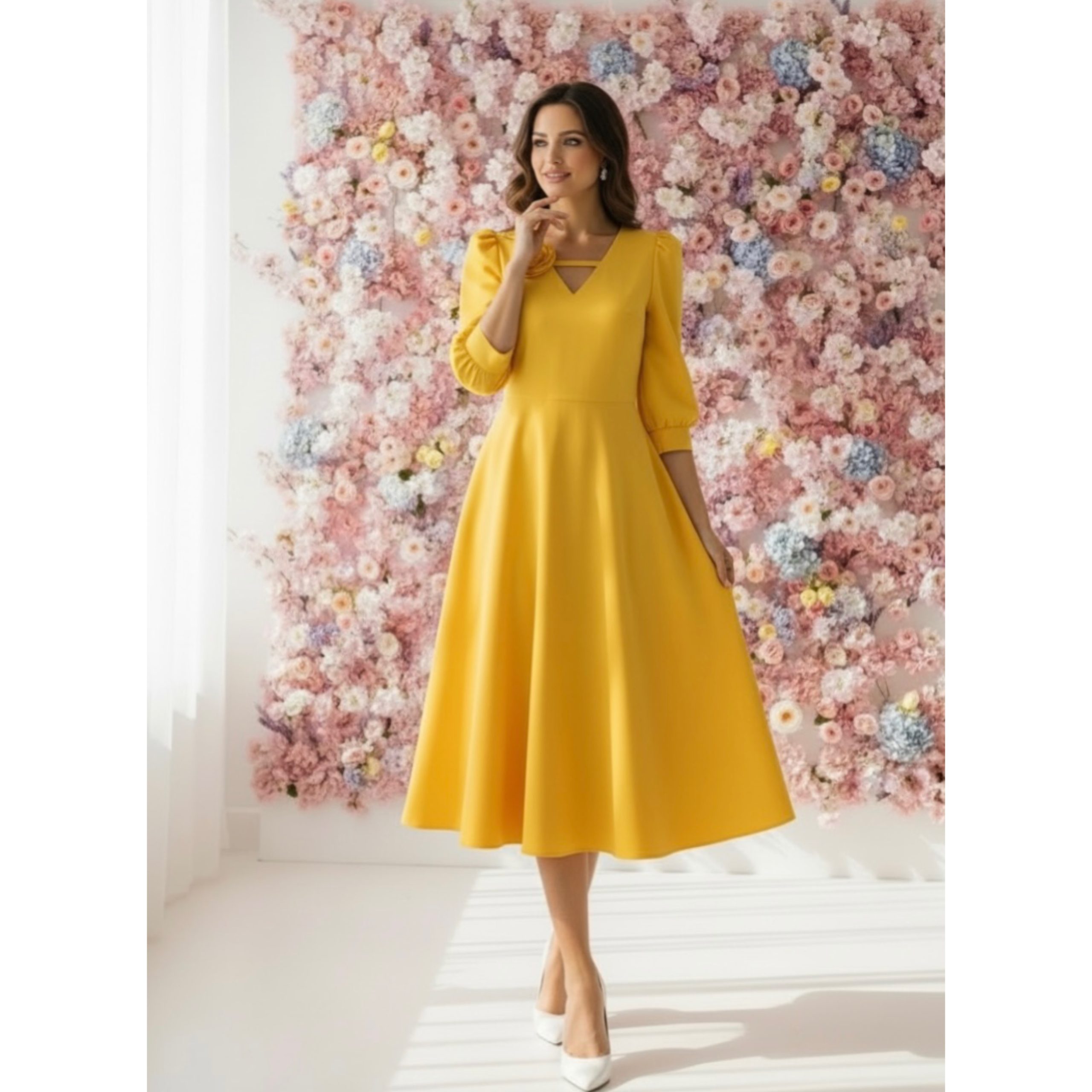 Rochia este confectionata din stofa barbie, material plin, usor elastic.