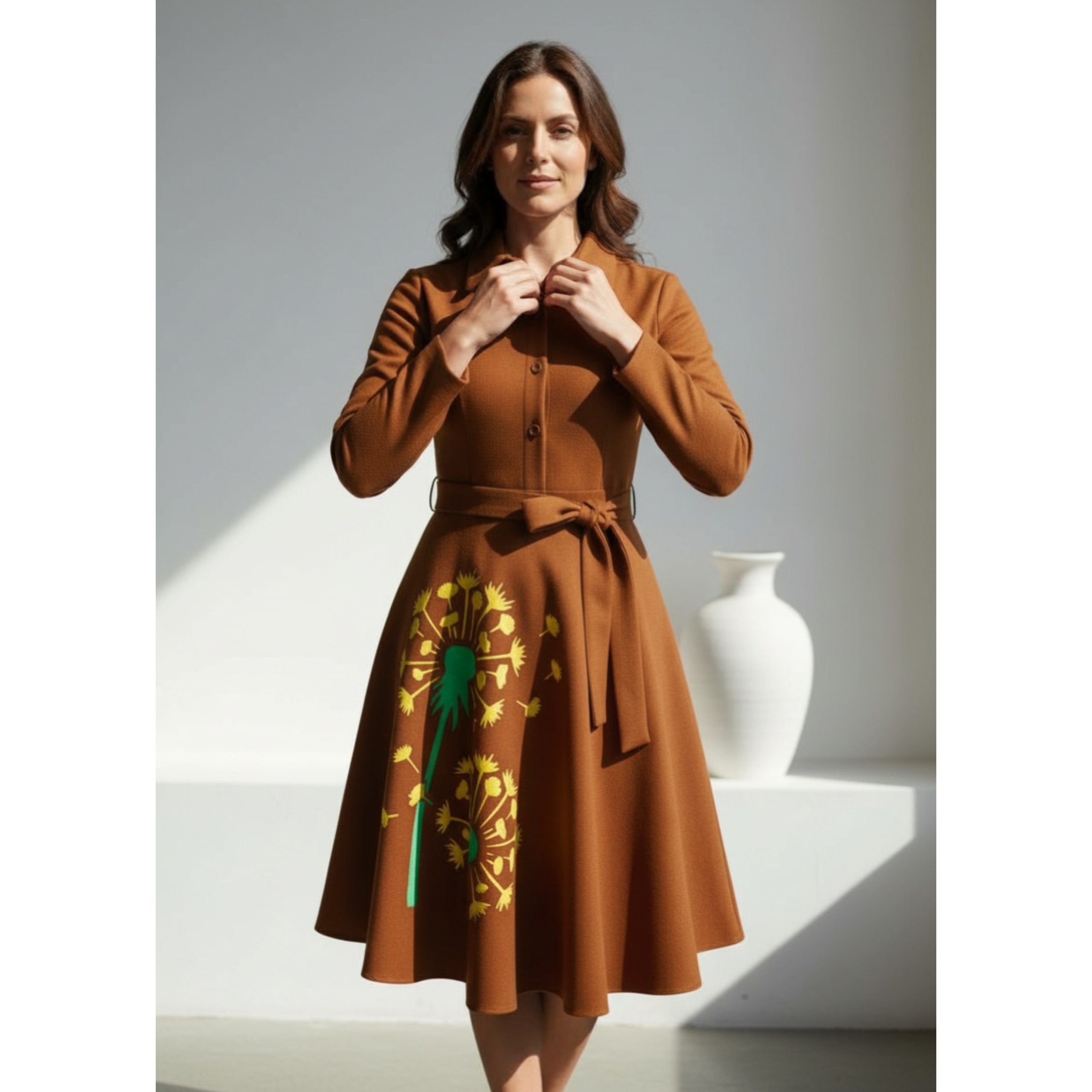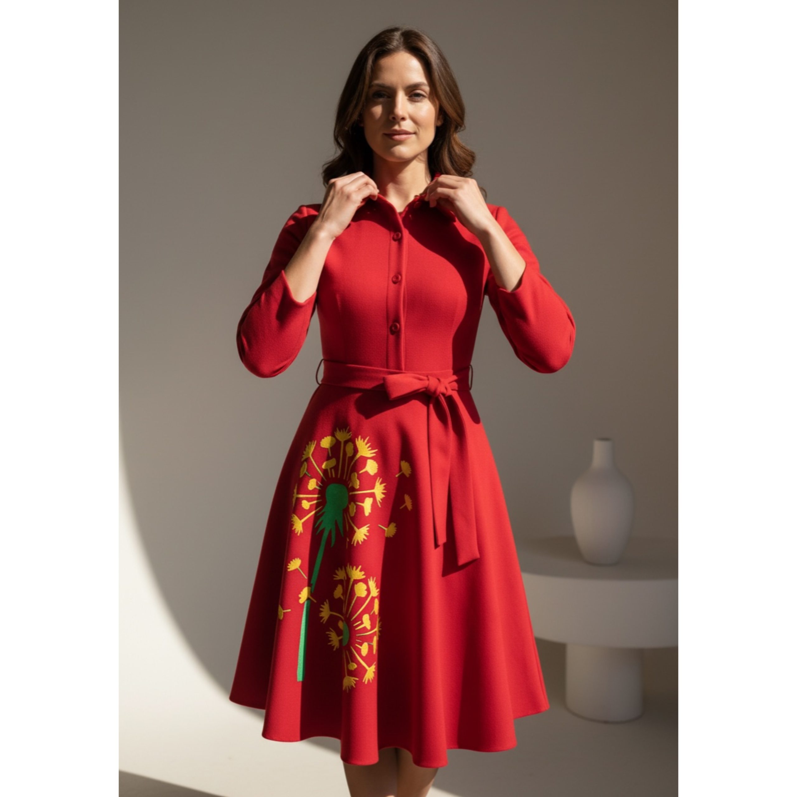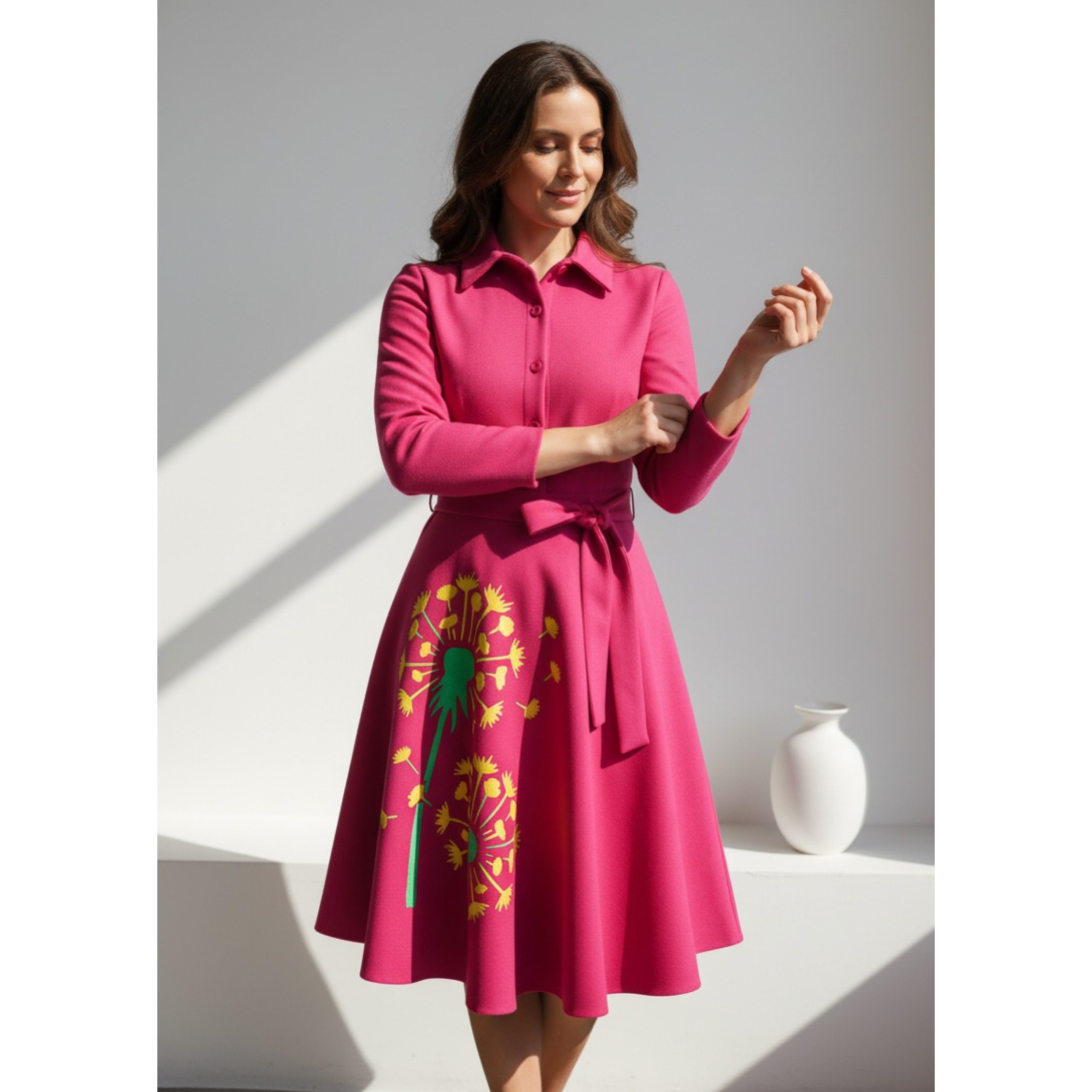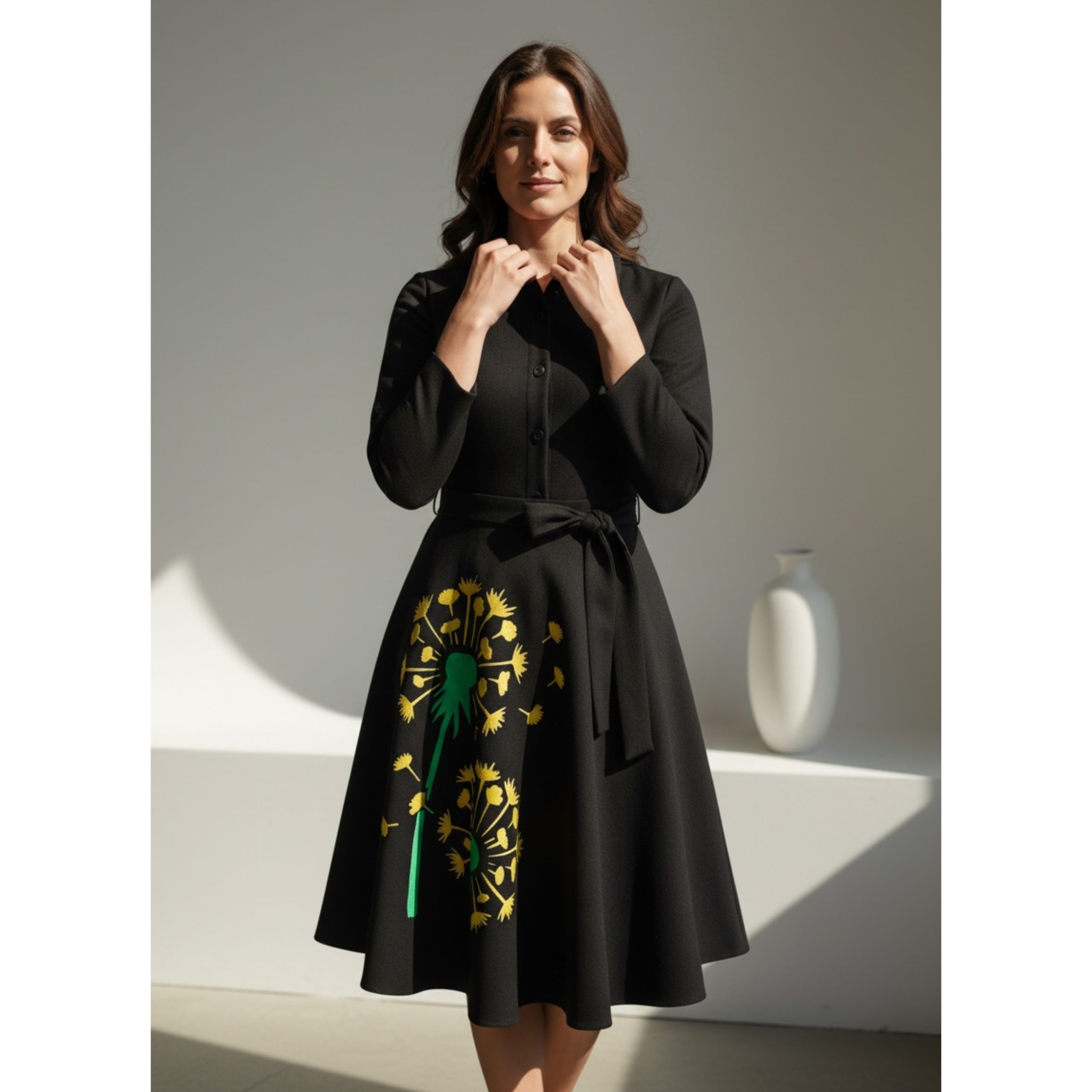 Rochia tip camasa Golden Dandelions este confectionata din stofa barbi. Materialul este usor elastic, este netransparent si este potrivit pentru orice sezon. Modelul este prevazut cu fermoar lateral si cordon detasabil in talie.?