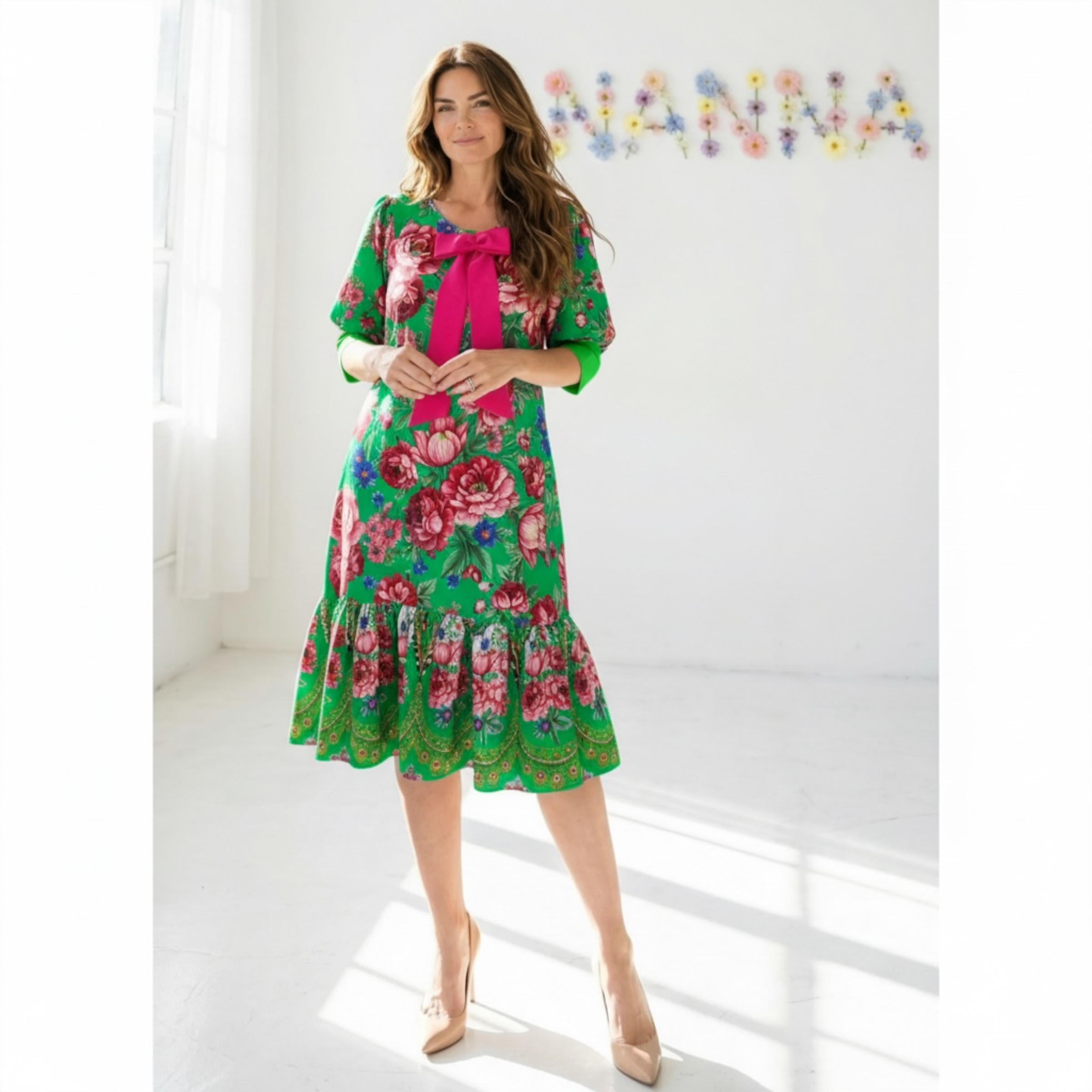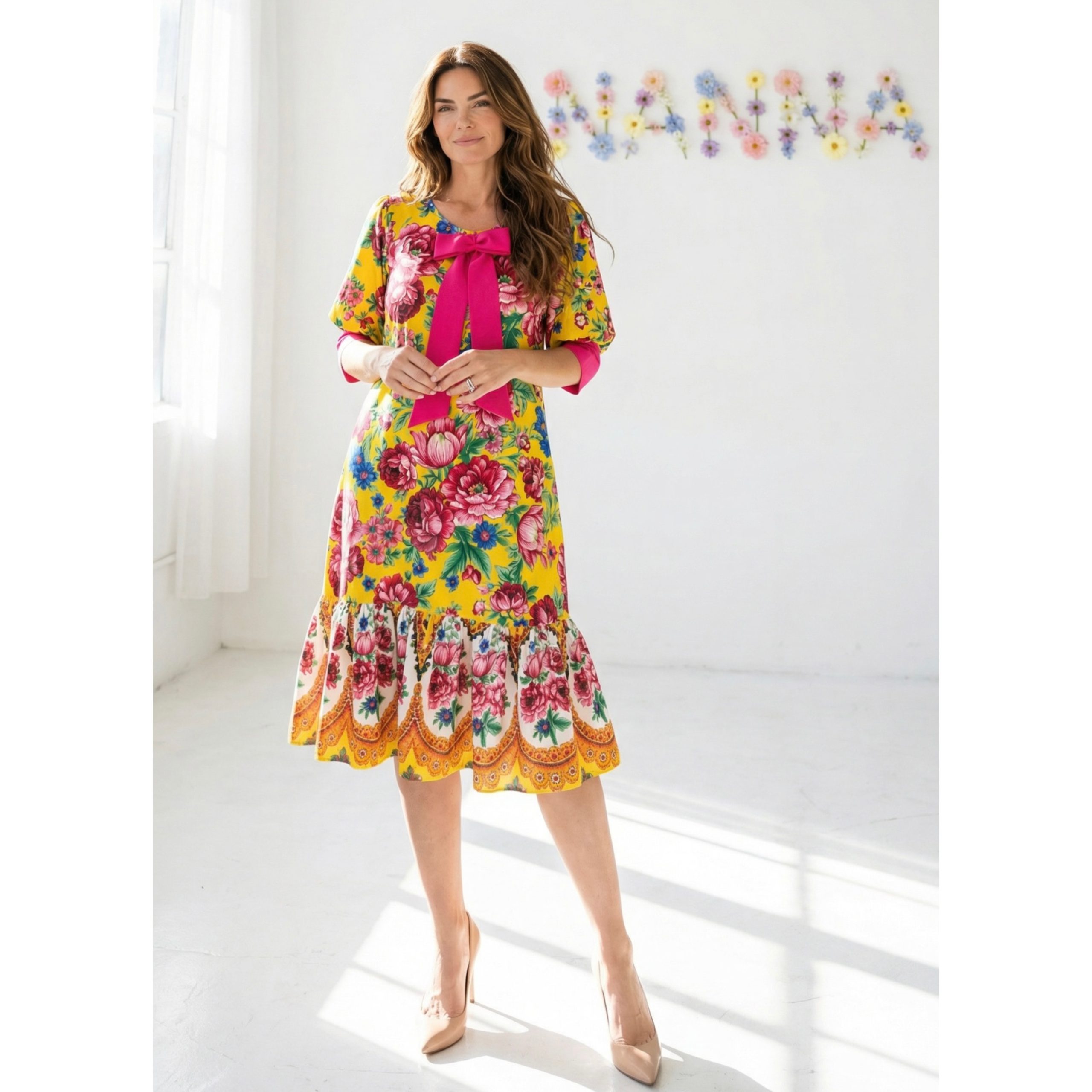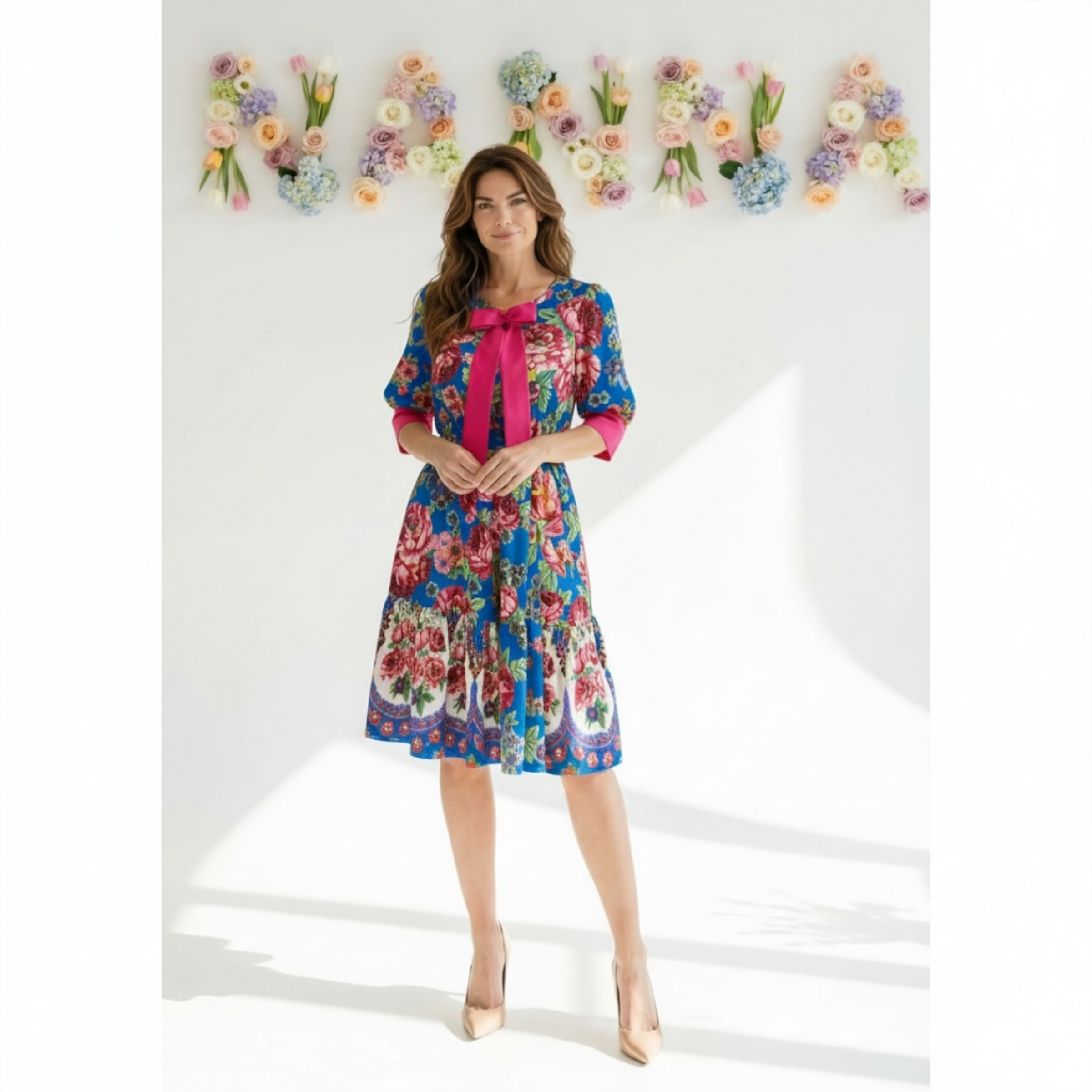 Rochia este confectionata din vascoza,material plin. Are croi lejer si cordon detasabil.