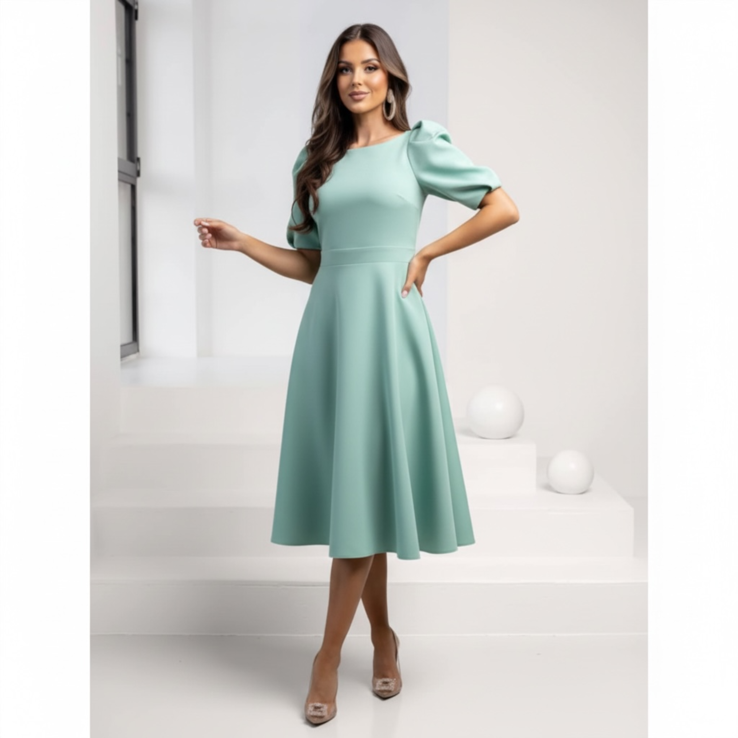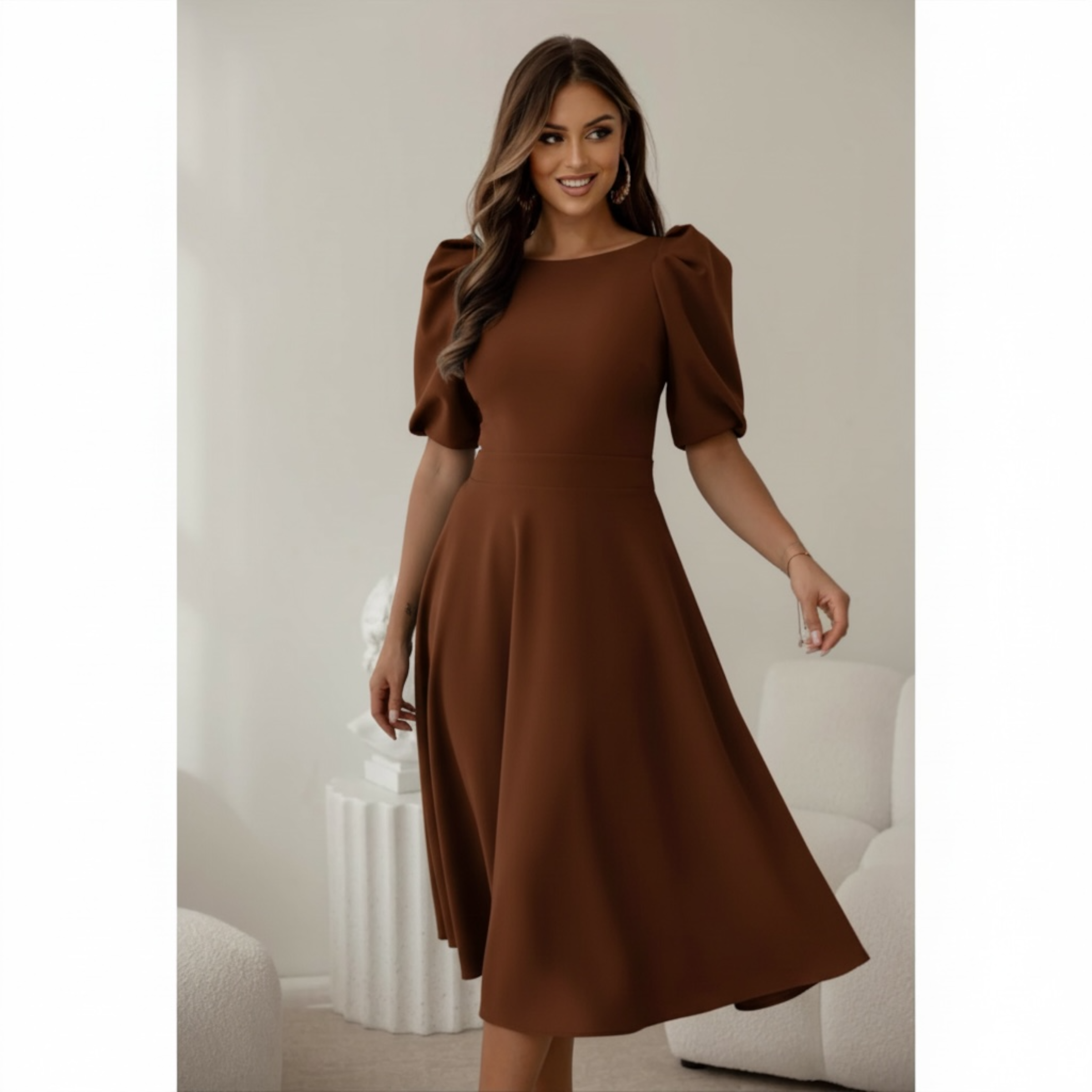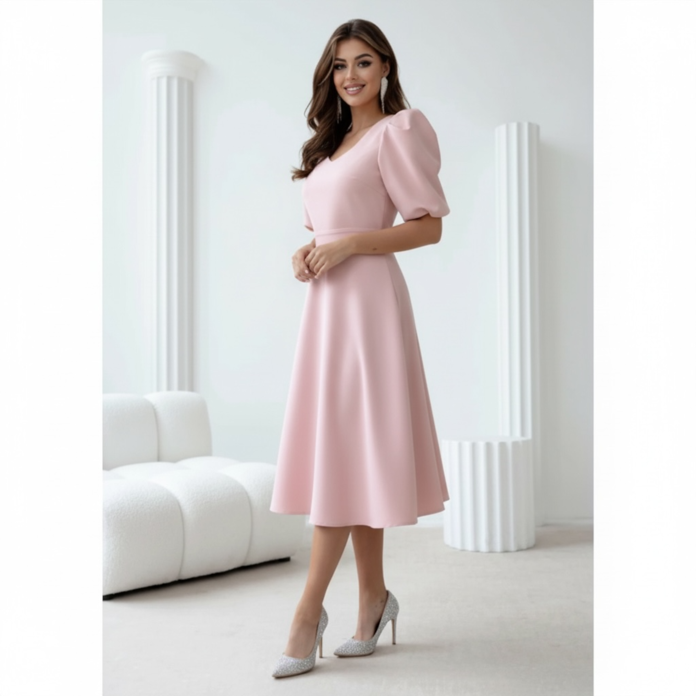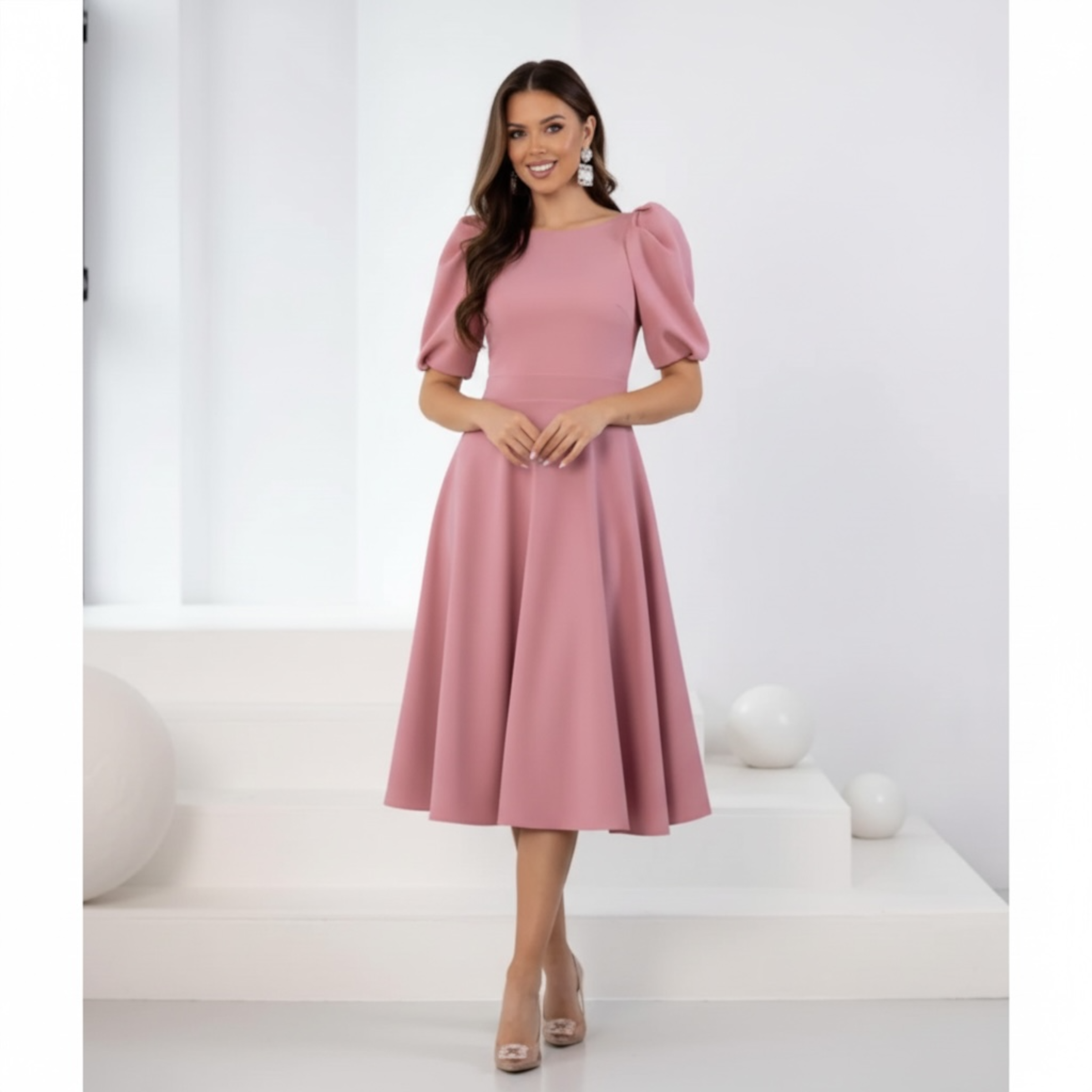 Rochia este confectionata din stofa barbie, material plin, usor elastic, care nu se electrizeaza. Lungime standard 115 cm.