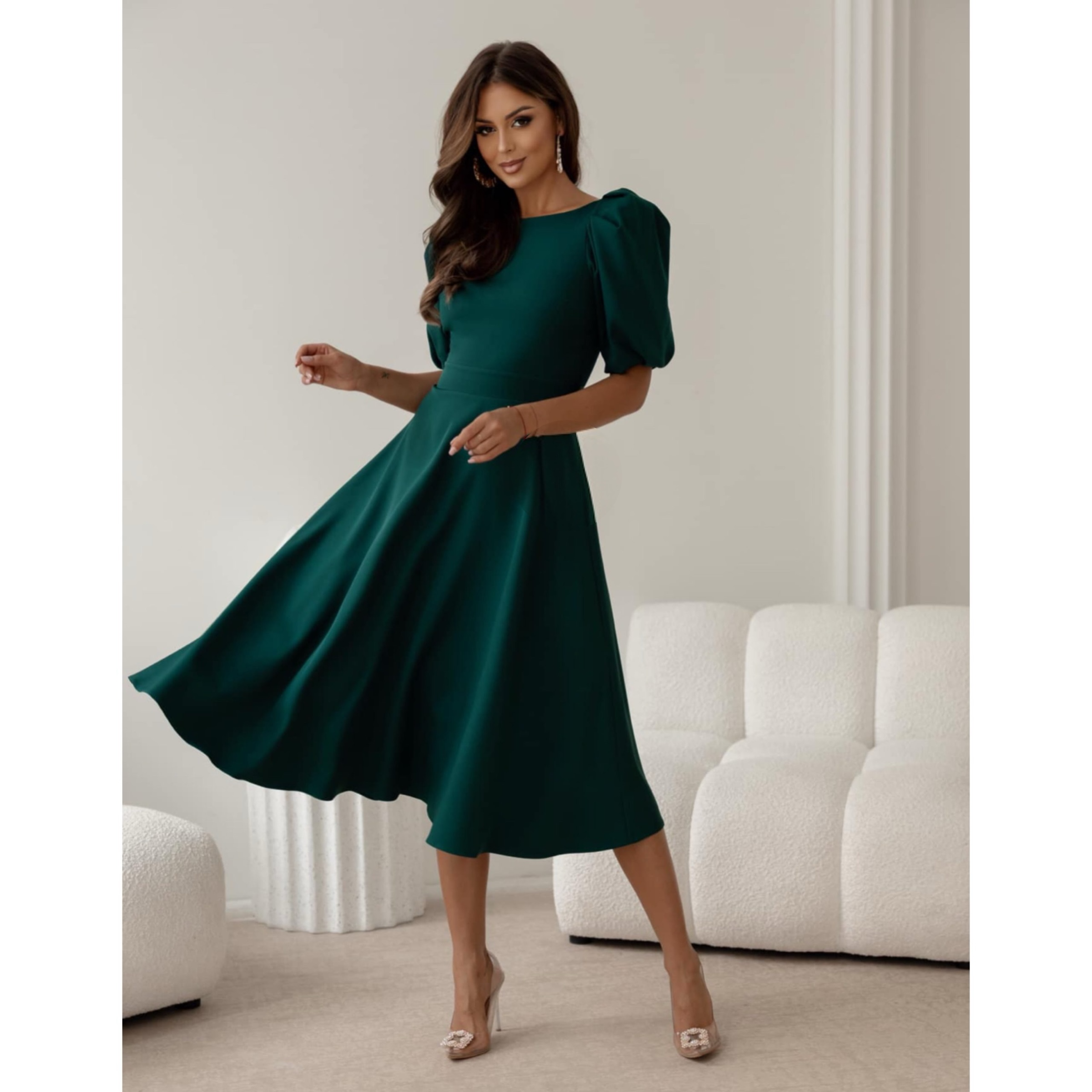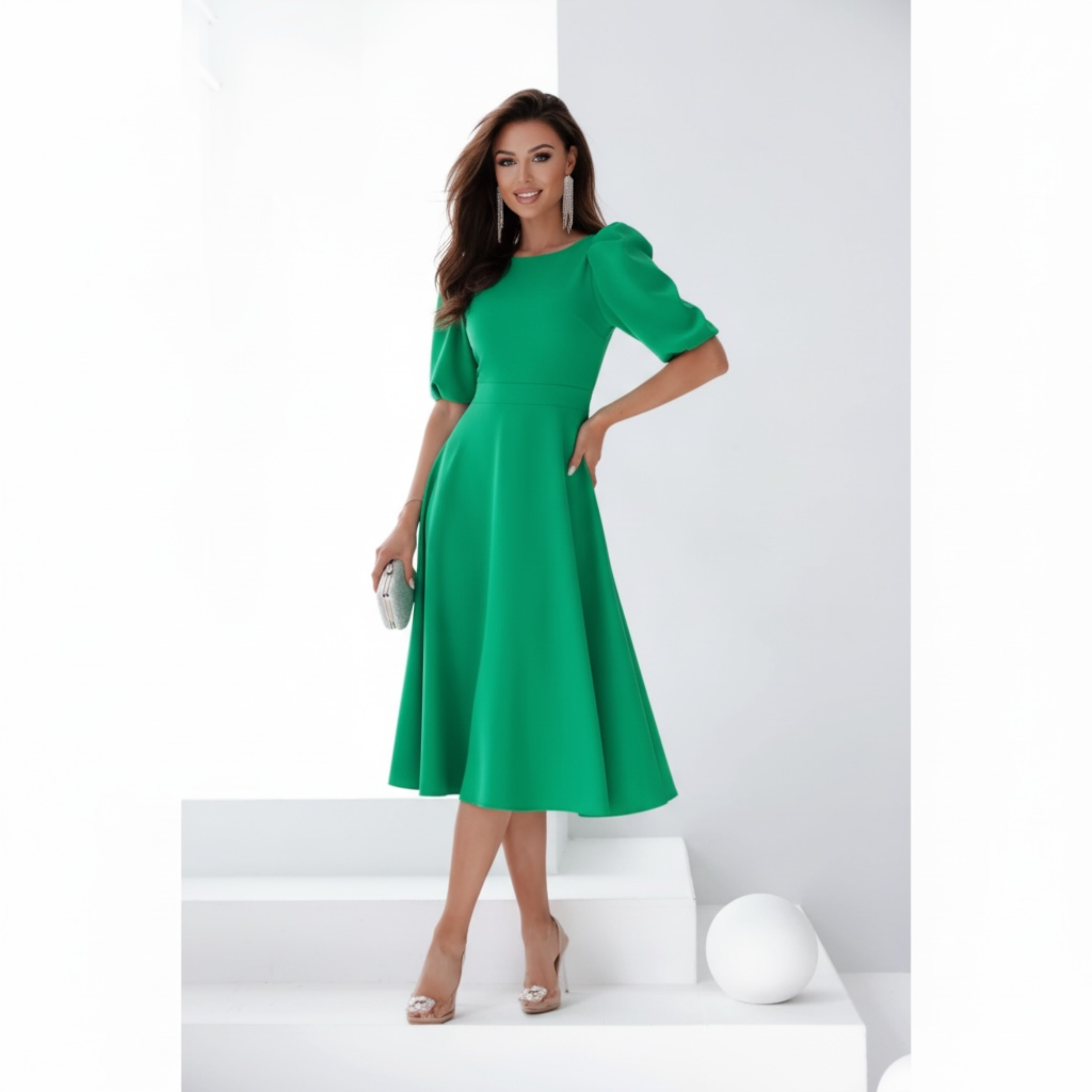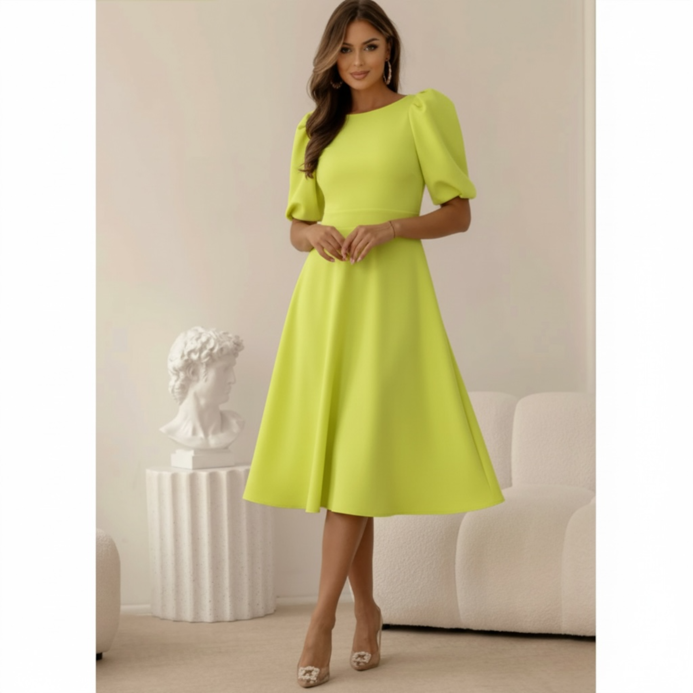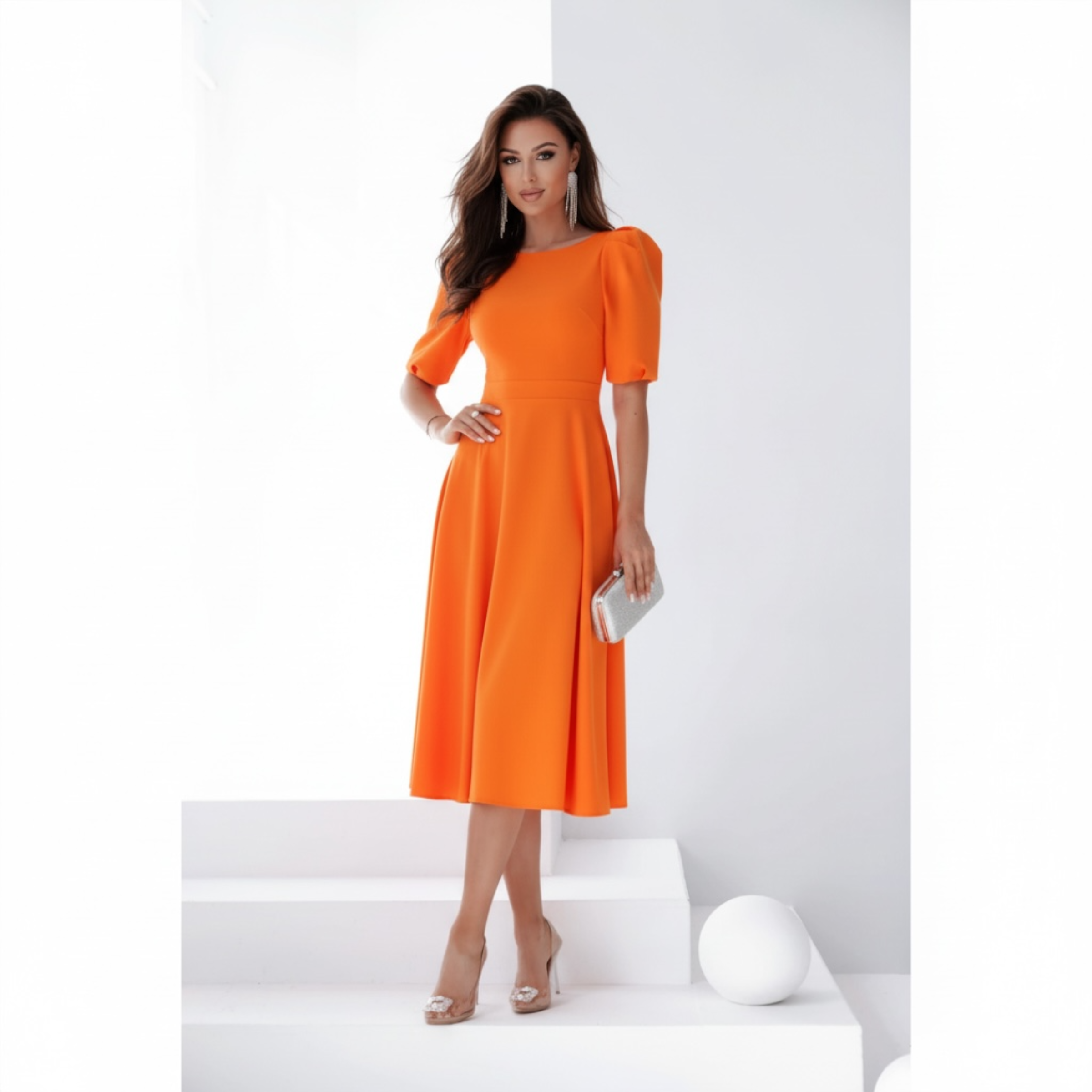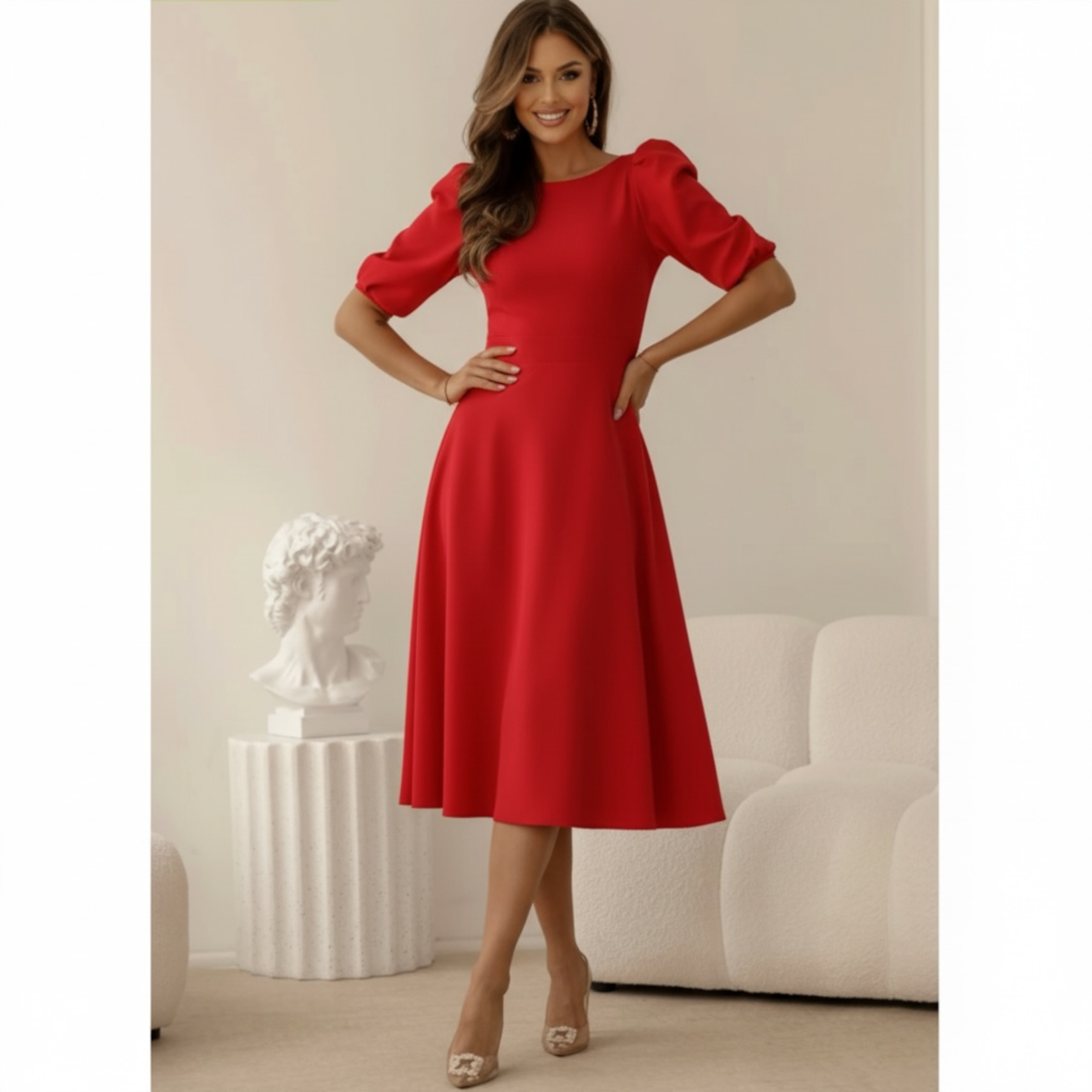 Rochia este confectionata din stofa barbie, material plin, usor elastic, care nu se electrizeaza. Lungime standard 115 cm.