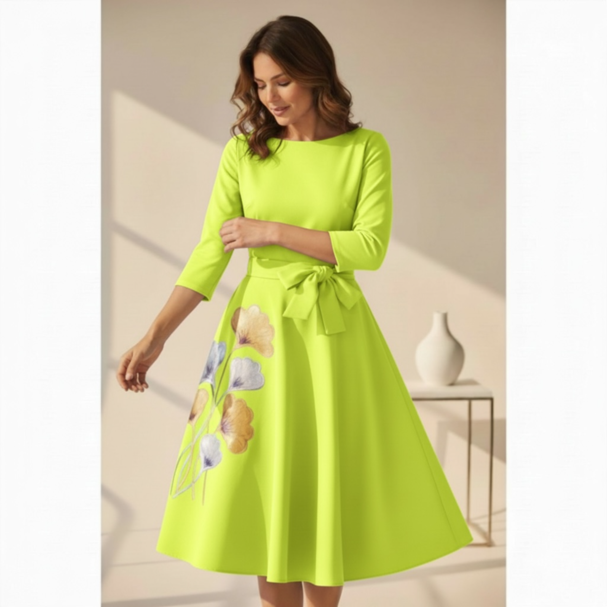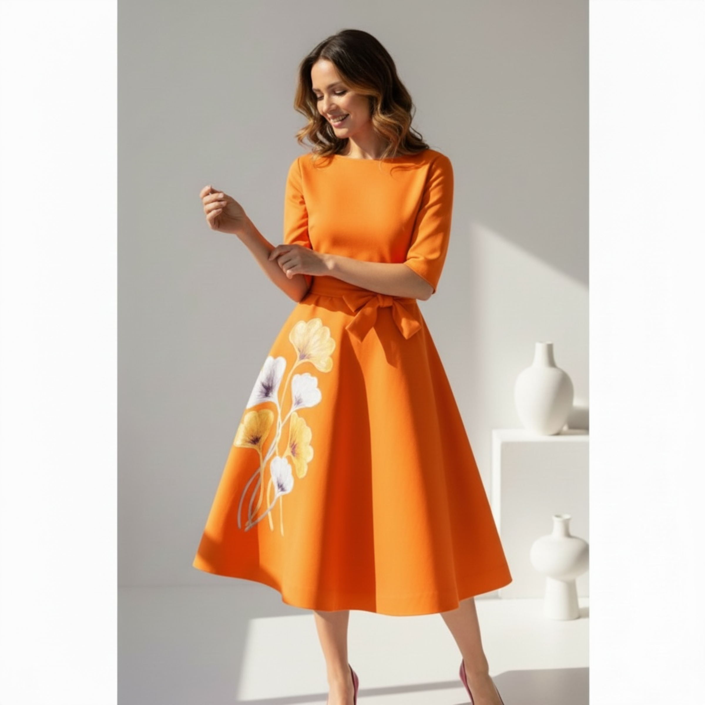 Rochia este pictata manual. Are maneca lunga si fermoar lateral. Cordonul din talie este detasabil. Lungime standard : 100 cm.