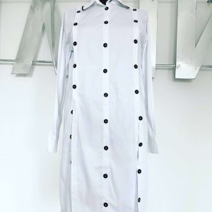 Rochia are sistem de prindere in nasturi in zona bustului si fermoar ascuns lateral. Este prevazuta cu cordon detasabil.