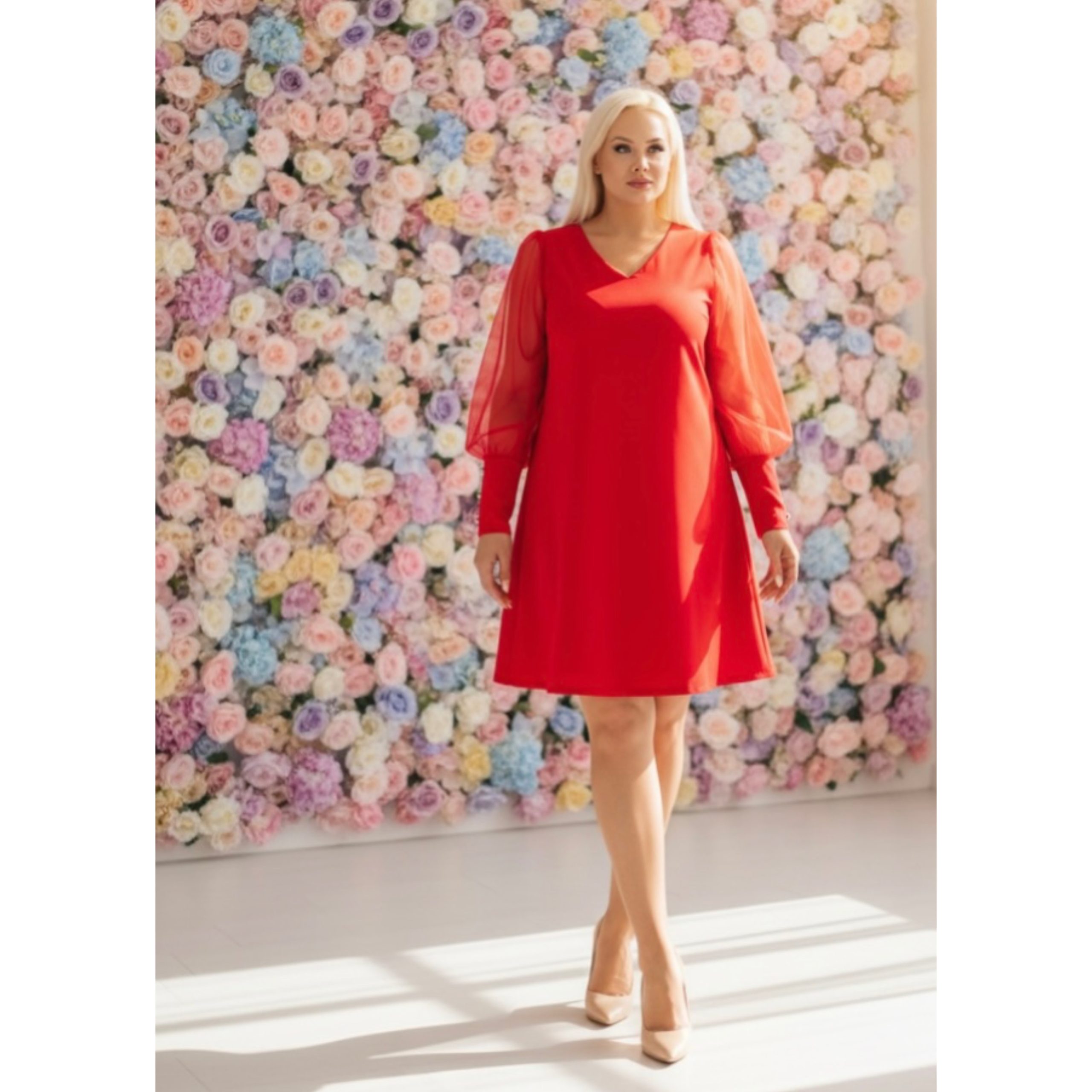 Rochia este confectionata din stofa barbie, material plin, usor elastic. Mamecile sunt confectionate din tulle. Nasturii de la mansete sunt doar de design.