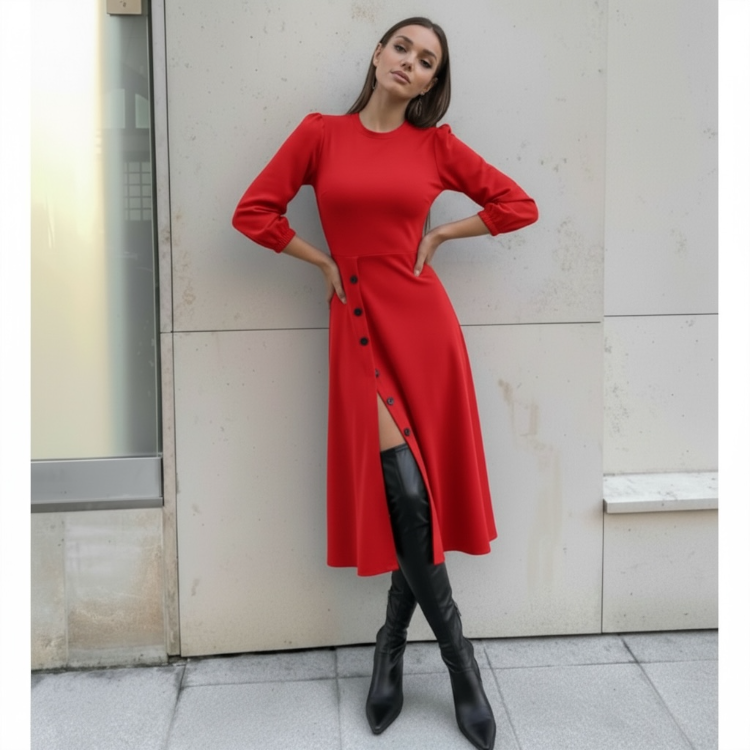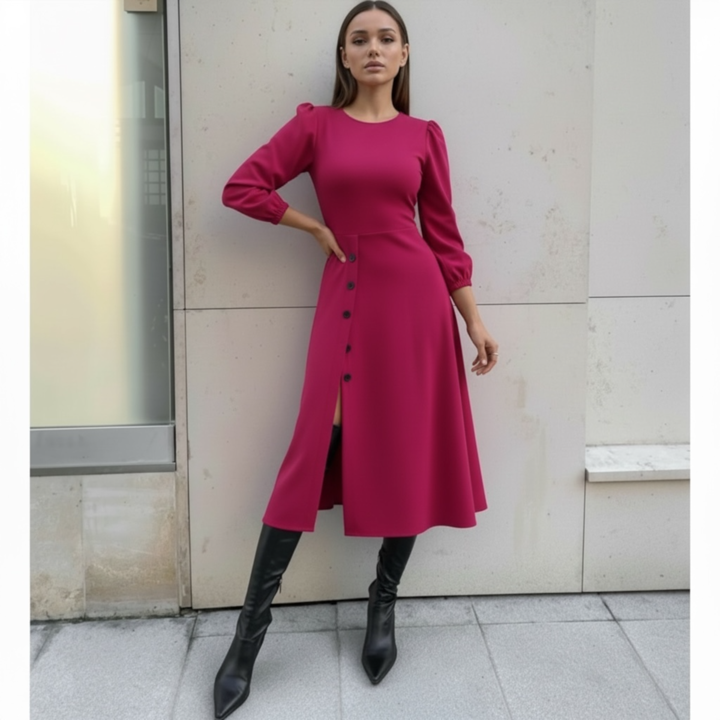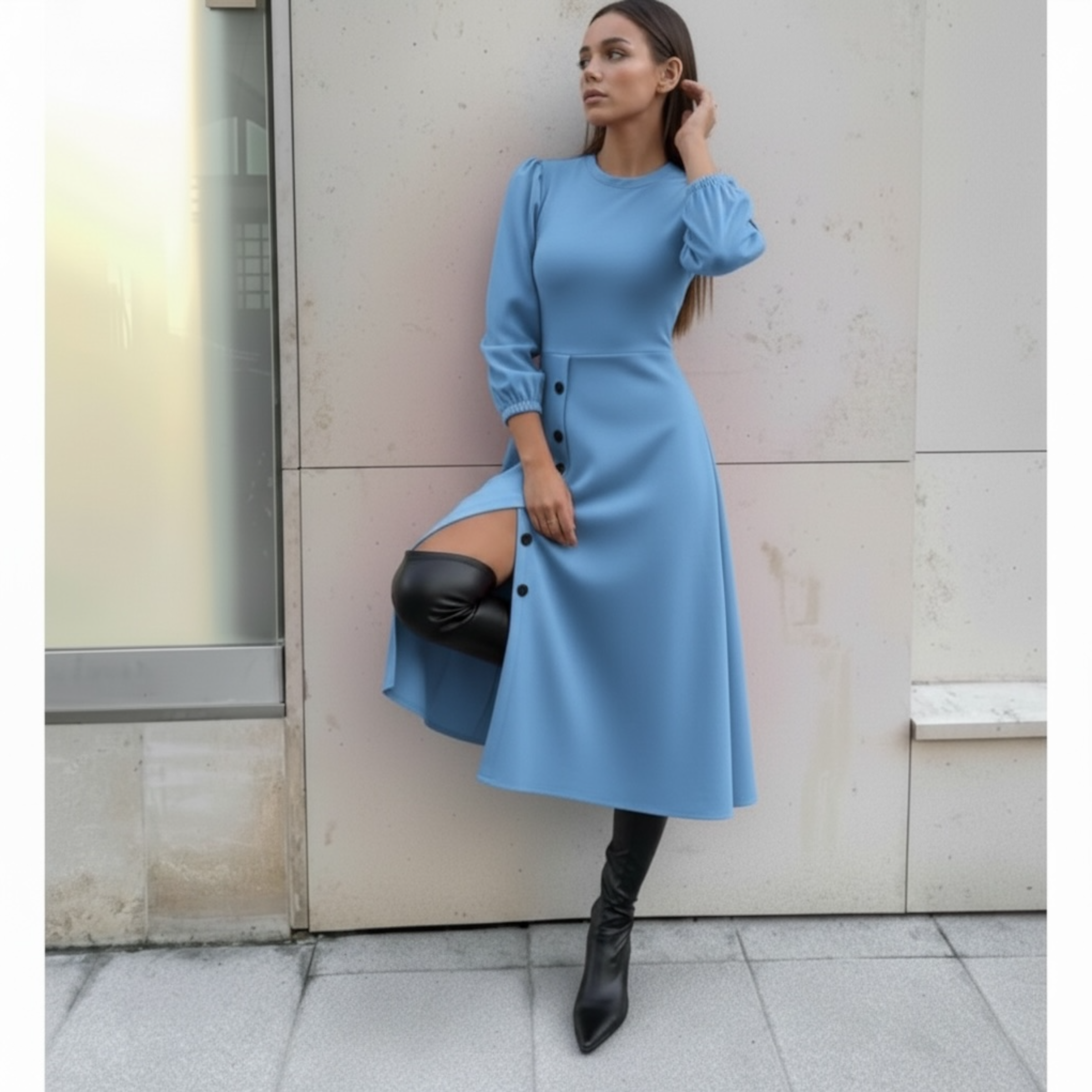 Rochia este confectionata din stofa barbie, material plin, usor elastic.