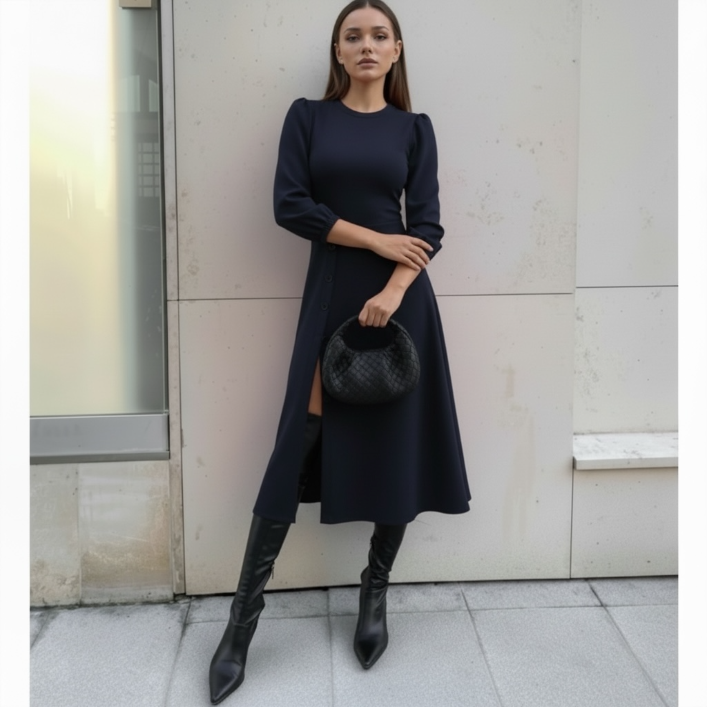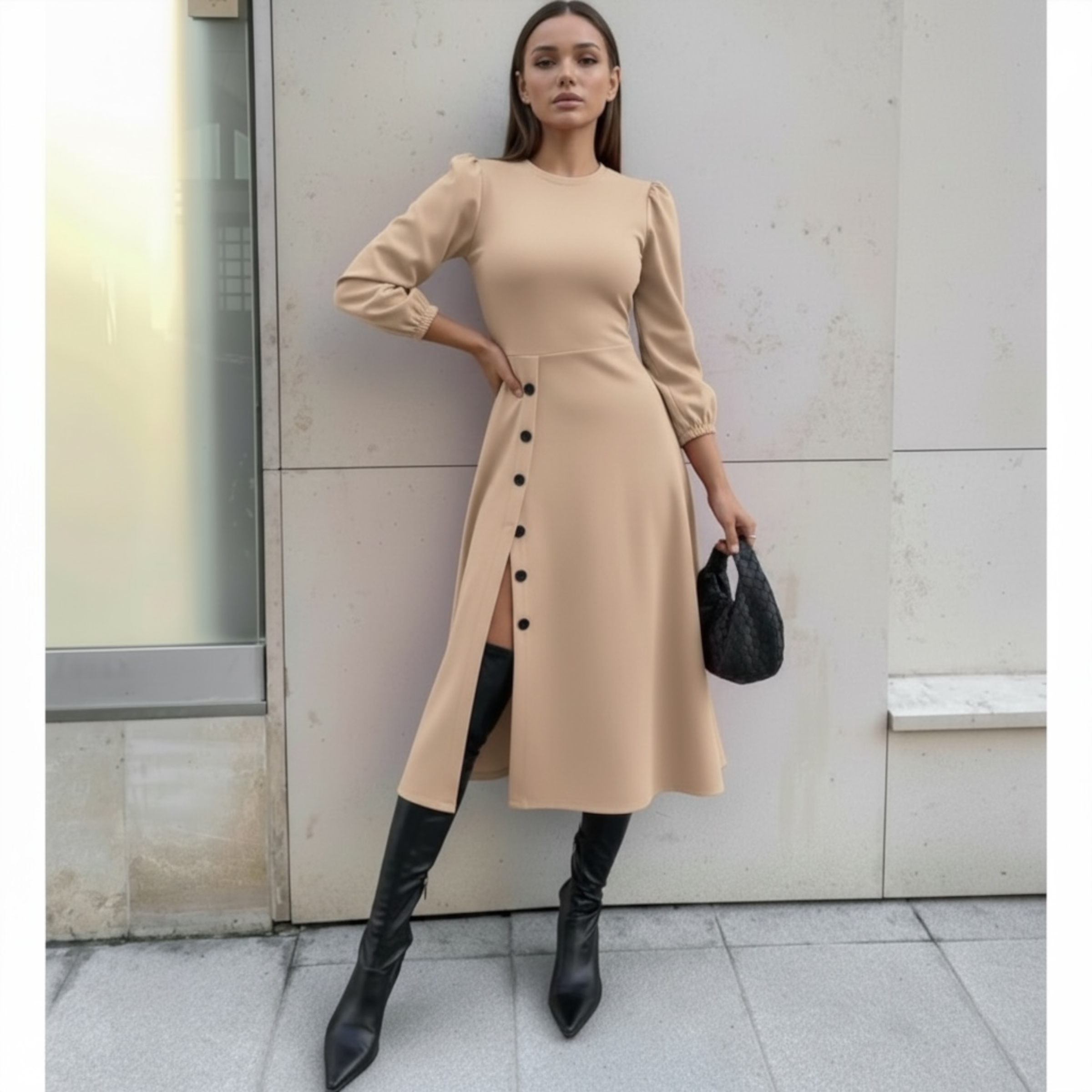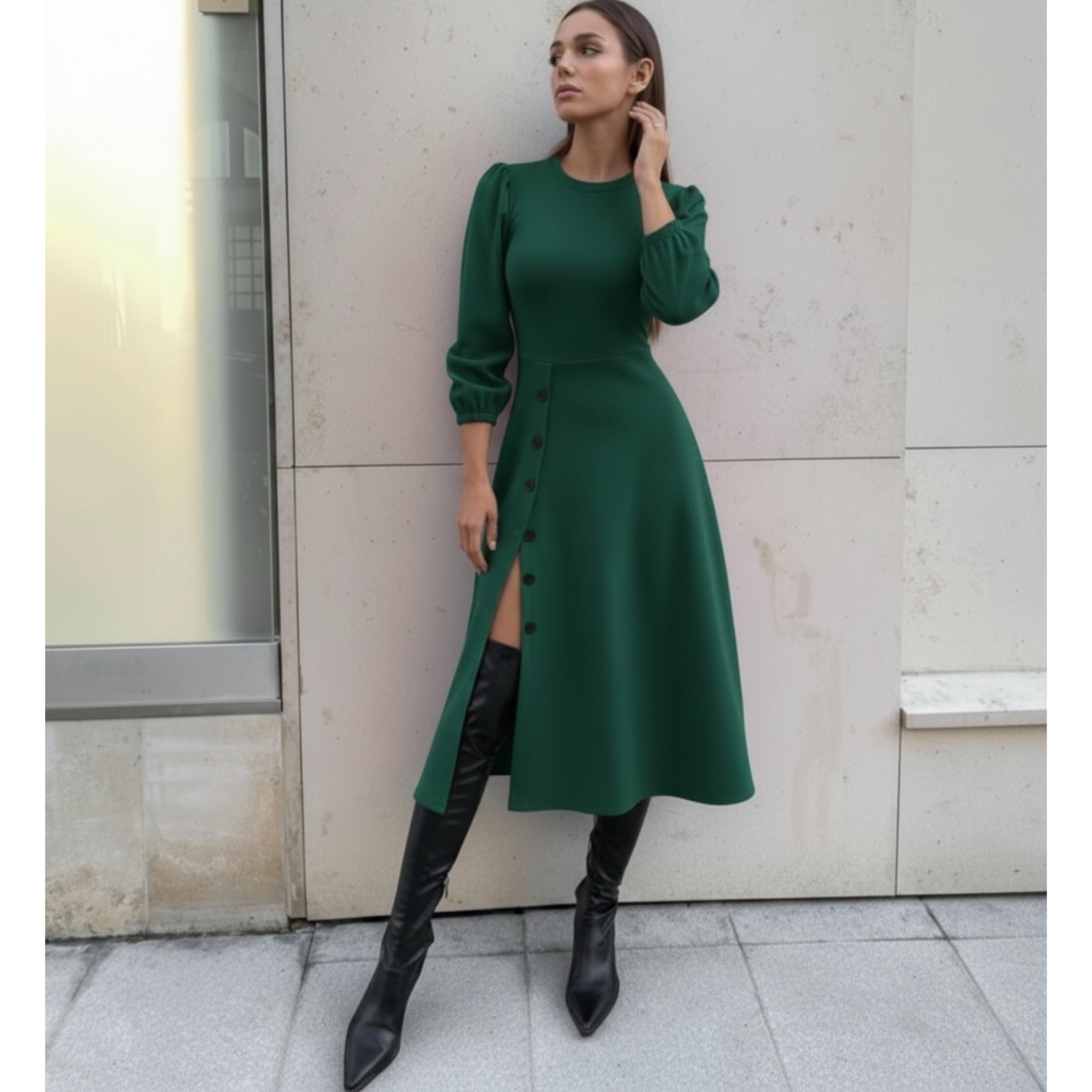 Rochia este confectionata din stofa barbie, material plin, usor elastic.