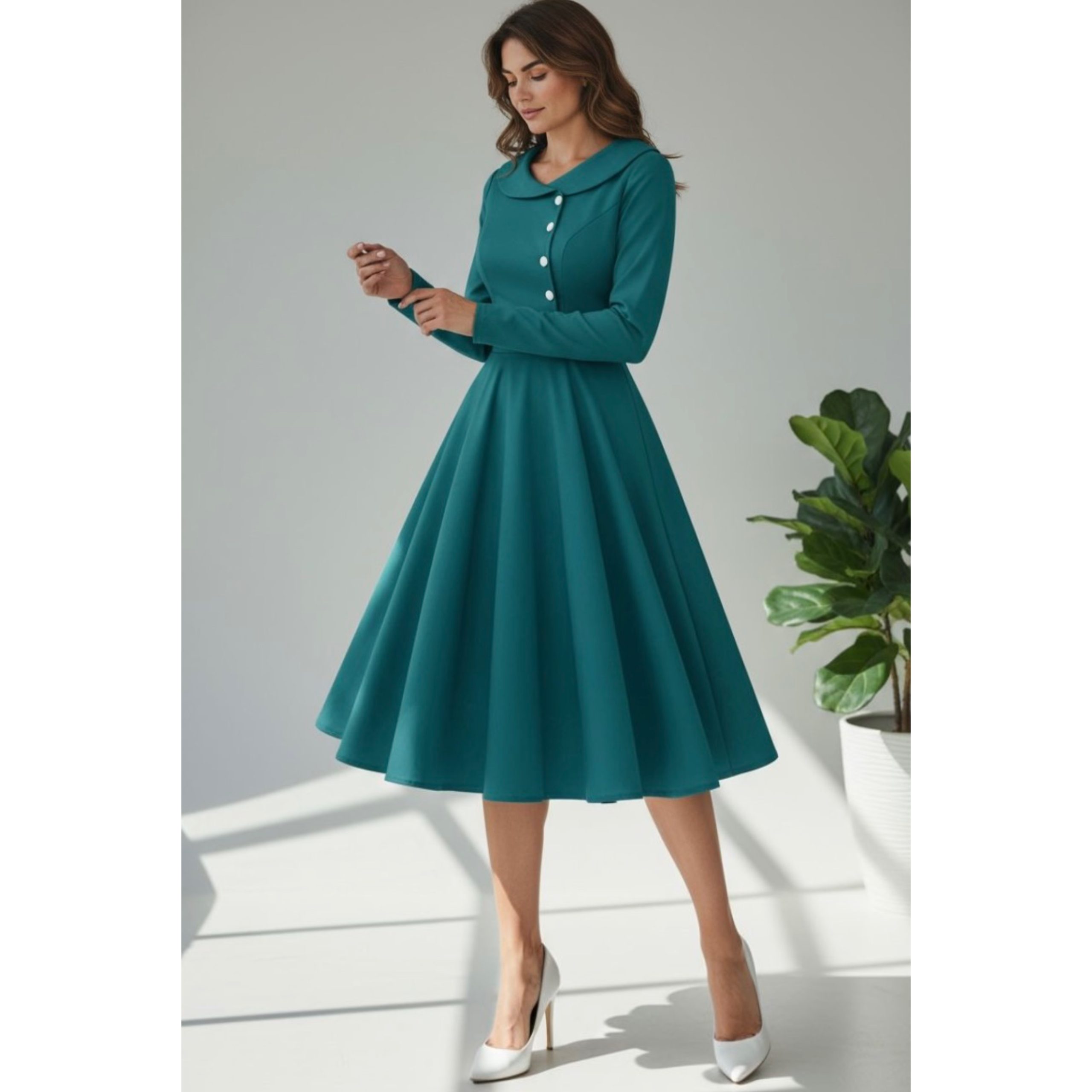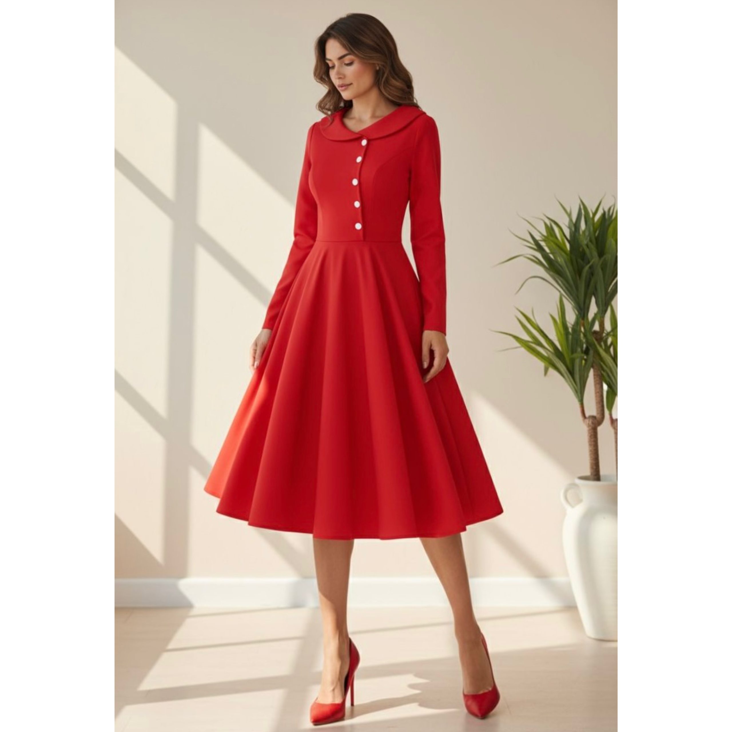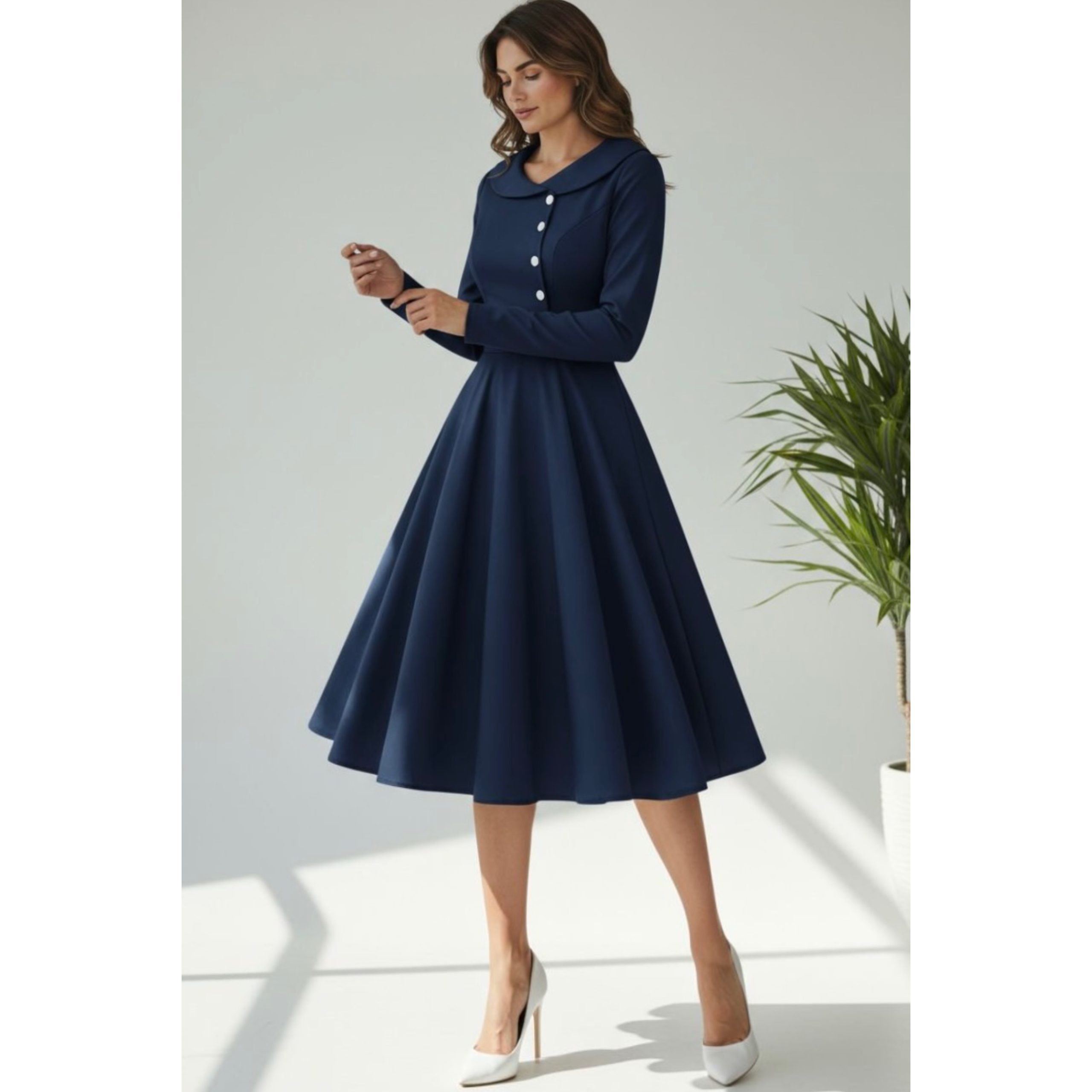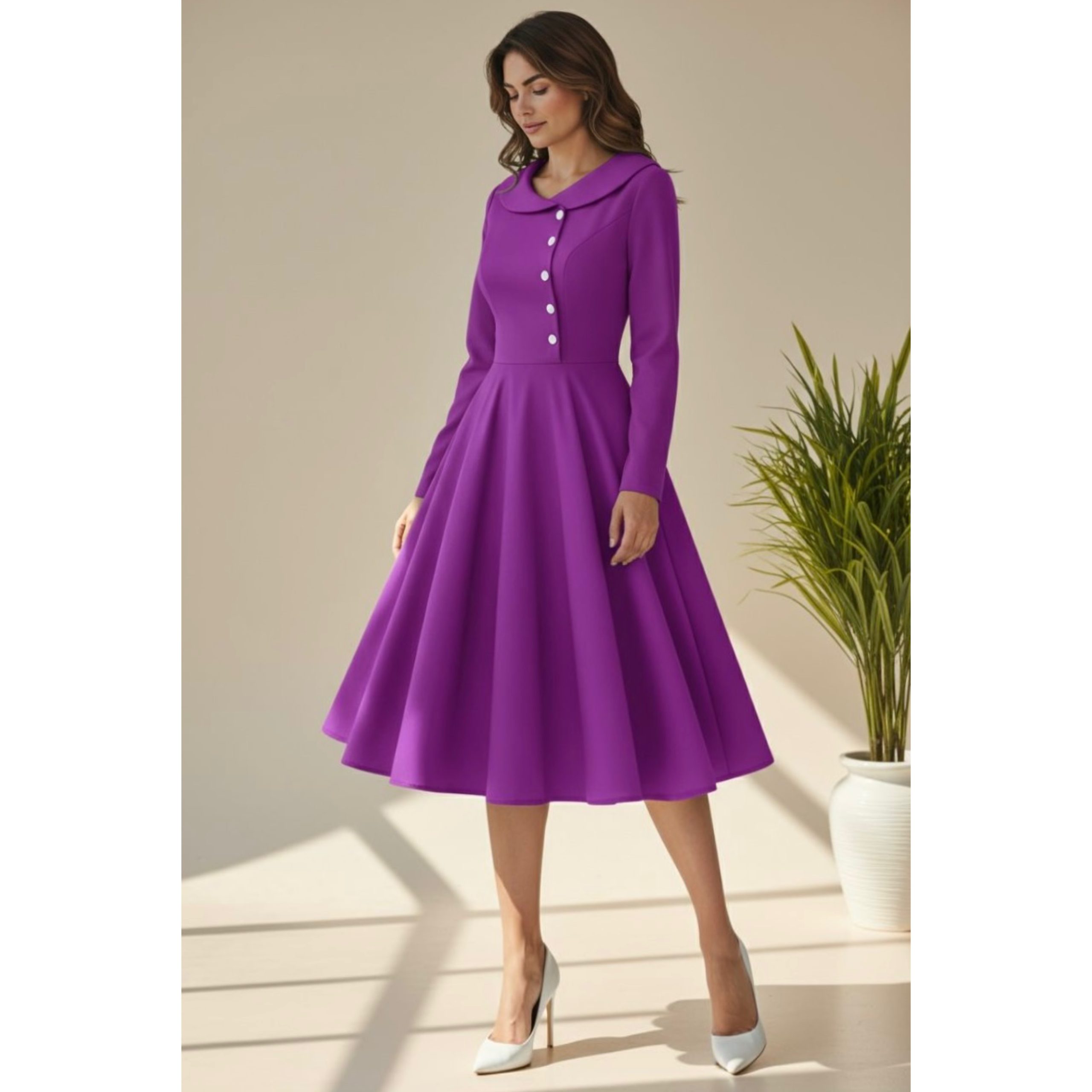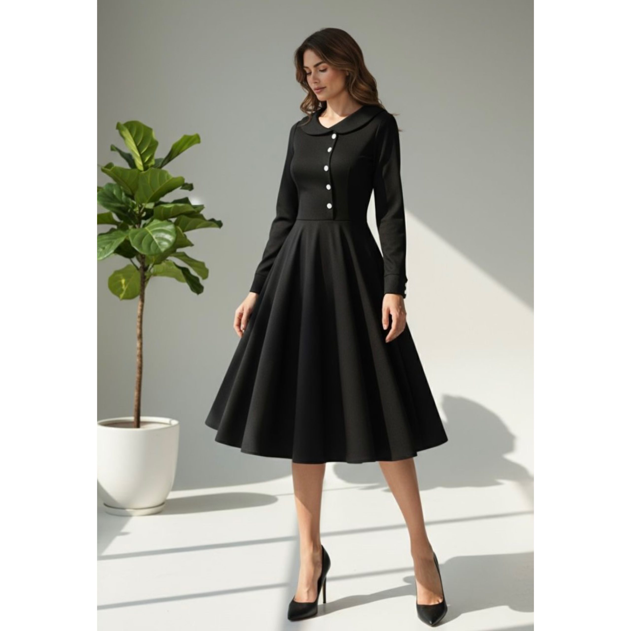 Rochia este confectionata din stofa barbie, material usor elastic, potrivit si pentru sezonul rece. Nasturii nu sunt functionali.