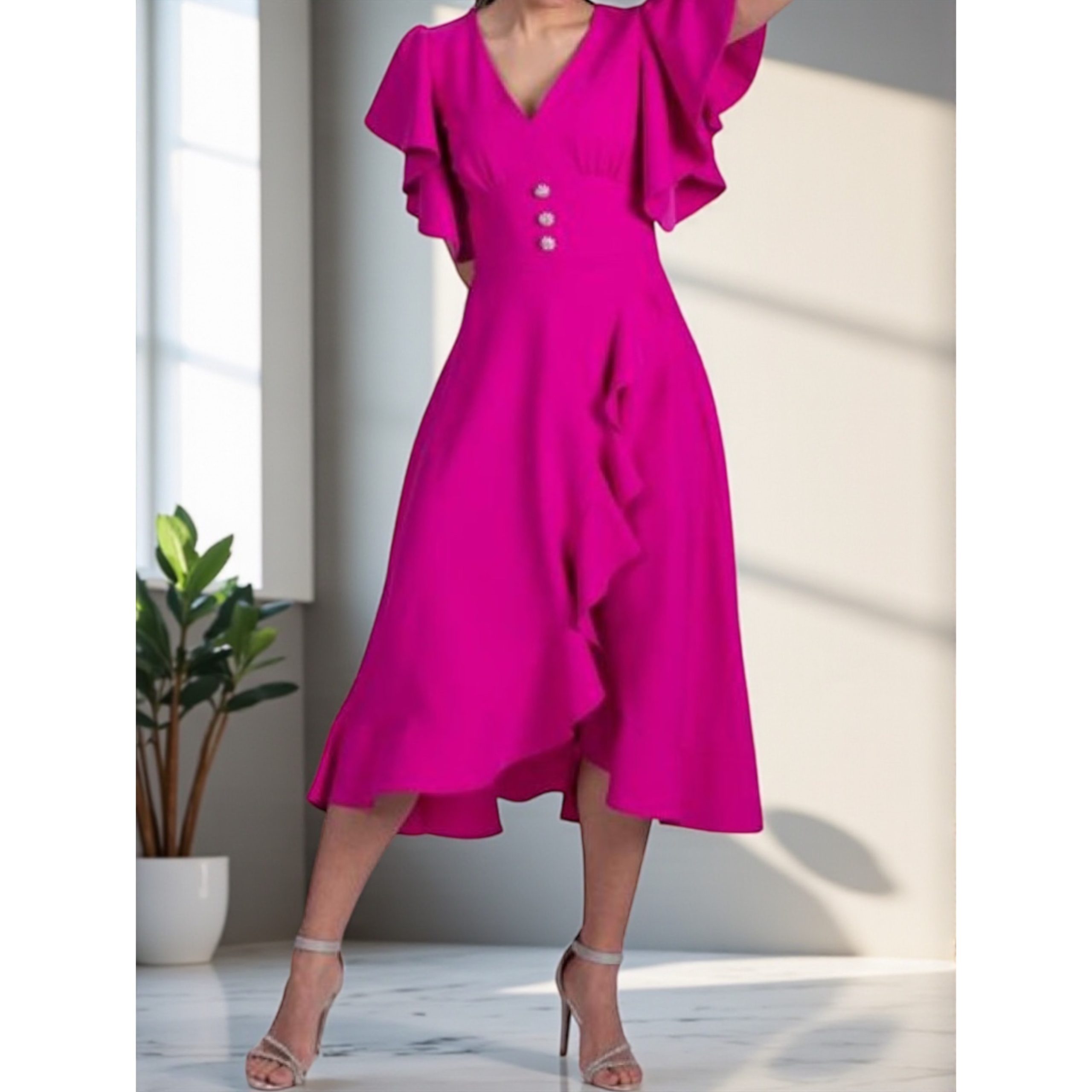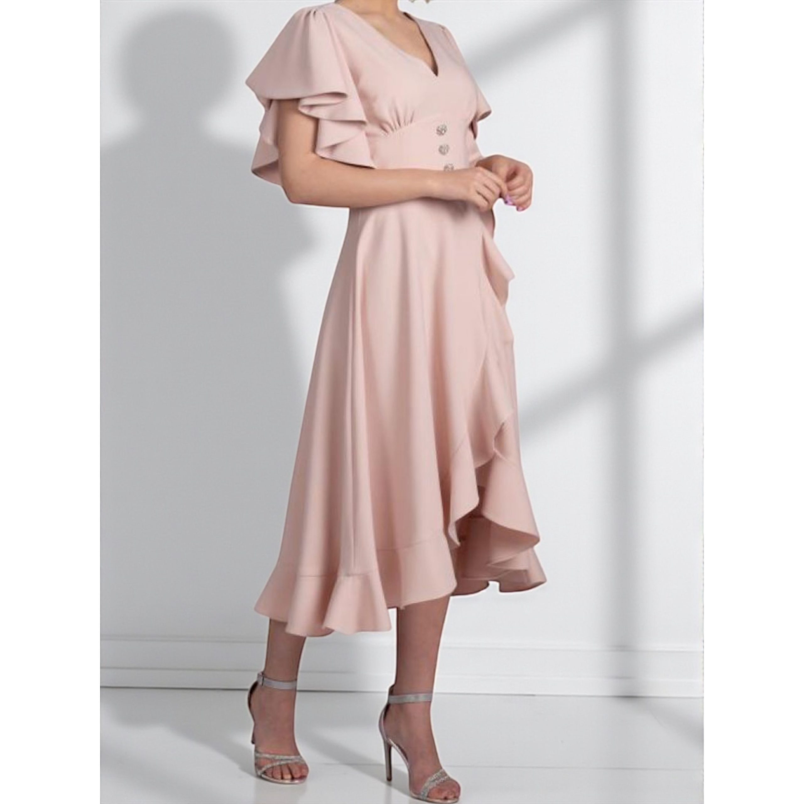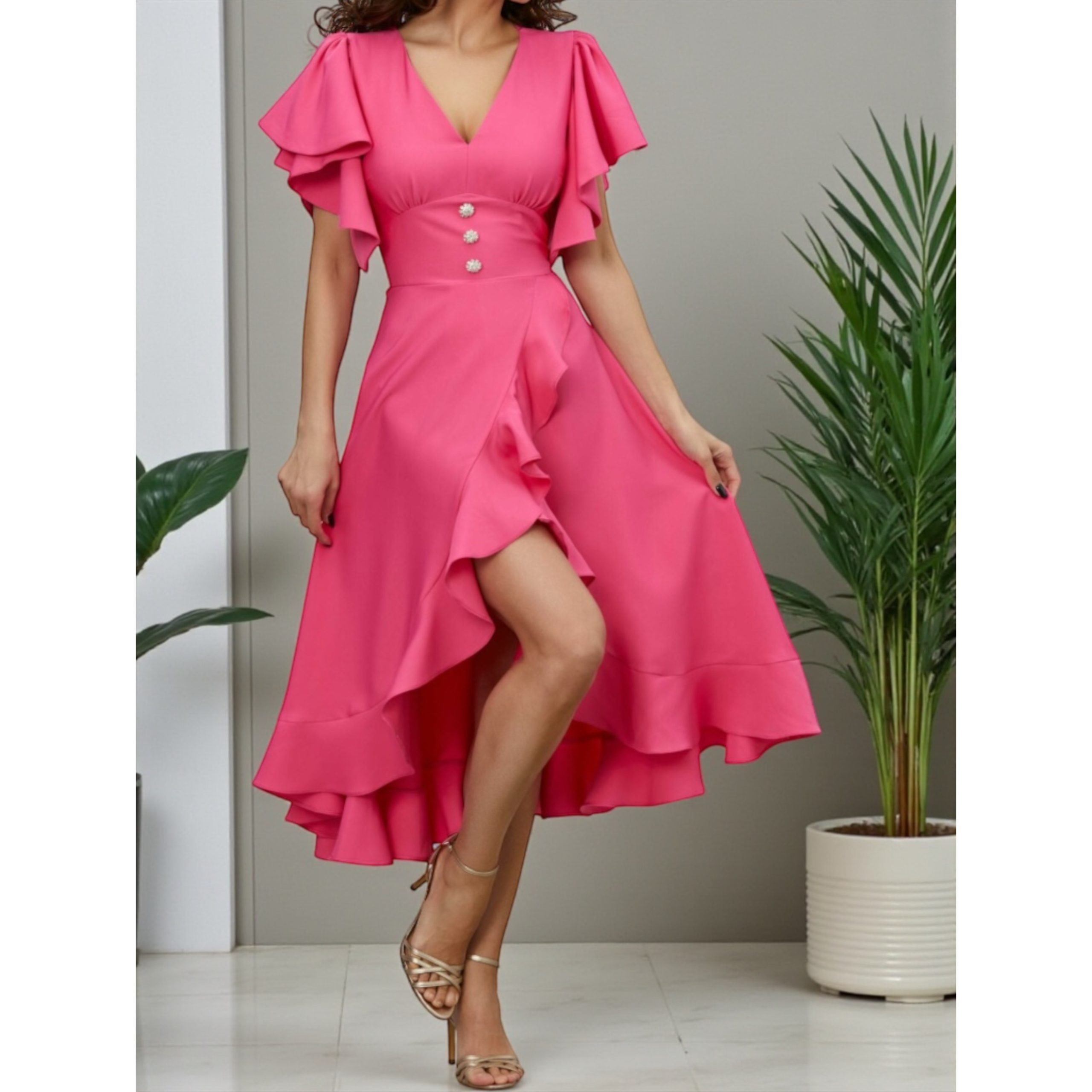 Rochia este confectionata din stofa barbie, material plin, usor elastic. Croi asimetric, accesoriul din talie nu este detasabil.