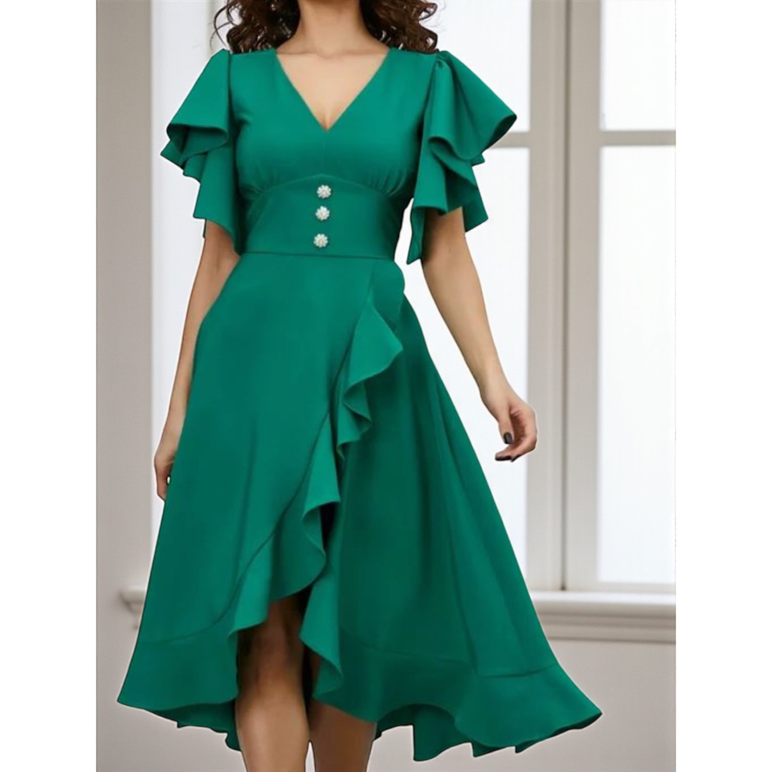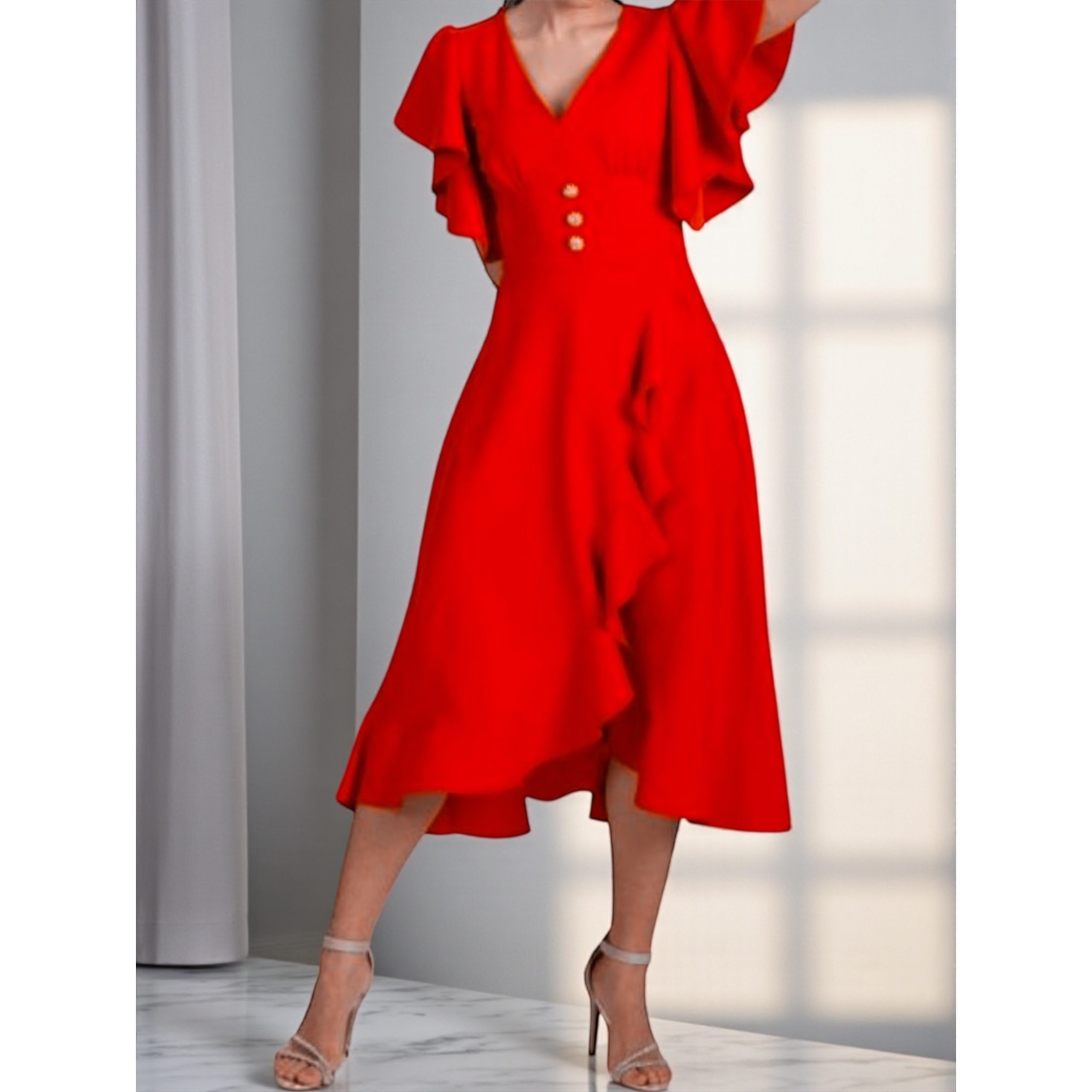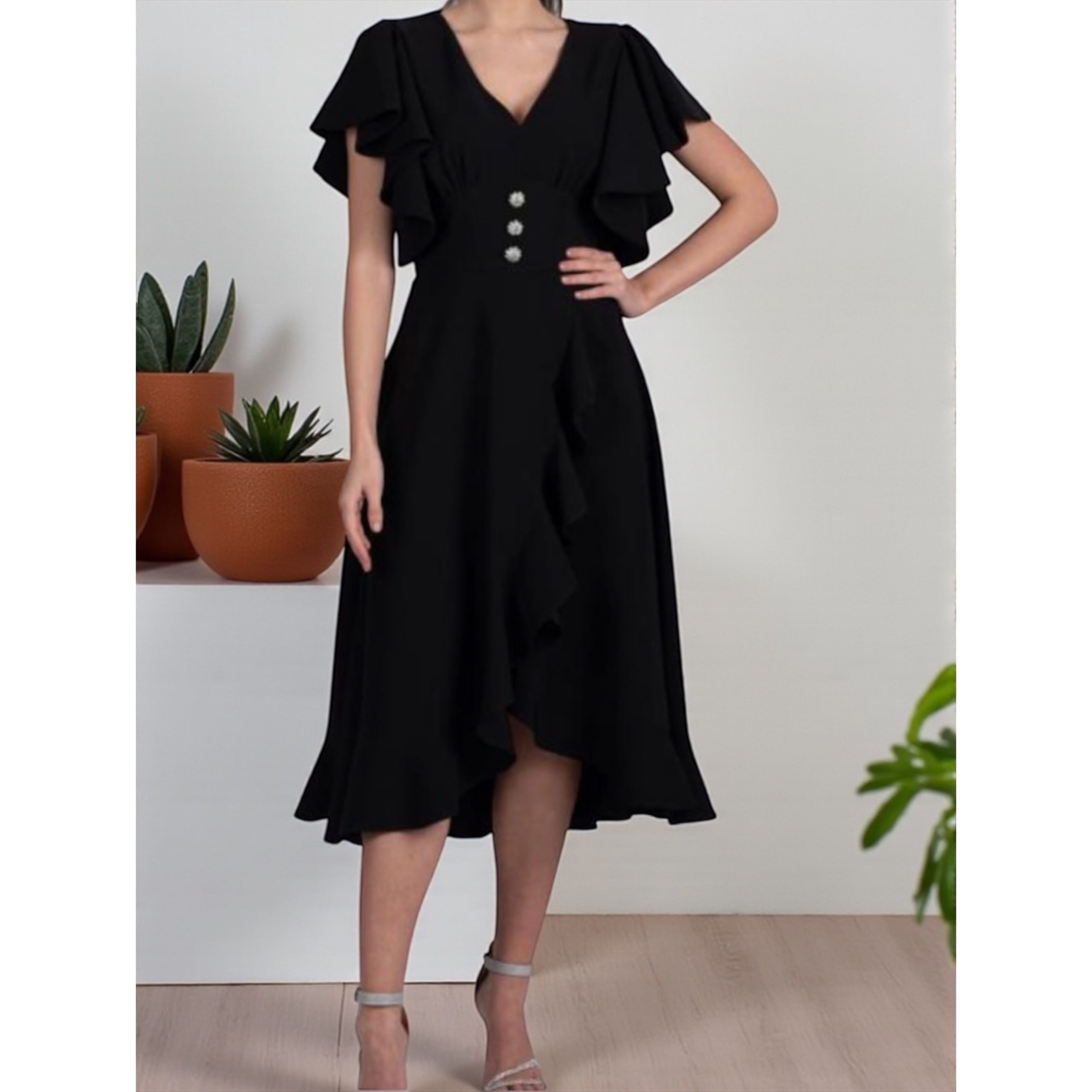 Rochia este confectionata din stofa barbie, material plin, usor elastic. Croi asimetric, accesoriul din talie nu este detasabil.