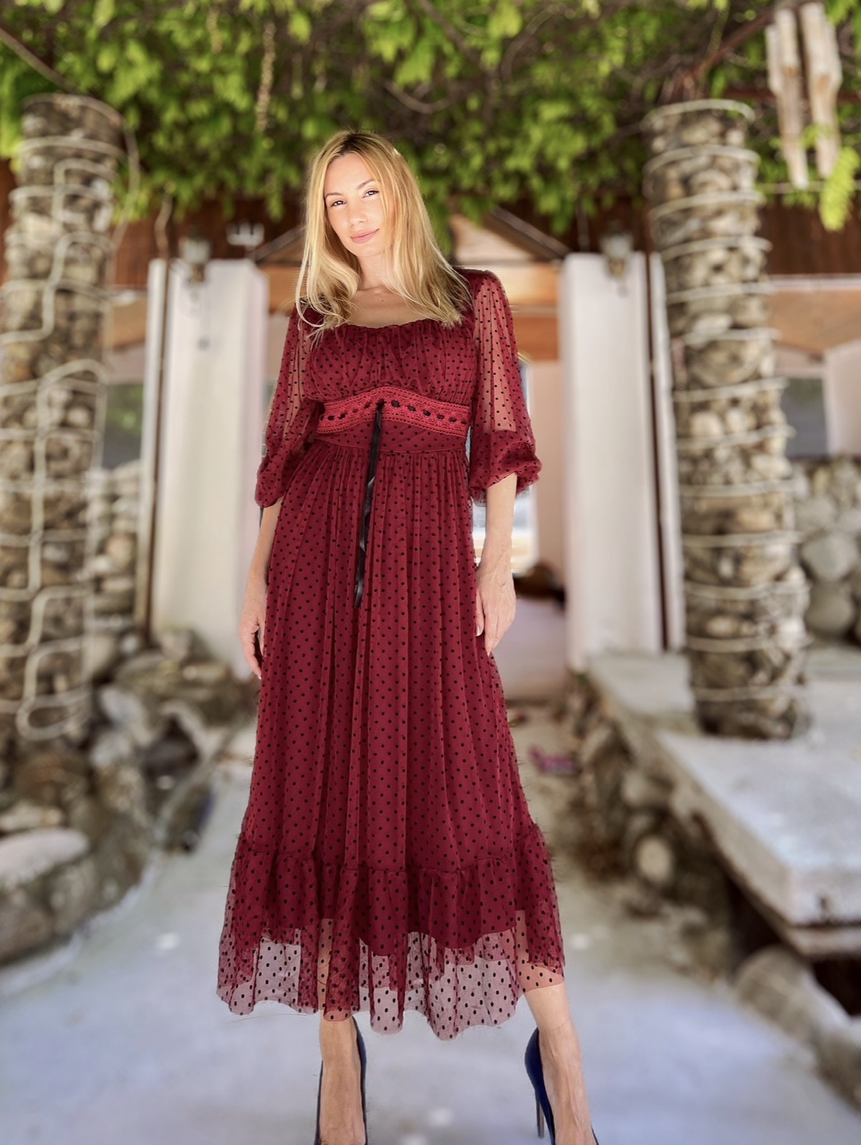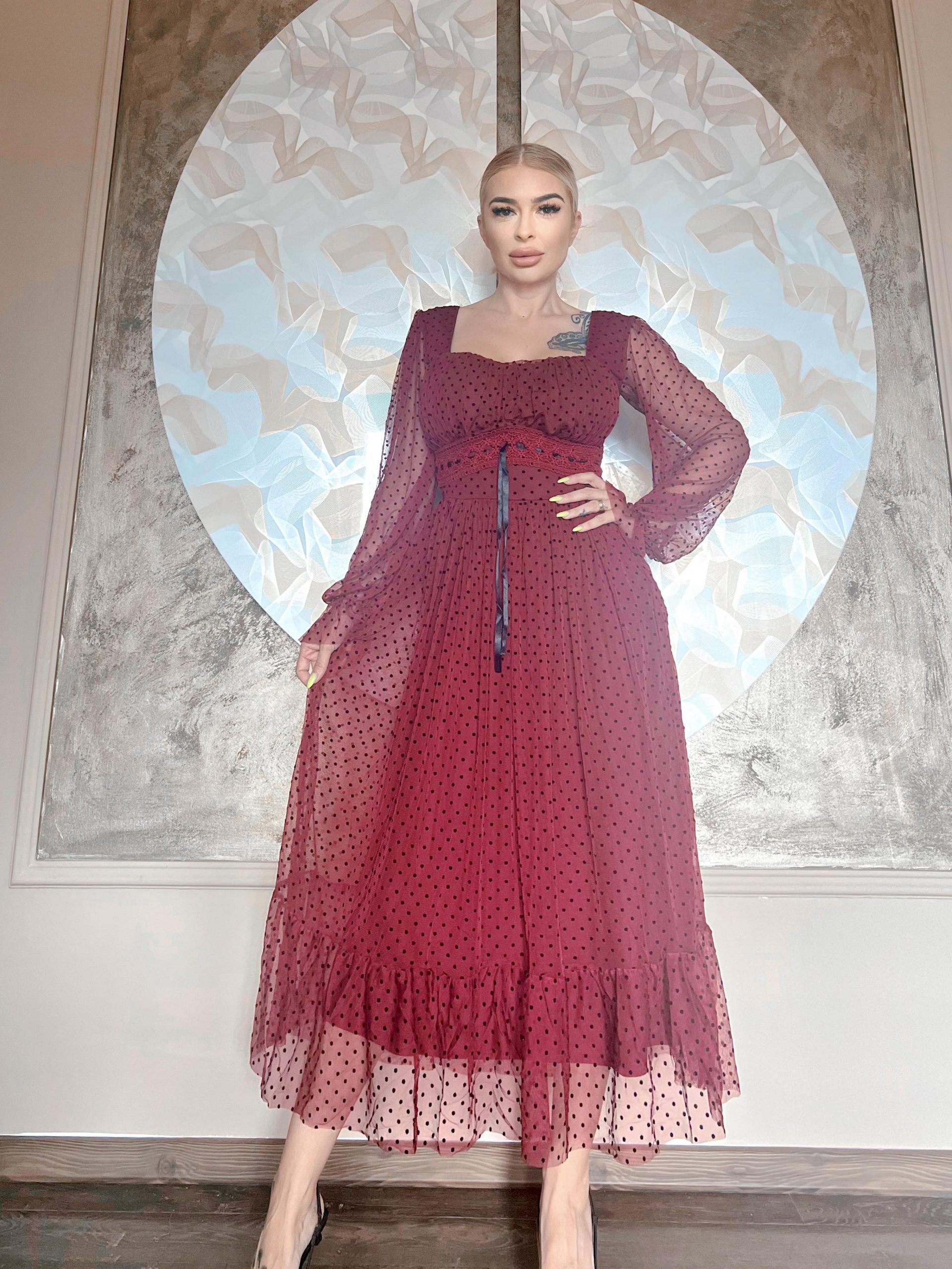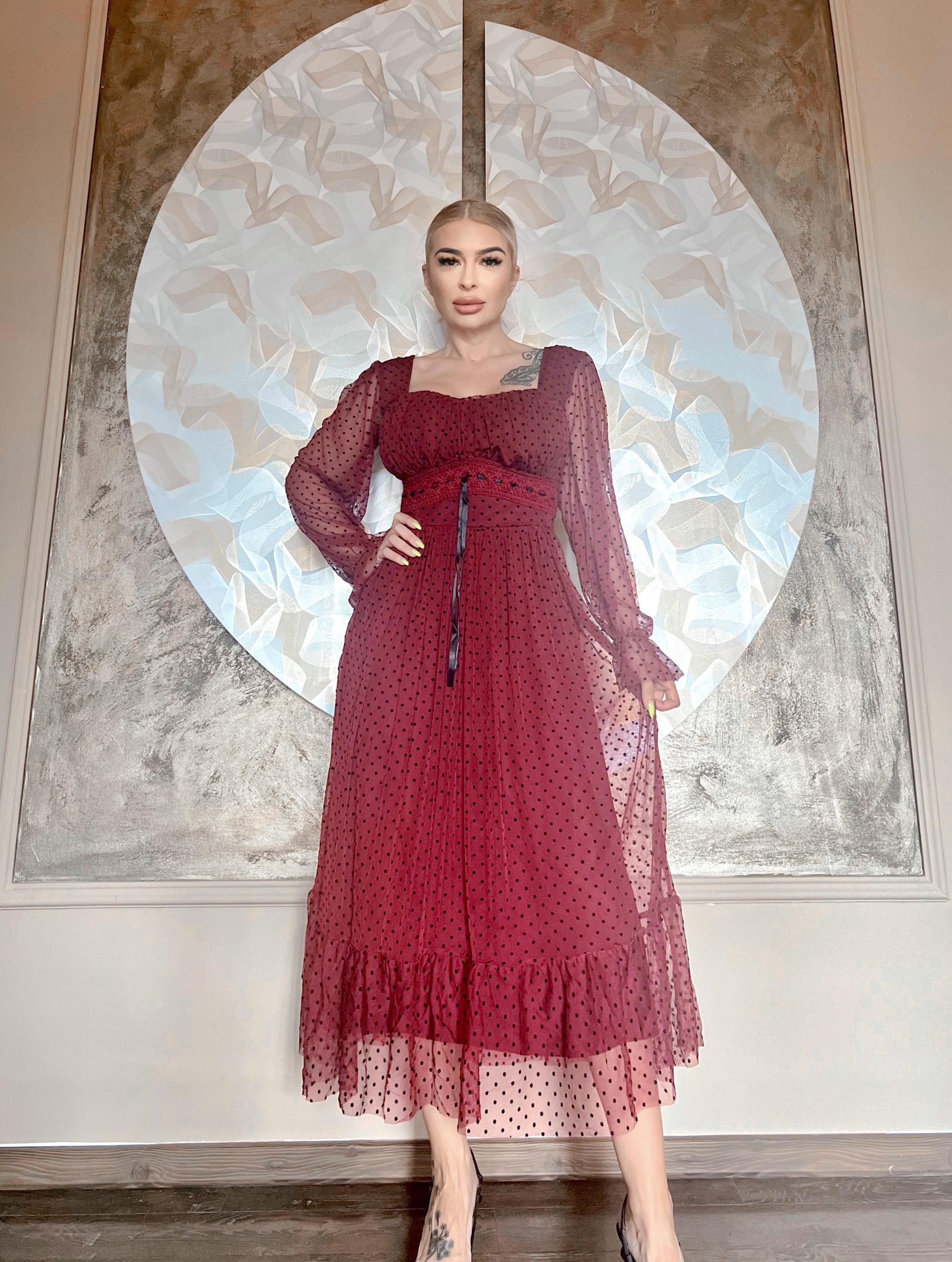 Rochia este confectionata din tulle si dublata de jupa.